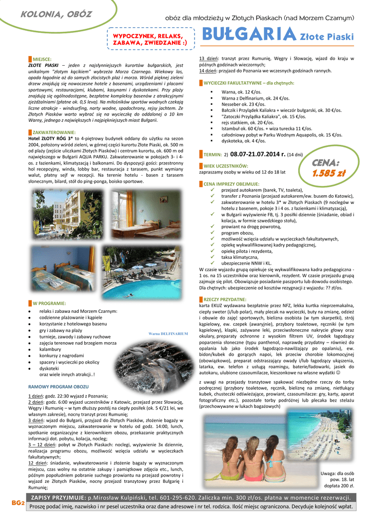 KOLONIA, OBÓZ obóz dla młodzieży w Złotych Piaskach (nad Morzem Czarnym) WYPOCZYNEK, RELAKS, ZABAWA, ZWIEDZANIE :) MIEJSCE: ZŁOTE PIASKI – jeden z najsłynniejszych kurortów bułgarskich, jest unikalnym "złotym kącikiem" wybrzeża Morza Czarnego. Wiekowy las, opada łagodnie aż do samych złocistych plaż i morza. Wśród pięknej zieleni drzew znajdują się nowoczesne hotele z basenami, urządzeniami i placami sportowymi, restauracjami, klubami, kasynami i dyskotekami. Przy plaży znajdują się ogólnodostępne, bezpłatne kompleksy basenów z atrakcyjnymi zjeżdżalniami (płatne ok. 0,5 leva). Na miłośników sportów wodnych czekają liczne atrakcje - windsurfing, narty wodne, spadochrony, rejsy jachtem. Ze Złotych Piasków warto wybrać się na wycieczkę do oddalonej o 10 km Warny, jednego z największych i najpiękniejszych miast Bułgarii. ZAKWATEROWANIE: Hotel ZŁOTY RÓG 3* to 4-piętrowy budynek oddany do użytku na sezon 2004, położony wśród zieleni, w górnej części kurortu Złote Piaski, ok. 500 m od plaży (zejście uliczkami Złotych Piasków) i centrum kurortu, ok. 600 m od największego w Bułgarii AQUA PARKU. Zakwaterowanie w pokojach 3- i 4os. z łazienkami, klimatyzacją i balkonami. Do dyspozycji gości: przestronny hol recepcyjny, winda, lobby bar, restauracja z tarasem, punkt wymiany walut, płatny sejf w recepcji. Na terenie hotelu - basen z tarasem słonecznym, bilard, stół do ping-ponga, boisko sportowe. W PROGRAMIE: relaks i zabawa nad Morzem Czarnym: codzienne plażowanie i kąpiele korzystanie z hotelowego basenu gry i zabawy na plaży turnieje, zawody i zabawy ruchowe zajęcia terenowe nad brzegiem morza kalambury konkursy z nagrodami spacery i wycieczki po okolicy dyskoteki oraz wiele innych atrakcji..! Warna DELFINARIUM RAMOWY PROGRAM OBOZU 1 dzień: godz. 22:30 wyjazd z Poznania; 2 dzień: godz. 6:00 wyjazd uczestników z Katowic, przejazd przez Słowację, Węgry i Rumunię – w tym dłuższy postój na ciepły posiłek (ok. 5 €/21 lei, we własnym zakresie), nocny tranzyt przez Rumunię; 3 dzień: wjazd do Bułgarii, przyjazd do Złotych Piasków, złożenie bagaży w wyznaczonym miejscu, zakwaterowanie w hotelu od godz. 14:00, lunch, spotkanie organizacyjne z kierownikiem obozu, przekazanie praktycznych informacji dot. pobytu, kolacja, nocleg; 3 – 12 dzień: pobyt w Złotych Piaskach: noclegi, wyżywienie 3x dziennie, realizacja programu obozu, możliwość wzięcia udziału w wycieczkach fakultatywnych; 12 dzień: śniadanie, wykwaterowanie i złożenie bagaży w wyznaczonym miejscu, czas wolny na ostatnie zakupy i pamiątkowe zdjęcia etc., lunch, późnym popołudniem pobranie suchego prowiantu na przejazd powrotny i wyjazd ze Złotych Piasków, nocny przejazd tranzytowy przez Bułgarię i Rumunię; BG2 BUŁGARIA Złote Piaski 13 dzień: tranzyt przez Rumunię, Węgry i Słowację, wjazd do kraju w późnych godzinach wieczornych; 14 dzień: przyjazd do Poznania we wczesnych godzinach rannych. WYCIECZKI FAKULTATYWNE – dla chętnych: Warna, ok. 12 €/os. Warna z Delfinarium, ok. 24 €/os. Nesseber ok. 23 €/os. Bałczik i Przylądek Kaliakra + wieczór bułgarski, ok. 30 €/os. "Zatoczki Przylądka Kaliakra", ok. 15 €/os. rejs statkiem, ok. 20 €/os. Istambuł ok. 60 €/os. + wiza turecka 11 €/os. całodniowy pobyt w Parku Wodnym Aquapolis, ok. 15 €/os. dyskoteka, ok. 4 €/os. TERMIN: 2) 08.07-21.07.2014 r. (14 dni) WIEK UCZESTNIKÓW: zapraszamy osoby w wieku od 12 do 18 lat CENA: 1.585 zł CENA IMPREZY OBEJMUJE: przejazd autokarem (barek, TV, toaleta), transfer z Poznania (przejazd autokarem/ew. busem do Katowic), zakwaterowanie w hotelu 3* w Złotych Piaskach (9 noclegów w hotelu z basenem, pokoje 3 i 4 os. z łazienkami i klimatyzacją), w Bułgarii wyżywienie FB, tj. 3 posiłki dziennie (śniadanie, obiad i kolacja, w formie szwedzkiego stołu), prowiant na drogę powrotną, program obozu, możliwość wzięcia udziału w wycieczkach fakultatywnych, opiekę wykwalifikowanej kadry pedagogicznej, opiekę pilota i rezydenta, taksa klimatyczna, ubezpieczenie NNW i KL. W czasie wyjazdu grupą opiekuje się wykwalifikowana kadra pedagogiczna 1 os. na 15 uczestników oraz kierownik, rezydent. W czasie przejazdu grupą zajmuje się pilot. Obowiązuje posiadanie paszportu lub dowodu osobistego. Dla chętnych: ubezpieczenie od kosztów rezygnacji z wyjazdu: ?? zł/os. RZECZY PRZYDATNE: karta EKUZ wydawana bezpłatnie przez NFZ, lekka kurtka nieprzemakalna, ciepły sweter (i/lub polar), mały plecak na wycieczki, buty na zmianę, odzież i obuwie do zajęć sportowych, bielizna osobista (w tym skarpetki), strój kąpielowy, ew. czepek (awaryjnie), przybory toaletowe, ręczniki (w tym kąpielowy), klapki, zażywane leki, przeciwsłoneczne nakrycie głowy oraz okulary, preparaty ochronne z wysokim filtrem UV, środek łagodzący poparzenia słoneczne (typu panthenol, naprawdę przydatny – również do opalania lub jako środek łagodząco-nawilżający po opalaniu), ew. bidon/kubek do gorących napoi, lek przeciw chorobie lokomocyjnej (obowiązkowo), preparat odstraszający owady i/lub łagodzący ukąszenia, latarka, ew. telefon z usługą roamingu, baterie/ładowarki, jasiek do autokaru, ulubione czasoumilacze, kieszonkowe na własne wydatki z uwagi na przejazdy tranzytowe spakować niezbędne rzeczy do torby podręcznej (przybory toaletowe, ręcznik, bieliznę na zmianę, nietłukący kubek, chusteczki odświeżające, prowiant, czasoumilacze: gry, karty, aparat fotograficzny etc.), pozostałe torby podróżnej lub plecaka bez stelażu (przechowywane w lukach bagażowych) Uwaga: dla osób pow. 18. lat dopłata 200 zł. ZAPISY PRZYJMUJE: p.Mirosław Kulpiński, tel. 601-295-620. Zaliczka min. 300 zł/os. płatna w momencie rezerwacji. Proszę podać imię, nazwisko i nr pesel uczestnika oraz dane adresowe i nr tel. rodzica. Ilość miejsc ograniczona. Decyduje kolejność wpłat.