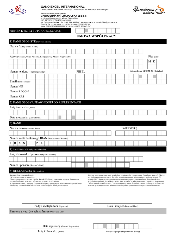 GANO EXCEL INTERNATIONAL Level 6, Menara BDB, No 88, Lebuhraya Darulaman, 05100 Alor Star, Kedah. Malaysia. Reprezentowana przez Spółkę - GANODERMA NATURA POLSKA Sp.z o.o. ul.1 Dywizji Pancernej 45 , 43-300 Bielsko-Biała NIP: 5472078147 REGON: 240759868 tel. (+48) 033- 4985900 , fax. (+48) 033- 4985901, www.ganoexcel.pl, email:[email protected] PKO BP SA, numer konta : 23 1020 1390 0000 650202156784 IBAN: PL23102013900000650202156784, SWIFT: BPKOPLPW NUMER DYSTRYBUTORA (Distributor's Code) UMOWA WSPÓŁPRACY 1) DANE OSOBISTE (Personal Details) Nazwa firmy (Name of firm) Adres (Address), Ulica, Nr.domu, Kod pocztowy, Miasto, Województwo Płeć (Sex) M K Numer telefonu (Telephone number) PESEL Data urodzenia DD-MM-RR (Birthdate) Email (Email address) Numer NIP Numer REGON Numer KRS 2) DANE OSOBY UPRAWNIONEJ DO REPREZENTACJI Imię i nazwisko (Name) Data urodzenia (Date of Birth) 3) BANK Nazwa banku (Name of Bank) SWIFT (BIC) Numer konta bankowego IBAN (Bank Account Number) I B A N P L 4) DANE SPONSORA (Sponsor's Details) Imię i Nazwisko Sponsora (Sponsor's Name) Numer Sponsora (Sponsor's Code) 5) DEKLARACJA (Declaration) Swoim podpisem potwierdzam że: 1.Wszystkie ww.dane są prawdziwe. 2.Doręczono mi kodeks etyczny, Ogólne Warunki Współpracy, zapoznałem się z tymi dokumentami, zrozumiałem/łam ich treść oraz zobowiązuję się do ich przestrzegania. 3. Zapoznałem/am się z ogólnymi Zasadami Współpracy opisanymi na tylnej stronie niniejszej Umowy Współpracy, zrozumiałem/am ich treść oraz zobowiązuję się do ich przestrzegania. Podpis dystrybutora (Signature) Wyrażam zgodę na przetwarzanie moich danych osobowych w systemie firmy Ganoderma Natura Polska Sp.z o.o. będąca administratorem tych danych w rozumieniu ustawy o ochronie danych osobowych z dnia 29 sierpnia 1997 r. Dane przetwarzane będą przez administratora w celu prowadzenia działań marketingu bezpośredniego własnych produktów i usług. Dane mogą być przekazywane firmie Gano Excel International . Podanie danych jest dobrowolne. Przysługuje Państwu prawo do wglądu i zmianę tych danych. Jednocześnie wyrażam zgodę na przesyłanie informacji handlowych na wymienione adresy pocztowe i elektroniczne. Data i miejsce (Date and Place) Firmowe uwagi (wypełnia firma) (Office Use Only) Data rejestracji (Date of Registration) Imię i Nazwisko (Name) Pieczątka i podpis (Signature and Stamp) Zasady WSPÓŁPRACY 1.Postanowienia ogólne – zasady Uczestnik sieci – to osoba, która podpisała Umowę współpracy w celu nabywania produktów GANO EXCEL INTERNATIONAL do konsumpcji własnej lub odsprzedaży. GANO EXCEL INTERNATIONAL (zwana dalej „GE“), przez wzgląd na cele i wartości realizowane w ramach prowadzonej działalności z zakresu marketingu bezpośredniego, stworzyła Kodeks Etyczny, którego przestrzeganie stanowi podstawę współpracy Uczestnika sieci i GE. Naruszenie któregokolwiek z postanowień Kodeksu Etycznego, stanowi podstawę do rozwiązania umowy współpracy przez GE ze skutkiem natychmiastowym. Jeżeli w umowie nie jest inaczej wskazane, to wszelkie zobowiązania i uprawnienia GE dotyczą tylko i wyłącznie GANO EXCEL INTERNATIONAL. Ganoderma Natura Polska Sp. z o.o. (zwana dalej „GN PL”) jest podmiotem praw i obowiązków tylko w przypadku wyraźnego wskazania w umowie. Pojęcia użyte w niniejszej umowie powinny być interpretowane wyłącznie w sposób wynikający z treści i celów niniejszej umowy. Uczestnik sieci zobowiązuje się do zachowania w tajemnicy wszystkich informacji – w formie pisemnej, ustnej i elektronicznej – uzyskanych bezpośrednio lub pośrednio w związku lub przy okazji współpracy z GE. Dotyczy to w szczególności danych dotyczących struktury organizacyjnej, strategii, wszelkich aspektów działalności oraz innych szczegółów dotyczących GE. Obowiązek zachowania tajemnicy trwa również przez okres dwóch lat od dnia rozwiązania umowy. 2. Zasady Kodeksu Etycznego: Uczestnik sieci wykonując czynności związane z realizacją niniejszej umowy zobowiązany jest zachować należytą staranność i rzetelność. Uczestnik sieci nie może udzielać żadnych informacji na temat działalności i produktów GE, poza informacjami udzielanymi w związku z prezentacją planu marketingowego, osobom trzecim bez pisemnej zgody osób upoważnionych (wskazaną przez firmę GN PL). Uczestnikowi nie wolno wyrażać publicznie opinii i zajmować stanowisk sprzecznych ze stanowiskiem GE. Prezentacja planu marketingowego powinna opierać się wyłącznie o materiały firmowe i być przeprowadzona zgodnie z ogólnymi wytycznymi GE. Uczestnikowi sieci nie wolno wyrażać żadnych opinii na temat produktów lub sposobów działania firm konkurencyjnych. Uczestnikowi sieci nie wolno podejmować żadnych czynności zmierzających bezpośrednio lub pośrednio do wyrządzenia szkody GE lub innemu niezależnemu Uczestnikowi. Zakazane jest wykorzystywanie wszelkich informacji handlowych, a w szczególności informacji na temat działalności GE, materiałów szkoleniowych, dokumentów i akcesoriów ze znakiem towarowym GE itp., do prowadzenia innej działalności gospodarczej. Uczestnik sieci powinien dołożyć wszelkich możliwych starań, aby obsługa klientów wykonywana była według najwyższych standardów. 3. Warunki podjęcia i realizowania współpracy. Uczestnikami sieci mogą być osoby, które ukończyły 18 lat i posiadają pełną zdolność do czynności prawnych. Uczestnicy sieci nabywają towary do konsumpcji własnej lub w celu ich dalszej odsprzedaży. Osoba ubiegająca się o status Uczestnika sieci, przed podpisaniem umowy musi zostać zarekomendowana przez aktualnego Uczestnika sieci GE, który z momentem podpisania umowy przez osobę ubiegającą się, staje się jej „Sponsorem”. Osoba ubiegając się o status Uczestnika sieci, z chwilą podpisania umowy, zobowiązana jest do poniesienia kosztów rejestracji w wysokości określonej