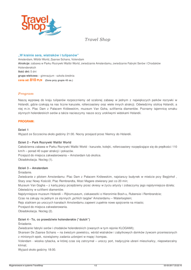 Travel Shop „W krainie sera, wiatraków i tulipanów” Amsterdam, Wiblbi World, Zaanse Schans, Volendam Atrakcje: zabawa w Parku Rozrywki Walibi World, zwiedzanie Amsterdamu, zwiedzanie Fabryki Serów i Chodaków Holenderskich ilość dni: 5 dni grupa wiekowa: - gimnazjum - szkoła średnia cena od: 810 PLN (Cena przy grupie 45 os.) Program Naszą wyprawę do kraju tulipanów rozpoczniemy od szalonej zabawy w jednym z największych parków rozrywki w Holandii, gdzie czekają na nas liczne karuzele, rollercoastery oraz wiele innych atrakcji. Odwiedzimy stolicę Holandii, a niej m.in. Plac Dam z Pałacem Królewskim, muzeum Van Goha, szlifiernia diamentów. Poznamy tajemnicę smaku słynnych holenderskich serów a także nacieszymy nasze oczy urokliwymi widokami Holandii. PROGRAM: Dzień 1 Wyjazd ze Szczecina około godziny 21:00. Nocny przejazd przez Niemcy do Holandii. Dzień 2 – Park Rozrywki Walibi World Całodzienna zabawa w Parku Rozrywki Walibi World - karuzele, kolejki, rollercoastery rozpędzające się do prędkości 110 km/h – ponad 40 super atrakcji i pokazów. Przejazd do miejsca zakwaterowania – Amsterdam lub okolice. Obiadokolacja. Nocleg (1). Dzień 3 – Amsterdam Śniadanie. Zwiedzanie z pilotem Amsterdamu: Plac Dam z Pałacem Królewskim, najstarszy budynek w mieście przy Begijnhof , Stary oraz Nowy Kościół, Plac Rembrandta, Most Magere otwierany jest co 20 min; Muzeum Van Gogha – z kartą pracy przejdziemy przez okresy w życiu artysty i zobaczymy jego najsłynniejsze dzieła; Odwiedziny w szlifierni diamentów. Najsłynniejsze muzeum Holandii – Rijksmuseum, ciekawostki o Hieronimie Bosh-u, Rubensie i Rembrandcie; Czas na zakupy na jednym ze słynnych „pchlich targów” Amsterdamu – Waterlooplein; Rejs statkiem po uroczych kanałach Amsterdamu zapewni zupełnie nowe spojrzenie na miasto; Przejazd do miejsca zakwaterowania. Obiadokolacja. Nocleg (2). Dzień 4 - To, co prawdziwie holenderskie (“dutch”) Śniadanie. Zwiedzanie fabryki serów i chodaków holenderskich (zwanych w tym rejonie KLOGAMI); Skansen De Zaanse Schans – na świeżym powietrzu, wśród wiatraków i zabytkowych domków żywcem przeniesionych z minionych epok, rozwiążemy zadania uzbrojeni w mapę i kompas. Volendam - wioska rybacka, w której czas się zatrzymał – uroczy port, tradycyjnie ubrani mieszkańcy, niepowtarzalny klimat; Wyjazd około godziny 18:00. Wygenerowane w systemie TravelShop 1/2 03-03-2017 23:22:10 Dzień 5 Przyjazd do Polski w godzinach porannych (ok. godziny 6-7:00). Cena zawiera Transport, 2 śniadania, 2 obiadokolacje, 2 noclegi (w hostelu lub pensjonacie, pokoje wieloosobowe, łazienki na korytarzu), realizację programu, opiekę i komentarz pilota Travel Shop, realizację zwiedzania Muzeum Van Gogha, Rijksmuseum, fabryki serów, miejsca gratis dla 4 Opiekunów (przy 45 uczestnikach), ubezpieczenie NNW i KL, podatek VAT. Cena nie zawiera: biletów wstępu do atrakcji turystycznych, ok. 35 €/os. Opcje dodatkowe: obiad w Walibi World + ok. 8 €/os., obiad w dniu 4 + 15€/os Dodatkowe informacje Wygenerowane w systemie TravelShop 2/2 03-03-2017 23:22:10