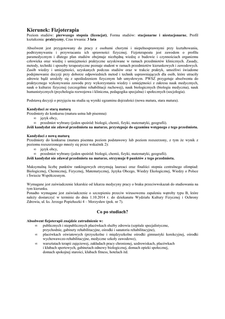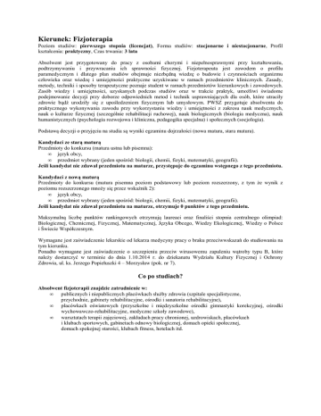 Kierunek: Fizjoterapia Poziom studiów: pierwszego stopnia (licencjat), Forma studiów: stacjonarne i niestacjonarne, Profil kształcenia: praktyczny, Czas trwania: 3 lata Absolwent jest przygotowany do pracy z osobami chorymi i niepełnosprawnymi przy kształtowaniu, podtrzymywaniu i przywracaniu ich sprawności fizycznej. Fizjoterapeuta jest zawodem o profilu paramedycznym i dlatego plan studiów obejmuje niezbędną wiedzę o budowie i czynnościach organizmu człowieka oraz wiedzę i umiejętności praktyczne uzyskiwane w ramach przedmiotów klinicznych. Zasady, metody, techniki i sposoby terapeutyczne poznaje student w ramach przedmiotów kierunkowych i zawodowych. Zasób wiedzy i umiejętności, uzyskanych podczas studiów oraz w trakcie praktyk, umożliwi świadome podejmowanie decyzji przy doborze odpowiednich metod i technik usprawniających dla osób, które utraciły zdrowie bądź urodziły się z upośledzeniem fizycznym lub umysłowym. PWSZ przygotuje absolwenta do praktycznego wykonywania zawodu przy wykorzystaniu wiedzy i umiejętności z zakresu nauk medycznych, nauk o kulturze fizycznej (szczególnie rehabilitacji ruchowej), nauk biologicznych (biologia medyczna), nauk humanistycznych (psychologia rozwojowa i kliniczna, pedagogika specjalna) i społecznych (socjologia). Podstawą decyzji o przyjęciu na studia są wyniki egzaminu dojrzałości (nowa matura, stara matura). Kandydaci ze starą maturą Przedmioty do konkursu (matura ustna lub pisemna): • język obcy, • przedmiot wybrany (jeden spośród: biologii, chemii, fizyki, matematyki, geografii). Jeśli kandydat nie zdawał przedmiotu na maturze, przystępuje do egzaminu wstępnego z tego przedmiotu. Kandydaci z nową maturą Przedmioty do konkursu (matura pisemna poziom podstawowy lub poziom rozszerzony, z tym że wynik z poziomu rozszerzonego mnoży się przez wskaźnik 2): • język obcy, • przedmiot wybrany (jeden spośród: biologii, chemii, fizyki, matematyki, geografii). Jeśli kandydat nie zdawał przedmiotu na maturze, otrzymuje 0 punktów z tego przedmiotu. Maksymalną liczbę punktów rankingowych otrzymują laureaci oraz finaliści stopnia centralnego olimpiad: Biologicznej, Chemicznej, Fizycznej, Matematycznej, Języka Obcego, Wiedzy Ekologicznej, Wiedzy o Polsce i Świecie Współczesnym. Wymagane jest zaświadczenie lekarskie od lekarza medycyny pracy o braku przeciwwskazań do studiowania na tym kierunku. Ponadto wymagane jest zaświadczenie o szczepieniu przeciw wirusowemu zapaleniu wątroby typu B, które należy dostarczyć w terminie do dnia 1.10.2014 r. do dziekanatu Wydziału Kultury Fizycznej i Ochrony Zdrowia, ul. ks. Jerzego Popiełuszki 4 – Morzysław (pok. nr 7). Co po studiach? Absolwent fizjoterapii znajdzie zatrudnienie w: • publicznych i niepublicznych placówkach służby zdrowia (szpitale specjalistyczne, przychodnie, gabinety rehabilitacyjne, ośrodki i sanatoria rehabilitacyjne), • placówkach oświatowych (przyszkolne i międzyszkolne ośrodki gimnastyki korekcyjnej, ośrodki wychowawczo-rehabilitacyjne, medyczne szkoły zawodowe), • warsztatach terapii zajęciowej, zakładach pracy chronionej, uzdrowiskach, placówkach i klubach sportowych, gabinetach odnowy biologicznej, domach opieki społecznej, domach spokojnej starości, klubach fitness, hotelach itd.