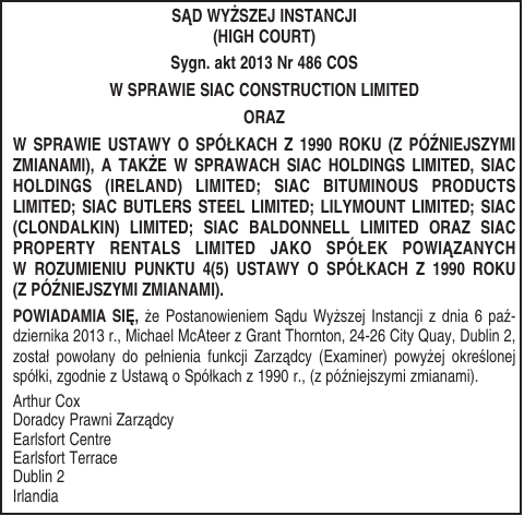 SĄD WYŻSZEJ INSTANCJI (HIGH COURT) Sygn. akt 2013 Nr 486 COS W SPRAWIE SIAC CONSTRUCTION LIMITED ORAZ W SPRAWIE USTAWY O SPÓŁKACH Z 1990 ROKU (Z PÓŹNIEJSZYMI ZMIANAMI), A TAKŻE W SPRAWACH SIAC HOLDINGS LIMITED, SIAC HOLDINGS (IRELAND) LIMITED; SIAC BITUMINOUS PRODUCTS LIMITED; SIAC BUTLERS STEEL LIMITED; LILYMOUNT LIMITED; SIAC (CLONDALKIN) LIMITED; SIAC BALDONNELL LIMITED ORAZ SIAC PROPERTY RENTALS LIMITED JAKO SPÓŁEK POWIĄZANYCH W ROZUMIENIU PUNKTU 4(5) USTAWY O SPÓŁKACH Z 1990 ROKU (Z PÓŹNIEJSZYMI ZMIANAMI). POWIADAMIA SIĘ, że Postanowieniem Sądu Wyższej Instancji z dnia 6 października 2013 r., Michael McAteer z Grant Thornton, 24-26 City Quay, Dublin 2, został powołany do pełnienia funkcji Zarządcy (Examiner) powyżej określonej spółki, zgodnie z Ustawą o Spółkach z 1990 r., (z późniejszymi zmianami). Arthur Cox Doradcy Prawni Zarządcy Earlsfort Centre Earlsfort Terrace Dublin 2 Irlandia