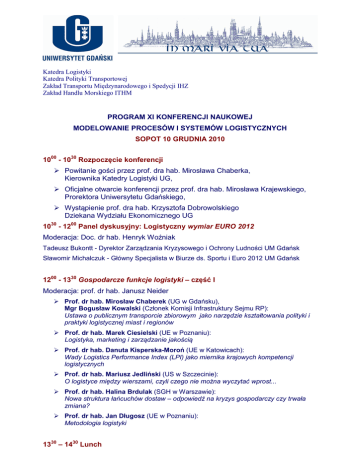 Katedra Logistyki Katedra Polityki Transportowej Zakład Transportu Międzynarodowego i Spedycji IHZ Zakład Handlu Morskiego ITHM PROGRAM XI KONFERENCJI NAUKOWEJ MODELOWANIE PROCESÓW I SYSTEMÓW LOGISTYCZNYCH SOPOT 10 GRUDNIA 2010 1000 - 1030 Rozpoczęcie konferencji Powitanie gości przez prof. dra hab. Mirosława Chaberka, Kierownika Katedry Logistyki UG, Oficjalne otwarcie konferencji przez prof. dra hab. Mirosława Krajewskiego, Prorektora Uniwersytetu Gdańskiego, Wystąpienie prof. dra hab. Krzysztofa Dobrowolskiego Dziekana Wydziału Ekonomicznego UG 1030 - 1200 Panel dyskusyjny: Logistyczny wymiar EURO 2012 Moderacja: Doc. dr hab. Henryk Woźniak Tadeusz Bukontt - Dyrektor Zarządzania Kryzysowego i Ochrony Ludności UM Gdańsk Sławomir Michalczuk - Główny Specjalista w Biurze ds. Sportu i Euro 2012 UM Gdańsk 1200 - 1330 Gospodarcze funkcje logistyki – część I Moderacja: prof. dr hab. Janusz Neider Prof. dr hab. Mirosław Chaberek (UG w Gdańsku), Mgr Bogusław Kowalski (Członek Komisji Infrastruktury Sejmu RP): Ustawa o publicznym transporcie zbiorowym jako narzędzie kształtowania polityki i praktyki logistycznej miast i regionów Prof. dr hab. Marek Ciesielski (UE w Poznaniu): Logistyka, marketing i zarządzanie jakością Prof. dr hab. Danuta Kisperska-Moroń (UE w Katowicach): Wady Logistics Performance Index (LPI) jako miernika krajowych kompetencji logistycznych Prof. dr hab. Mariusz Jedliński (US w Szczecinie): O logistyce między wierszami, czyli czego nie można wyczytać wprost... Prof. dr hab. Halina Brdulak (SGH w Warszawie): Nowa struktura łańcuchów dostaw – odpowiedź na kryzys gospodarczy czy trwała zmiana? Prof. dr hab. Jan Długosz (UE w Poznaniu): Metodologia logistyki 1330 – 1430 Lunch 1430 – 1630 Gospodarcze funkcje logistyki – część II Moderacja: Prof. dr hab. Zdzisław Kordel Wiesław Staniuk (STANMET Sp. z o.o. – Zdobywca I Nagrody PTL 2010): Bezpieczeństwo w procesach logistycznych na przykładzie systemu QRS Dr hab. Joanna Bruzda (UMK w Toruniu): Prognozy falkowe w logistyce Prof. dr hab. Zdzisław Kordel (UG w Gdańsku): Koszty transportu jako ogniwo kosztu logistycznego Dr inż. Janusz Łacny (International Road Transport Union): Współczesne koncepcje globalnego bezpieczeństwa w międzynarodowych łańcuchach logistycznych Dr inż. Ireneusz Fechner, dr inż. Stanisław Krzyżaniak, mgr inż. Marcin Hajdul (ILiM, WSL w Poznaniu): Model centrum logistycznego, jako elementu intermodalnej sieci logistycznej Dr Iwona Sobczak (UMK w Toruniu): Usprawnianie logistyki w placówce opieki medycznej. Dr inż. kmdr Tomasz Kochański (Ministerstwo Obrony Narodowej): Migracja inteligencji w sieci – strategie pozyskiwania wiedzy przez systemy logistyczne firm Dr Jacek Kurowski (AON w Warszawie, WSSZiP w Łodzi): Bezpieczeństwo jako niedoceniany czynnik optymalizacji łańcuchów dostaw Dr Grażyna Karwacka (UG w Gdańsku): Logistyczne aspekty teorii lokalizacji Tomasz Janiak (ILiM w Poznaniu): Najlepsze praktyki w logistyce na przykładzie międzynarodowego projektu CASTLE Mgr Jagoda Jakubowska (UMK w Toruniu): Logistyka jako narzędzie poprawy konkurencyjności przedsiębiorstw Mgr Andrzej Rzeczycki (US w Szczecinie): Nowa era kolonialna - logistyczny wymiar przeobrażeń w gospodarczej mapie świata Mgr Adam Domaradzki (WSB w Toruniu, doktorant UE w Poznaniu): Szanse i zagrożenia polskiej agrologistyki Mgr Adam Bogusz (PGiNG Pomorski Oddział Obrotu Gazem): Paliwo gazowe - realizacja procesu magazynowania i dostawy w świetle przepisów Unii Europejskiej Mgr Michał Czerwiec (ELSE Sp. J.): Magazyn 3D – analiza i optymalizacja połączona z wizualizacją Konrad Michalski (Centrum Logistyki Poczty Polskiej): Wyzwania nowoczesnej logistyki przedsiębiorstwa pocztowego Dr Blanka Tundys (US w Szczecinie): Zastosowanie "zielonych" procesów w kontekście zwiększania konkurencyjności sieci dostaw Mgr Anna Trzuskawska-Grzesińska (UG w Gdańsku): Rozwój systemów informatycznych jako odpowiedź potrzeby sieci łańcuchów dostaw Dr Cezary Mańkowski (UG w Gdańsku): Ceny transferowe logistycznych centrów odpowiedzialności Dr Andrzej Jezierski (UG w Gdańsku): Próba systematyzacji wartości w logistyce Dr Leszek Reszka (UG w Gdańsku): Optymalizacja terminarza wymiany sprzętu jako zadanie logistyczne 1630 - 1700 Dyskusja i uroczyste zamknięcie konferencji