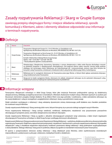 Zasady rozpatrywania Reklamacji i Skarg w Grupie Europa zawierają przepisy obejmujące formy i miejsce składania reklamacji, sposób komunikacji z Klientami, zakres i elementy składowe odpowiedzi oraz informacje o terminach rozpatrywania. Definicje Lp. Nazwa Znaczenie Towarzystwo Ubezpieczeń Europa S.A., 53-413 Wrocław, ul. Gwiaździsta nr 62 Sąd Rejonowy dla Wrocławia Fabryczna we Wrocławiu, KRS 0000002736, NIP 895 10 07 276, 1 Grupa Europa Towarzystwo Ubezpieczeń na Życie Europa S.A., 53-413 Wrocław, ul. Gwiaździsta nr 62 Sąd Rejonowy dla Wrocławia Fabryczna we Wrocławiu, KRS 0000092396, NIP 895 17 65 137, Kontakt: Infolinia Biuro Obsługi Klienta Grupy Europa Telefon +48 71 36 92 887** lub 0 801 500 300 **Koszt połączenia zgodnie z taryfą operatora. 2 Klient Ubezpieczający, Ubezpieczony, Uprawniony, Uposażony z umowy ubezpieczenia a także osoba fizyczna dochodząca roszczeń na podstawie przepisów o ubezpieczeniach obowiązkowych. Pod pojęciem Klienta należy rozumieć również każdy podmiot składający lub zamierzający złożyć Reklamację, tak indywidualnego jak i instytucjonalnego, zarówno tego który korzysta lub korzystał z usług Towarzystwa, wnioskował o świadczenie takich usług lub był odbiorcą jego oferty marketingowej. 3 Reklamacja Reklamacja jest to wystąpienie skierowane do Towarzystwa przez jego Klienta, w którym klient zgłasza zastrzeżenia dotyczące usług świadczonych przez Towarzystwo 4 Skarga Skarga jest to każde wystąpienie klienta, skierowane do zakładu ubezpieczeń odnoszące się do zastrzeżeń dotyczących usług świadczonych przez tę instytucję lub wykonywanej przez nią działalności Informacje wstępne Towarzystwa Ubezpieczeń wchodzące w skład Grupy Europa, które jako instytucje finansowe profesjonalnie zajmują się działalnością ubezpieczeniową, dokładają szczególnej staranności w kontaktach z Klientami. Budowanie trwałych relacji z Klientami opartych na zaufaniu jest kluczowym elementem przyjętej strategii działania. W jej efekcie Klient oraz jego potrzeby i oczekiwania, a także zastrzeżenia odnoszące się do naszej działalności i usług ze szczególnym uwzględnieniem reklamacji i skarg, są przedmiotem naszej uwagi. Dzięki wnioskom wynikającym z reklamacji i skarg wdrażamy dynamicznie zmiany dostosowując profil działania oraz charakter produktów do oczekiwań naszych Klientów. Zasady rozpatrywania Reklamacji i Skarg zawierają zbiór norm, którymi kierujemy się w procesie obsługi wystąpień naszych Klientów. Proces rozpatrywania Reklamacji i Skarg cechuje rzetelność, wnikliwość, obiektywizm, niezależność oraz poszanowanie powszechnie obowiązujących przepisów prawa, warunków ubezpieczenia oraz dobrych obyczajów. Zasady rozpatrywania Reklamacji i Skarg są zgodne z aktualnie obowiązującymi przepisami rangi ustawowej, a także innymi regulacjami obowiązującymi Towarzystwa wchodzące w skład Grupy Europa i podlegają okresowym aktualizacjom. Rozpatrywanie Reklamacji i Skarg prowadzone jest przez Departament Obsługi Reklamacji – wydzieloną, dedykowaną tylko temu obszarowi jednostkę organizacyjną Towarzystw. Dzięki temu zapewniona jest przejrzystość, niezależność i bezstronność w procesie rozpatrywania reklamacji. W przypadku ubezpieczeń i usług o charakterze eksperckim dopuszczamy możliwość powierzenia obsługi reklamacji i skarg podmiotom wyspecjalizowanym w danej dziedzinie. Obsługa reklamacji i skarg przez te podmioty odbywa się zgodnie ze standardami stosowanymi przez Towarzystwa. W oparciu o przeprowadzane okresowo analizy reklamacji i skarg składanych przez Klientów, celem wyeliminowania stwierdzonych nieprawidłowości, podejmowane są decyzje o dokonaniu niezbędnych korekt w działalności. Towarzystwo Ubezpieczeń Europa S.A. Towarzystwo Ubezpieczeń na Życie Europa S.A. ul. Gwiaździsta 62 53-413 Wrocław [email protected] www.tueuropa.pl tel. 71 36 92 887, fax 71 36 92 707 Biuro Obsługi Klienta 801 500 300 (dla telefonów stacjonarnych) lub 71 36 92 887 (dla telefonów kom.) koszt połączenia zgodny z taryfą operatora TU Europa S.A. Sąd Rejonowy dla Wrocławia-Fabrycznej we Wrocławiu, KRS 0000002736 NIP 895-10-07-276, kapitał zakładowy zarejestrowany i opłacony 37 800 000 zł TU na Życie Europa S.A. Sąd Rejonowy dla Wrocławia-Fabrycznej we Wrocławiu, KRS 0000092396 NIP 895-17-65-137, kapitał zakładowy zarejestrowany i opłacony 307 200 000 zł 1 Przyjmowanie reklamacji Grupa Europa nie stwarza ograniczeń dotyczących terminów składania reklamacji i skarg. Jedyny wymóg dotyczący takich wystąpień, poza opisaniem przyczyny, dotyczy podania przez Klienta danych pozwalających na identyfikację jego sprawy oraz prowadzenie dalszego kontaktu i korespondencji. W tym celu wystarczające jest podanie podstawowych danych takich jak: imię i nazwisko, numer sprawy – służących identyfikacji oraz adresu korespondencyjnego, numeru telefonu, adresu e – mail – służących do kontaktu. Niezwłoczne zgłoszenie reklamacji przez Klienta oraz załączenie stosownych dokumentów wpływa na przyśpieszenie procesu obsługi. Na życzenie Klienta dokonujemy potwierdzenia przyjścia wystąpienia w formie przez niego wskazanej. Reklamacje i skargi mogą być zgłaszane do Departamentu Obsługi Reklamacji: pisemnie, z wykorzystaniem aplikacji zamieszczonej na stronie internetowej www.tueuropa.pl – Centrum Obsługi Klienta osobiście, ustnie w centrali Grupy Europa lub w Biurze Regionalnym, w których udostępnione są formularze ułatwiające złożenie reklamacji telefonicznie pod numerami infolinii Grupy Europa Klienci mogą składać reklamacje i skargi osobiście lub działając za pośrednictwem pełnomocnika na podstawie stosownego pełnomocnictwa. Towarzystwa Grupy Europa rozpatrują również reklamacje i skargi dotyczące działań podmiotów z nim współpracujących, wykonujących zlecone czynności na podstawi