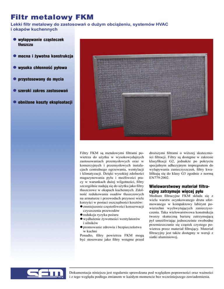 Filtr metalowy FKM Lekki filtr metalowy do zastosowań o dużym obciążeniu, systemów HVAC i okapów kuchennych wyłapywanie cząsteczek tłuszczu mocna i żywotna konstrukcja wysoka chłonność pyłowa przystosowany do mycia szeroki zakres zastosowań obniżone koszty eksploatacji Filtry FKM są metalowymi filtrami powietrza do użytku w wysokowydajnych zastosowaniach przemysłowych oraz w komercyjnych i przemysłowych instalacjach centralnego ogrzewania, wentylacji i klimatyzacji. Dzięki wysokiej zdolności magazynowania pyłu i możliwości pracy w warunkach dużej wilgotności, filtry szczególnie nadają się do użytku jako filtry tłuszczowe w okapach kuchennych. Zdolność redukowania osadów tłuszczowych na armaturze i przewodach przynosi wiele korzyści w postaci oszczędności kosztów: zmniejszenie częstotliwości konserwacji czyszczenia przewodów redukcja ryzyka pożaru wydłużenie żywotności wentylatorów i silników promowanie zdrowia i bezpieczeństwa w kuchni Ponadto, filtry powietrza FKM mogą być stosowane jako filtry wstępne przed droższymi filtrami o wiższej skuteczności filtracji. Filtry są dostępne w zakresie klasyfikacji G2, jednakże po pokryciu specjalnym adhezyjnym impregnatem do wyłapywania zanieczyszczeń, filtry kwalifikują się do klasy G3 zgodnie z normą EN779:2002. Wielowarstwowy materiał filtracyjny zatrzymuje więcej pyłu Medium filtracyjne FKM składa się z wielu warstw ocynkowanego drutu uformowanego w kompaktowy labirynt powierzchni wychwytujących zanieczyszczenia. Taka wielowarstwowa konstrukcja tworzy skuteczną barierę zatrzymującą pył umożliwiając jednocześnie swobodne przemieszczanie się cząstek czystego powietrza przez materiał filtrujący. Materiał filtracyjny jest także dostępny w wersji z siatki aluminiowej. Dokumentacja niniejsza jest regularnie sprawdzana pod względem poprawności oraz ważności i z tego względu podlega zmianom w każdym momencie bez wcześniejszego zawiadomienia. -2- Filtr metalowy FKM Trwała, sztywna konstrukcja Aby zapewnić pełną integralność filtra w trudnych warunkach eksploatacji, rama filtra została wykonana z trwałej ocynkowanej stali. Wielowarstwowy materiał filtracyjny jest mocowany w miejscu za pomocą metalowych zacisków po obu stronach wlotu i wylotu powietrza. Taka konstrukcja zwiększa sztywność filtra i zapewnia odpowiednią wydajność filtrowania w zastosowaniach z dużym obciążeniem zanieczyszczeniami. Rama jest również dostępna w wersji ze stali nierdzewnej. Prostota czyszczenia i montażu Filtry FKM są proste w montażu. W celu ułatwienia montażu i eksploatacji każdy filtr może zostać wyposażony w uchwyty, które są dużą pomocą przy częstym, regularnym czyszczeniu filtrów. Filtry można myć w roztworze detergentu i ciepłej wody lub czyścić sprężonym powietrzem. Specyfikacja techniczna Typ filtra Stal ocynkowana Maksymalna temperatura: 420º 1. Profil U; stal ocynkowana, grubość 0,5 mm 2. Siatka nośna po stronie wlotu powietrza; stal ocynkowana 3. Materiał filtracyjny; wiele warstw plecionej stali ocynkowanej 4. Siatka nośna po stronie wylotu powietrza; stal ocynkowana Dane techniczne Wymiar nominalny cale Wymiar rzeczywisty mm Znamionowy przepływ powietrza m3/h przy 2,5 m/s 20x10x2 16x20x2 20x20x2 16x25x2 20x25x2 24x24x2 495x245x48 395x495x48 495x495x48 395x620x48 495x620x48 595x595x48 1170 1870 2380 2380 2975 3400 Uwaga: Na zamówienie dostępne inne wymiary Tolerancja dla: - Szerokość i wysokość: +0 mm; -1 mm. - Grubość: ±0,5 mm Typ filtra Aluminium Maksymalna temperatura: 300º 1. Profil U; stal nierdzewna grubość 0,5 mm 2. Siatka nośna po stronie wlotu powietrza; aluminium 3. Materiał filtracyjny; wiele warstw plecionej siatki aluminiowej 4. Siatka nośna po stronie wylotu powietrza; aluminium Początkowy opór przepływu w funkcji prędkości czołowej przepływu 3.1.11.02 Zalecany opór końcowy: 130 Pa Dokumentacja niniejsza jest regularnie sprawdzana pod względem poprawności oraz ważności i z tego względu podlega zmianom w każdym momencie bez wcześniejszego zawiadomienia.