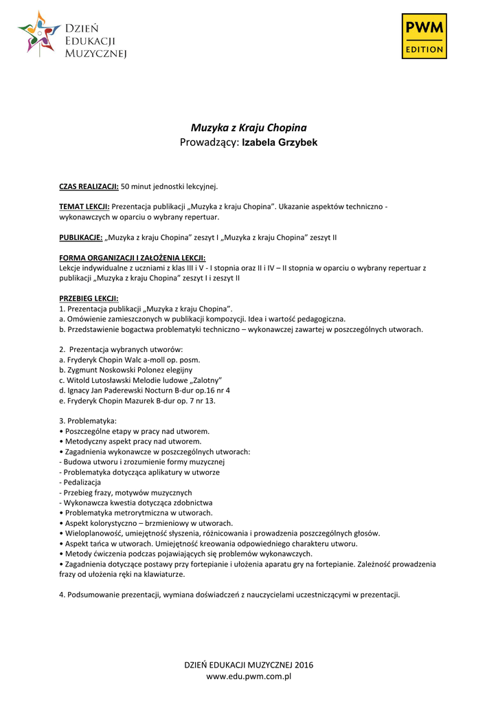 Muzyka z Kraju Chopina Prowadzący: Izabela Grzybek CZAS REALIZACJI: 50 minut jednostki lekcyjnej. TEMAT LEKCJI: Prezentacja publikacji „Muzyka z kraju Chopina”. Ukazanie aspektów techniczno wykonawczych w oparciu o wybrany repertuar. PUBLIKACJE: „Muzyka z kraju Chopina” zeszyt I „Muzyka z kraju Chopina” zeszyt II FORMA ORGANIZACJI I ZAŁOŻENIA LEKCJI: Lekcje indywidualne z uczniami z klas III i V - I stopnia oraz II i IV – II stopnia w oparciu o wybrany repertuar z publikacji „Muzyka z kraju Chopina” zeszyt I i zeszyt II PRZEBIEG LEKCJI: 1. Prezentacja publikacji „Muzyka z kraju Chopina”. a. Omówienie zamieszczonych w publikacji kompozycji. Idea i wartość pedagogiczna. b. Przedstawienie bogactwa problematyki techniczno – wykonawczej zawartej w poszczególnych utworach. 2. Prezentacja wybranych utworów: a. Fryderyk Chopin Walc a-moll op. posm. b. Zygmunt Noskowski Polonez elegijny c. Witold Lutosławski Melodie ludowe „Zalotny” d. Ignacy Jan Paderewski Nocturn B-dur op.16 nr 4 e. Fryderyk Chopin Mazurek B-dur op. 7 nr 13. 3. Problematyka: • Poszczególne etapy w pracy nad utworem. • Metodyczny aspekt pracy nad utworem. • Zagadnienia wykonawcze w poszczególnych utworach: - Budowa utworu i zrozumienie formy muzycznej - Problematyka dotycząca aplikatury w utworze - Pedalizacja - Przebieg frazy, motywów muzycznych - Wykonawcza kwestia dotycząca zdobnictwa • Problematyka metrorytmiczna w utworach. • Aspekt kolorystyczno – brzmieniowy w utworach. • Wieloplanowość, umiejętność słyszenia, różnicowania i prowadzenia poszczególnych głosów. • Aspekt tańca w utworach. Umiejętność kreowania odpowiedniego charakteru utworu. • Metody ćwiczenia podczas pojawiających się problemów wykonawczych. • Zagadnienia dotyczące postawy przy fortepianie i ułożenia aparatu gry na fortepianie. Zależność prowadzenia frazy od ułożenia ręki na klawiaturze. 4. Podsumowanie prezentacji, wymiana doświadczeń z nauczycielami uczestniczącymi w prezentacji. DZIEŃ EDUKACJI MUZYCZNEJ 2016 www.edu.pwm.com.pl