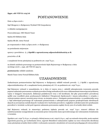 Sygn. akt VIII Gz 103/16 POSTANOWIENIE Dnia 14 lipca 2016 r. Sąd Okręgowy w Bydgoszczy Wydział VIII Gospodarczy w składzie następującym: Przewodniczący: SSO Marek Tauer Sędzia SO Elżbieta Kala Sędzia SR del. Artur Fornal po rozpoznaniu w dniu 14 lipca 2016 r. w Bydgoszczy na posiedzeniu niejawnym sprawy z powództwa: (...) Spółki z ograniczoną odpowiedzialnością w R. przeciwko: J. K. o zasądzenie kwoty pieniężnej na podstawie art. 10501 k.p.c. na skutek zażalenia pozwanego na postanowienie Sądu Rejonowego w Bydgoszczy z dnia 25 lutego 2016 r., sygn. akt VIII GC 553/15 postanawia: oddalić zażalenie. Marek Tauer Artur Fornal Elżbieta Kala UZASADNIENIE Zaskarżonym postanowieniem Sąd Rejonowy w Bydgoszczy oddalił wniosek powoda (...) Spółki z ograniczoną odpowiedzialnością w R. o zasądzenie kwoty pieniężnej od J. K. na podstawie art. 10501 k.p.c. Sąd Rejonowy wskazał w uzasadnieniu, że w dniu 27 marca 2015 r. udzielił zabezpieczenia roszczenia powoda poprzez nakazanie pozwanemu wydania powodowi ksiąg rachunkowych wraz z dokumentami stanowiącymi podstawę wpisu w księgach wieczystych, deklaracji podatkowych wraz z ich korektami, list płac pracowników powodowej spółki oraz wszelkich pism przekazanych Zakładowi Ubezpieczeń Społecznych i innym jednostkom w związku z wykonywaniem umowy zawartej przez strony 19 sierpnia 2002 r. Następnie postanowieniem z 15 października 2015 r. Sąd zobowiązał pozwanego do wykonania postanowienia o zabezpieczeniu poprzez przekopiowanie określonych danych na zewnętrzny nośnik danych i wydanie ich w tej formie powodowi, względnie wydrukowanie ich i przekazanie powodowi w terminie 14 dni pod rygorem nakazania pozwanemu zapłaty kwoty 500 zł za każdy dzień zwłoki. Sąd Rejonowy wskazał, że stanowiący podstawę żądania powoda art. 10501 k.p.c. stanowi zbliżone do zadośćuczynienia wynagrodzenie za znoszenie przez wierzyciela stanu spowodowanego nie wykonaniem świadczenia w terminie. Zgodnie z art. 10501 § 1 k.p.c. w sytuacji, o której mowa w art. 1050 § 1 k.p.c., sąd, na wniosek wierzyciela, może zamiast zagrożenia grzywną, po wysłuchaniu stron, zagrozić dłużnikowi nakazaniem zapłaty na rzecz wierzyciela określonej sumy pieniężnej za każdy dzień zwłoki w wykonaniu czynności, niezależnie od roszczeń przysługujących wierzycielowi na zasadach ogólnych. Przepis art. 1050 § 2 stosuje się odpowiednio. W myśl art. 10501 § 2 k.p.c., po bezskutecznym upływie terminu wyznaczonego dłużnikowi do wykonania czynności, sąd na wniosek wierzyciela nakazuje dłużnikowi zapłatę wierzycielowi sumy pieniężnej. W okolicznościach niniejszej sprawy, Sąd Rejonowy uznał, że wniosek nie zasługiwał na uwzględnienie. Sąd wyjaśnił, że pozwany wywiązał się w terminie z nałożonego zobowiązania. Złożył bowiem w dniu 28 października 2015 r. w tutejszym sądzie wymagane od niego dane. Był wprawdzie zobowiązany do przekazania ich powodowi, ale ponieważ postanowienie zostało ogłoszone ustnie, mógł on działać pod wpływem mylnego przekonania, że właściwym wypełnieniem zobowiązania będzie przekazanie danych do Sądu. Wobec dobrowolnego spełnienia w terminie obowiązku, nie zachodziła pierwsza z przesłanek zastosowania instytucji uregulowanej w art. 10501 k.p.c. Sąd dodał, że dane nadesłane do Sądu zostały wysłane pełnomocnikowi powoda w dniu 5 listopada 2015 r., natomiast zostały odebrane po dwukrotnym awizowaniu dopiero w dniu 23 listopada 2015 r., zatem na opóźnienie wpływ miało działanie pełnomocnika wierzyciela, który zwlekał z podjęciem adresowanej do niego przesyłki. W tej sytuacji wierzycielowi nie przysługuje zadośćuczynienie. Zażalenie na to postanowienie złożył powód, który zarzucił naruszenie art. 10501 § 2 i 3 k.p.c. w zw. z art. 743 § 1 k.p.c. poprzez niewłaściwe zastosowanie i w konsekwencji przyjęcie, że obowiązany wykonał w terminie postanowienie Sądu z 15 października 2015 r. Wskazał, że w postanowieniu zobowiązano pozwanego do wydania dokumentów i danych uprawnionemu, któremu zostały one doręczone dopiero dnia 26 listopada 2015 r. W oparciu o powyższe zarzuty powód domagał się zmiany postanowienia i uwzględnienia wniosku uprawnionego poprzez nakazanie obowiązanemu zapłaty sumy pieniężnej w kwocie 14.000 zł, ewentualnie uchylenie zaskarżonego postanowienia i przekazania sprawy do ponownego rozpoznania Sądowi Rejonowemu. Wniósł też o zasądzenie kosztów postępowania zażaleniowego. W odpowiedzi na zażalenie pozwany wniósł o jego oddalenie. Sąd Okręgowy zważył, co następuje: Zażalenie nie zasługuje na uwzględnienie. ANależy stwierdzić, iż instytucja zapłaty na rzecz wierzyciela określonej sumy pieniężnej za każdy dzień zwłoki wprowadzona do kodeksu postępowania cywilnego mocą nowelizacji obowiązującej od dnia 3 maja 2012 r. ma charakter fakultatywny, co wynika z zacytowanej przez Sąd Rejonowy treści omawianego przepisu art. 10501 § 1 k.p.c. Jak wskazuje się w komentarzach, podczas gdy grzywnę sąd obligatoryjnie nakłada w razie zgłoszenia przez wierzyciela takiego żądania, to żądania zastosowania środka przymusu z art. 10501 sąd może nie uwzględnić, a ponadto może miarkować wysokość stawki dziennej na podstawie przesłanek wynikających z § 4 (Olimpia Marcewicz, Komentarz aktualizowany do art.1050(1) Kodeksu postępowania cywilnego, Lex 2016.02.10). W rozpoznawanej sprawie, nakazanie dłużnikowi zapłaty wierzycielowi sumy pieniężnej było nieuzasadnione, skoro jak słusznie ustalił Sąd Rejonowy pozwany wykonał zobowiązanie, a jedynie wskutek pomyłki/wadliwego zrozumienia ustnego polecenia Sądu, nadesłał dokumenty wprost do Sądu, zamiast do powoda. Ponadto czas opóźnienia w otrzymaniu danych przez powoda wynikał też z opóźnienia w odebraniu korespondencji z Sądu przez pełnomocnika powoda, czym w żadnym razie nie można ob