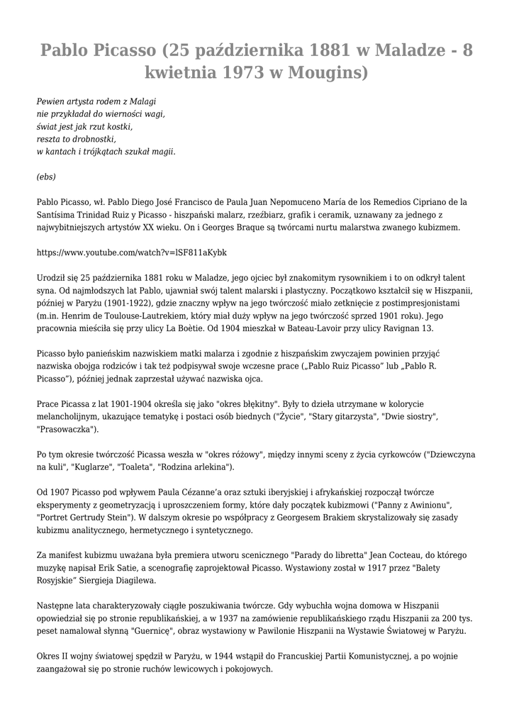 najwybitniejszych artystów XX wieku. On i Georges Braque są twórcami nurtu malarstwa zwanego kubizmem.