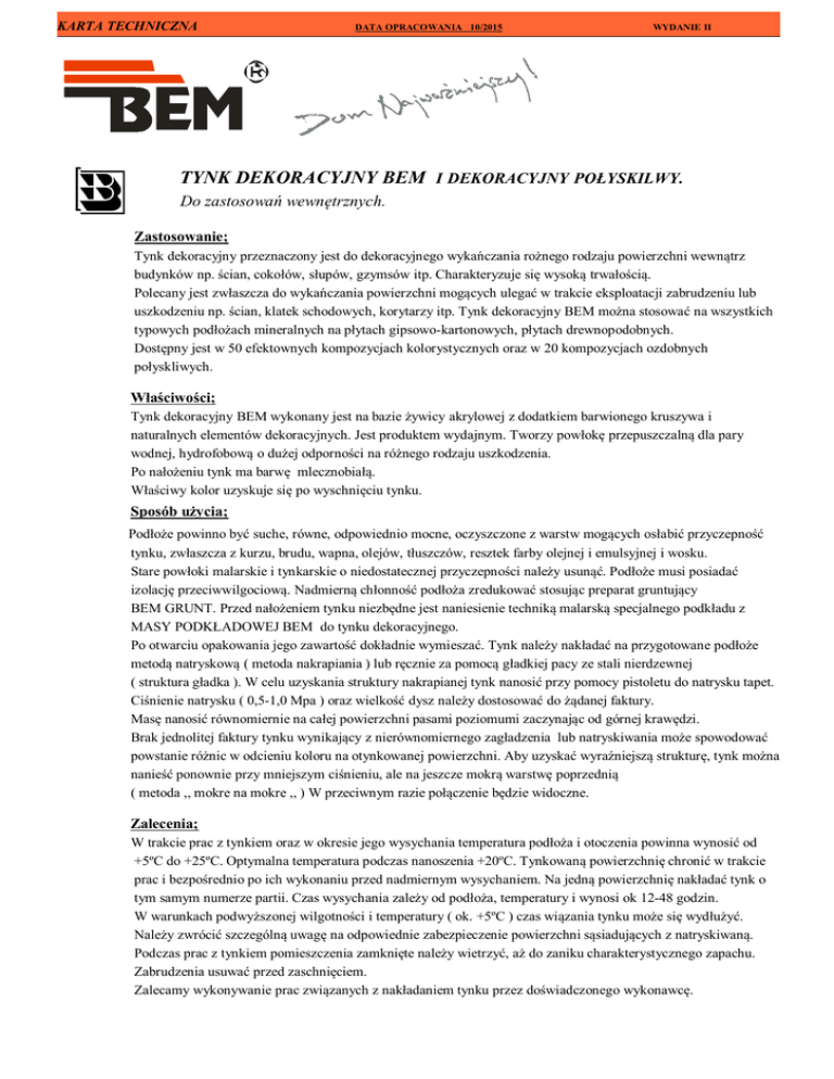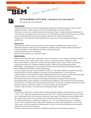 KARTA TECHNICZNA DATA OPRACOWANIA 10/2015 WYDANIE II TYNK DEKORACYJNY BEM I DEKORACYJNY POŁYSKILWY. Do zastosowań wewnętrznych. Zastosowanie; Tynk dekoracyjny przeznaczony jest do dekoracyjnego wykańczania rożnego rodzaju powierzchni wewnątrz budynków np. ścian, cokołów, słupów, gzymsów itp. Charakteryzuje się wysoką trwałością. Polecany jest zwłaszcza do wykańczania powierzchni mogących ulegać w trakcie eksploatacji zabrudzeniu lub uszkodzeniu np. ścian, klatek schodowych, korytarzy itp. Tynk dekoracyjny BEM można stosować na wszystkich typowych podłożach mineralnych na płytach gipsowo-kartonowych, płytach drewnopodobnych. Dostępny jest w 50 efektownych kompozycjach kolorystycznych oraz w 20 kompozycjach ozdobnych połyskliwych. Właściwości; Tynk dekoracyjny BEM wykonany jest na bazie żywicy akrylowej z dodatkiem barwionego kruszywa i naturalnych elementów dekoracyjnych. Jest produktem wydajnym. Tworzy powłokę przepuszczalną dla pary wodnej, hydrofobową o dużej odporności na różnego rodzaju uszkodzenia. Po nałożeniu tynk ma barwę mlecznobiałą. Właściwy kolor uzyskuje się po wyschnięciu tynku. Sposób użycia; Podłoże powinno być suche, równe, odpowiednio mocne, oczyszczone z warstw mogących osłabić przyczepność tynku, zwłaszcza z kurzu, brudu, wapna, olejów, tłuszczów, resztek farby olejnej i emulsyjnej i wosku. Stare powłoki malarskie i tynkarskie o niedostatecznej przyczepności należy usunąć. Podłoże musi posiadać izolację przeciwwilgociową. Nadmierną chłonność podłoża zredukować stosując preparat gruntujący BEM GRUNT. Przed nałożeniem tynku niezbędne jest naniesienie techniką malarską specjalnego podkładu z MASY PODKŁADOWEJ BEM do tynku dekoracyjnego. Po otwarciu opakowania jego zawartość dokładnie wymieszać. Tynk należy nakładać na przygotowane podłoże metodą natryskową ( metoda nakrapiania ) lub ręcznie za pomocą gładkiej pacy ze stali nierdzewnej ( struktura gładka ). W celu uzyskania struktury nakrapianej tynk nanosić przy pomocy pistoletu do natrysku tapet. Ciśnienie natrysku ( 0,5-1,0 Mpa ) oraz wielkość dysz należy dostosować do żądanej faktury. Masę nanosić równomiernie na całej powierzchni pasami poziomumi zaczynając od górnej krawędzi. Brak jednolitej faktury tynku wynikający z nierównomiernego zagładzenia lub natryskiwania może spowodować powstanie różnic w odcieniu koloru na otynkowanej powierzchni. Aby uzyskać wyraźniejszą strukturę, tynk można nanieść ponownie przy mniejszym ciśnieniu, ale na jeszcze mokrą warstwę poprzednią ( metoda ,, mokre na mokre ,, ) W przeciwnym razie połączenie będzie widoczne. Zalecenia; W trakcie prac z tynkiem oraz w okresie jego wysychania temperatura podłoża i otoczenia powinna wynosić od +5ºC do +25ºC. Optymalna temperatura podczas nanoszenia +20ºC. Tynkowaną powierzchnię chronić w trakcie prac i bezpośrednio po ich wykonaniu przed nadmiernym wysychaniem. Na jedną powierzchnię nakładać tynk o tym samym numerze partii. Czas wysychania zależy od podłoża, temperatury i wynosi ok 12-48 godzin. W warunkach podwyższonej wilgotności i temperatury ( ok. +5ºC ) czas wiązania tynku może się wydłużyć. Należy zwrócić szczególną uwagę na odpowiednie zabezpieczenie powierzchni sąsiadujących z natryskiwaną. Podczas prac z tynkiem pomieszczenia zamknięte należy wietrzyć, aż do zaniku charakterystycznego zapachu. Zabrudzenia usuwać przed zaschnięciem. Zalecamy wykonywanie prac związanych z nakładaniem tynku przez doświadczonego wykonawcę. KARTA TECHNICZNA DATA OPRACOWANIA 10/2015 WYDANIE II Dane techniczne; Temperatura podłoża i otoczenia; od +5ºC do +25ºC Paroprzepuszczalność V3 Absorbcja wody W1 Przyczepność Trwałość Przewodność cieplna Reakcja na ogień ≥ 0,3 MPa ≥ 0,3 MPa λ; 0,83 W/m*k A1 Dokumenty odniesienia; Produkt objęty normą zharmonizowaną PN-EN- 15824;2010 Narzędzia; Wiertarka elektryczna wolnoobrotowa z mieszadłem, gładka stalowa paca nierdzewna ( metoda ręczna ) lub sprężarka o pojemności minimum 100 litrów, pistolet do tapet natryskowych ( metoda nakrapiania ). Narzędzia należy czyścić czystą wodą bezpośrednio po ukończeniu prac. UWAGA ! Tynk przewozić i przechowywać w szczelnie zamkniętych wiaderkach w suchych warunkach w temperaturze dodatniej. Chronić przed wilgocią. Stwardniały produkt można traktować jako gruz budowlany. BEZPIECZEŃSTWO; P102 – chronić przed dziećmi P101 – w razie konieczności zasięgnąć porady lekarza P262 – nie wprowadzać do oczu, na skórę lub na odzież Zużycie; Średnie zużycie tynku około 2,5-3,0 kg/m² Termin ważności przechowywanie i transport: Okres przydatności do użycia tynku wynosi 12 miesięcy od daty produkcji umieszczonej na opakowaniu. Producent; ,, BEM ,, 95-100 Zgierz, ul. Barwnikowa 10 tel/fax; (42) 714 01 00/01 e-mail; [email protected] www.bem.pl
