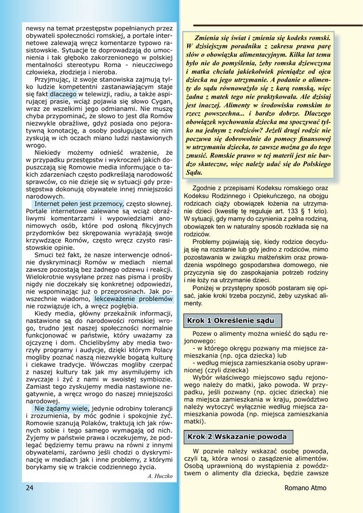 newsy na temat przestępstw popełnianych przez obywateli społeczności romskiej, a portale internetowe zalewają wręcz komentarze typowo rasistowskie. Sytuacje te doprowadzają do umocnienia i tak głęboko zakorzenionego w polskiej mentalności stereotypu Roma - nieuczciwego człowieka, złodzieja i nieroba. Przyjmując, iż swoje stanowiska zajmują tylko ludzie kompetentni zastanawiającym staje się fakt dlaczego w telewizji, radiu, a także aspirującej prasie, wciąż pojawia się słowo Cygan, wraz ze wszelkimi jego odmianami. Nie muszę chyba przypominać, że słowo to jest dla Romów niezwykle obraźliwe, gdyż posiada ono pejoratywną konotację, a osoby posługujące się nim zyskują w ich oczach miano ludzi nastawionych wrogo. Niekiedy możemy odnieść wrażenie, że w przypadku przestępstw i wykroczeń jakich dopuszczają się Romowie media informujące o takich zdarzeniach często podkreślają narodowość sprawców, co nie dzieje się w sytuacji gdy przestępstwa dokonują obywatele innej mniejszości narodowych. Internet pełen jest przemocy, często słownej. Portale internetowe zalewane są wciąż obraźliwymi komentarzami i wypowiedziami anonimowych osób, które pod osłoną fikcyjnych przydomków bez skrępowania wyrażają swoje krzywdzące Romów, często wręcz czysto rasistowskie opinie. Smuci też fakt, że nasze interwencje odnośnie dyskryminacji Romów w mediach niemal zawsze pozostają bez żadnego odzewu i reakcji. Wielokrotnie wysyłane przez nas pisma i prośby nigdy nie doczekały się konkretnej odpowiedzi, nie wspominając już o przeprosinach. Jak powszechnie wiadomo, lekceważenie problemów nie rozwiązuje ich, a wręcz pogłębia. Kiedy media, główny przekaźnik informacji, nastawione są do narodowości romskiej wrogo, trudno jest naszej społeczności normalnie funkcjonować w państwie, który uważamy za ojczyznę i dom. Chcielibyśmy aby media tworzyły programy i audycje, dzięki którym Polacy mogliby poznać naszą niezwykle bogatą kulturę i ciekawe tradycje. Wówczas mogliby czerpać z naszej kultury tak jak my asymilujemy ich zwyczaje i żyć z nami w swoistej symbiozie. Zamiast tego zyskujemy media nastawione negatywnie, a wręcz wrogo do naszej mniejszości narodowej. Nie żądamy wiele, jedynie odrobiny tolerancji i zrozumienia, by móc godnie i spokojnie żyć. Romowie szanują Polaków, traktują ich jak równych sobie i tego samego wymagają od nich. Żyjemy w państwie prawa i oczekujemy, że podlegać będziemy temu prawu na równi z innymi obywatelami, zarówno jeśli chodzi o dyskryminację w mediach jak i inne problemy, z którymi borykamy się w trakcie codziennego życia. A. Huczko 24 Zmienia się świat i zmienia się kodeks romski. W dzisiejszym poradniku z zakresu prawa parę słów o obowiązku alimentacyjnym. Kilka lat temu było nie do pomyślenia, żeby romska dziewczyna i matka chciała jakiekolwiek pieniądze od ojca dziecka na jego utrzymanie. A podanie o alimenty do sądu równoważyło się z karą romską, więc żadna z matek tego nie praktykowała. Ale dzisiaj jest inaczej. Alimenty w środowisku romskim to rzecz powszechna... i bardzo dobrze. Dlaczego obowiązek wychowania dziecka ma spoczywać tylko na jednym z rodziców? Jeżeli drugi rodzic nie poczuwa się dobrowolnie do pomocy finansowej w utrzymaniu dziecka, to zawsze można go do tego zmusić. Romskie prawo w tej materii jest nie bardzo skuteczne, więc należy udać się do Polskiego Sądu. Zgodnie z przepisami Kodeksu romskiego oraz Kodeksu Rodzinnego i Opiekuńczego, na obojgu rodzicach ciąży obowiązek łożenia na utrzymanie dzieci (kwestię tę reguluje art. 133 § 1 krio). W sytuacji, gdy mamy do czynienia z pełna rodziną, obowiązek ten w naturalny sposób rozkłada się na rodziców. Problemy pojawiają się, kiedy rodzice decydują się na rozstanie lub gdy jedno z rodziców, mimo pozostawania w związku małżeńskim oraz prowadzenia wspólnego gospodarstwa domowego, nie przyczynia się do zaspokajania potrzeb rodziny i nie łoży na utrzymanie dzieci. Poniżej w przystępny sposób postaram się opisać, jakie kroki trzeba poczynić, żeby uzyskać alimenty. Krok 1 Określenie sądu Pozew o alimenty można wnieść do sądu rejonowego: - w którego okręgu pozwany ma miejsce zamieszkania (np. ojca dziecka) lub - według miejsca zamieszkania osoby uprawnionej (czyli dziecka) Wybór właściwego miejscowo sądu rejonowego należy do matki, jako powoda. W przypadku, jeśli pozwany (np. ojciec dziecka) nie ma miejsca zamieszkania w kraju, powództwo należy wytoczyć wyłącznie według miejsca zamieszkania powoda (np. miejsca zamieszkania matki). Krok 2 Wskazanie powoda W pozwie należy wskazać osobę powoda, czyli tą, która wnosi o zasądzenie alimentów. Osobą uprawnioną do wystąpienia z powództwem o alimenty dla dziecka, będzie zawsze Romano Atmo Prawo na codzień ono samo i na jego rzecz należy je zasądzać. Natomiast reprezentować je będzie jego przedstawiciel ustawowy (jedno z rodziców, opiekun). W związku z tym ta osoba powinna być wymieniona, jako działająca w imieniu dziecka. Jeżeli matka dochodzi alimentów w imieniu swojego małoletniego dziecka, w pozwie musi wskazać, że powodem jest dziecko, a nie ona. Gdy nie określi dziecka jako powoda, sąd może odrzucić pozew. Krok 3 Wskazanie pozwanego W prawidłowo napisanym pozwie musi się znaleźć zapis określający pozwanego, czyli osobę, od której domaga się alimentów. Należy podać jego imię i nazwisko oraz adres zamieszkania. Krok 4 Wniosek W uzasadnieniu pozwu o alimenty należy wskazać, że pozwany ma możliwości zarobkowe i majątkowe, aby ponieść koszty obowiązku alimentacyjnego. Należy także wskazać, że osoba wnosząca pozew nie ma żadnego majątku, z którego mogłaby czerpać dochód zapewniający mu pokrycie kosztów jego utrzymania. Każda z okoliczności musi być poparta konkretnym dowodem, np. zeznaniami świadków, 