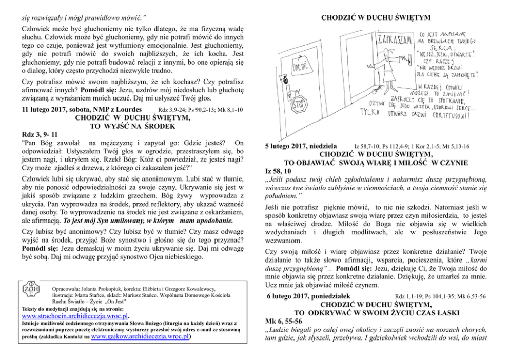 się rozwiązały i mógł prawidłowo mówić.” CHODZIĆ W DUCHU ŚWIĘTYM Człowiek może być głuchoniemy nie tylko dlatego, że ma fizyczną wadę słuchu. Człowiek może być głuchoniemy, gdy nie potrafi mówić do innych tego co czuje, ponieważ jest wytłumiony emocjonalnie. Jest głuchoniemy, gdy nie potrafi mówić do swoich najbliższych, że ich kocha. Jest głuchoniemy, gdy nie potrafi budować relacji z innymi, bo one opierają się o dialog, który często przychodzi niezwykle trudno. Czy potrafisz mówić swoim najbliższym, że ich kochasz? Czy potrafisz afirmować innych? Pomódl się: Jezu, uzdrów mój niedosłuch lub głuchotę związaną z wyrażaniem moich uczuć. Daj mi usłyszeć Twój głos. 11 lutego 2017, sobota, NMP z Lourdes Rdz 3,9-24; Ps 90,2-13; Mk 8,1-10 CHODZIĆ W DUCHU ŚWIĘTYM, TO WYJŚĆ NA ŚRODEK Rdz 3, 9- 11 "Pan Bóg zawołał na mężczyznę i zapytał go: Gdzie jesteś? On odpowiedział: Usłyszałem Twój głos w ogrodzie, przestraszyłem się, bo jestem nagi, i ukryłem się. Rzekł Bóg: Któż ci powiedział, że jesteś nagi? Czy może zjadłeś z drzewa, z którego ci zakazałem jeść?" Człowiek lubi się ukrywać, aby stać się anonimowym. Lubi stać w tłumie, aby nie ponosić odpowiedzialności za swoje czyny. Ukrywanie się jest w jakiś sposób związane z ludzkim grzechem. Bóg żywy wyprowadza z ukrycia. Pan wyprowadza na środek, przed reflektory, aby ukazać ważność danej osoby. To wyprowadzenie na środek nie jest związane z oskarżaniem, ale afirmacją. To jest mój Syn umiłowany, w którym mam upodobanie. Czy lubisz być anonimowy? Czy lubisz być w tłumie? Czy masz odwagę wyjść na środek, przyjąć Boże synostwo i głośno się do tego przyznać? Pomódl się: Jezu demaskuj w moim życiu ukrywanie się. Daj mi odwagę być sobą. Daj mi odwagę przyjąć synostwo Ojca niebieskiego. Opracowała: Jolanta Prokopiuk, korekta: Elżbieta i Grzegorz Kowalewscy, ilustracje: Marta Stańco, skład:: Mariusz Stańco. Wspólnota Domowego Kościoła Ruchu Światło – Życie „On Jest” Teksty do medytacji znajdują się na stronie: www.strachocin.archidiecezja.wroc.pl. Istnieje możliwość codziennego otrzymywania Słowa Bożego (liturgia na każdy dzień) wraz z rozważaniami poprzez pocztę elektroniczną; wystarczy przesłać swój adres e-mail ze stosowną prośbą (zakładka Kontakt na www.gajkow.archidiecezja.wroc.pl) 5 lutego 2017, niedziela Iz 58,7-10; Ps 112,4-9; 1 Kor 2,1-5; Mt 5,13-16 CHODZIĆ W DUCHU ŚWIĘTYM, TO OBJAWIAĆ SWOJĄ WIARĘ I MIŁOŚĆ W CZYNIE Iz 58, 10 „Jeśli podasz twój chleb zgłodniałemu i nakarmisz duszę przygnębioną, wówczas twe światło zabłyśnie w ciemnościach, a twoja ciemność stanie się południem.” Jeśli nie potrafisz pięknie mówić, to nic nie szkodzi. Natomiast jeśli w sposób konkretny objawiasz swoją wiarę przez czyn miłosierdzia, to jesteś na właściwej drodze. Miłość do Boga nie objawia się w wielkich wzdychaniach i długich modlitwach, ale w posłuszeństwie Jego wezwaniom. Czy swoją miłość i wiarę objawiasz przez konkretne działanie? Twoje działanie to także słowo afirmacji, wsparcia, pocieszenia, które „karmi duszę przygnębioną” . Pomódl się: Jezu, dziękuję Ci, że Twoja miłość do mnie objawia się przez konkretne działanie. Dziękuję, że umarłeś za mnie. Ucz mnie jak objawiać miłość czynem. 6 lutego 2017, poniedziałek Rdz 1,1-19; Ps 104,1-35; Mk 6,53-56 CHODZIĆ W DUCHU ŚWIĘTYM, TO ODKRYWAĆ W SWOIM ŻYCIU CZAS ŁASKI Mk 6, 55-56 „Ludzie biegali po całej owej okolicy i zaczęli znosić na noszach chorych, tam gdzie, jak słyszeli, przebywa. I gdziekolwiek wchodzili do wsi, do miast czy osad, kładli chorych na otwartych miejscach i prosili Go, żeby choć frędzli u Jego płaszcza mogli się dotknąć. A wszyscy, którzy się Go dotknęli, odzyskiwali zdrowie.” Każdy z nas ma swoje przysłowiowe pięć minut. Łaską jest dostrzeżenie szczęścia, które przychodzi. To szczęście oczywiście może wyglądać dla każdego inaczej. Niekiedy to szczęście domaga się trudu, który należy podjąć. Dla jednych będzie to uzdrowienie fizyczne, dla innych zdanie trudnego egzaminu na studiach, a dla kogoś innego właściwe rozpoznanie swojego powołania. Wszystko jest jednak łaską. Ludzie owej okolicy dobrze wykorzystali swój czas łaski. Czy dostrzegasz w swoim życiu czas łaski? Czy dostrzegasz przychodzące szczęście i z nim współpracujesz? Pomódl się: Jezu, dziękuję, że przychodzisz do mnie. Dziękuję, że pozwalasz mi odkryć moje szczęście. 7 lutego 2017, wtorek Rdz 1,20-2,4; Ps 8,4-9; Mk 7,1-13 CHODZIĆ W DUCHU ŚWIĘTYM, TO ODKRYĆ SWOJE SERCE Mk 7, 6-7 „Odpowiedział im: Słusznie prorok Izajasz powiedział o was, obłudnikach, jak jest napisane: Ten lud czci Mnie wargami, lecz sercem swym daleko jest ode Mnie. Ale czci Mnie na próżno, ucząc zasad podanych przez ludzi.” Miłość, szczęście, wiara, przyjaźń związane są z sercem. W rozumieniu biblijnym serce nie jest tylko siedliskiem uczuć ale oznacza wnętrze człowieka, jego osobowość, jego prawdziwe JA. To serce decyduje o głębokości zaangażowania. To serce decyduje o miłości do Boga, a nie wykonywanie praktyk religijnych. Praktyki religijne powinny być odpowiedzią na zaangażowane serce. Gdzie skarb twój - tam serce twoje. Czy żyjesz sercem, czy tylko rozumowymi kalkulacjami? Czy twoje serce zaangażowane jest w praktyki religijne? Pomódl się: Jezu daj mi odkryć swoje serce. Pozwól mi zaangażować się w to co dla Ciebie jest ważne. 8 lutego 2017, środa Rdz 2,4-17; Ps 104,1-30; Mk 7,14-23 CHODZIĆ W DUCHU ŚWIĘTYM, TO POZNAWAĆ SWOJE SERCE Mk 7, 21-23 „Z wnętrza bowiem, z serca ludzkiego pochodzą złe myśli, nierząd, kradzieże, zabójstwa, cudzołóstwa, chciwość, przewrotność, podstęp, wyuzdanie, zazdrość, obelgi, pycha, głupota. Całe to zło z wnętrza pochodzi i czyni