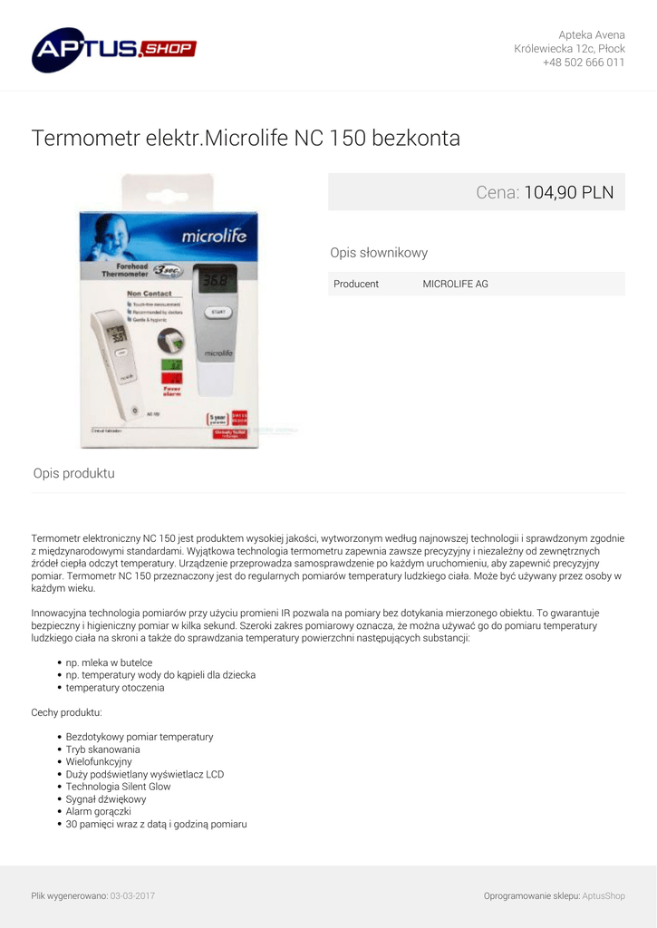 Apteka Avena Królewiecka 12c, Płock +48 502 666 011 Termometr elektr.Microlife NC 150 bezkonta Cena: 104,90 PLN Opis słownikowy Producent MICROLIFE AG Opis produktu Termometr elektroniczny NC 150 jest produktem wysokiej jakości, wytworzonym według najnowszej technologii i sprawdzonym zgodnie z międzynarodowymi standardami. Wyjątkowa technologia termometru zapewnia zawsze precyzyjny i niezależny od zewnętrznych źródeł ciepła odczyt temperatury. Urządzenie przeprowadza samosprawdzenie po każdym uruchomieniu, aby zapewnić precyzyjny pomiar. Termometr NC 150 przeznaczony jest do regularnych pomiarów temperatury ludzkiego ciała. Może być używany przez osoby w każdym wieku. Innowacyjna technologia pomiarów przy użyciu promieni IR pozwala na pomiary bez dotykania mierzonego obiektu. To gwarantuje bezpieczny i higieniczny pomiar w kilka sekund. Szeroki zakres pomiarowy oznacza, że można używać go do pomiaru temperatury ludzkiego ciała na skroni a także do sprawdzania temperatury powierzchni następujących substancji: np. mleka w butelce np. temperatury wody do kąpieli dla dziecka temperatury otoczenia Cechy produktu: Bezdotykowy pomiar temperatury Tryb skanowania Wielofunkcyjny Duży podświetlany wyświetlacz LCD Technologia Silent Glow Sygnał dźwiękowy Alarm gorączki 30 pamięci wraz z datą i godziną pomiaru Plik wygenerowano: 03-03-2017 Oprogramowanie sklepu: AptusShop Apteka Avena Królewiecka 12c, Płock +48 502 666 011 Automatyczne wyłączanie Łatwy w użyciu Testowany klinicznie Specyfikacja techniczna: Waga: 55g (z bateriami), 51g (bez baterii) Wymiary: 140 x 39 x 42 mm Typ: Elektroniczny termometr bezkontaktowy NC 150 Zakres pomiaru: Pomiar temp. ciała: 34,0-42,2 ˚C (93,2-108,0 ˚F) Pomiar temp. obiektu: 0-100,0 ˚C (32-212,0 ˚F) Rozdzielczość: 0,1 ˚C / ˚F Dokładność pomiaru: W warunkach laboratoryjnych: ±0,2˚C, 36,0 - 39,0˚C (±0,4˚F, 96,8 - 102,2˚F) Wyświetlacz: Liquid Crystal Display (ciekłokrystaliczny), 4 cyfry plus ikony specjalne Akustyka: • Przyrząd włączony i gotowy do wykonywania pomiarów: 1 krótki sygnał • Zakończenie pomiaru: 1 długi sygnał dźwiękowy (1 sek.), jeśli odczyt jest niższy niż 37,5˚C (99,4˚F), 10 krótkich sygnałów dźwiękowych, jeśli odczyt jest równy lub wyższy niż 37,5˚C(99,4˚F). • Błąd systemowy lub awaria: 3 krótkie sygnały dźwiękowe Pamięć: • Automatyczna prezentacja ostatniego pomiaru • 30 odczytów wywoływanych z pamięci z datą i godziną pomiaru Podświetlenie: • Po włączeniu przyrządu na 4 sekundy uaktywnia się ZIELONE podświetlenie. • Po zakończeniu pomiaru wynikiem niższym niż 37,5 ˚C (99,4 ˚F) na 5 sekund uaktywnia się ZIELONE podświetlenie. • Po zakończeniu pomiaru wynikiem równym lub wyższym niż 37,5˚C (99,4˚F) na 5 sekund uaktywnia się CZERWONE podświetlenie. Automatyczne wyłączanie się: Po ok. 1 minucie od wykonania ostatniego pomiaru. Bateria: 2x bateria AAA 1,5V Plik wygenerowano: 03-03-2017 Powered by TCPDF (www.tcpdf.org) Oprogramowanie sklepu: AptusShop