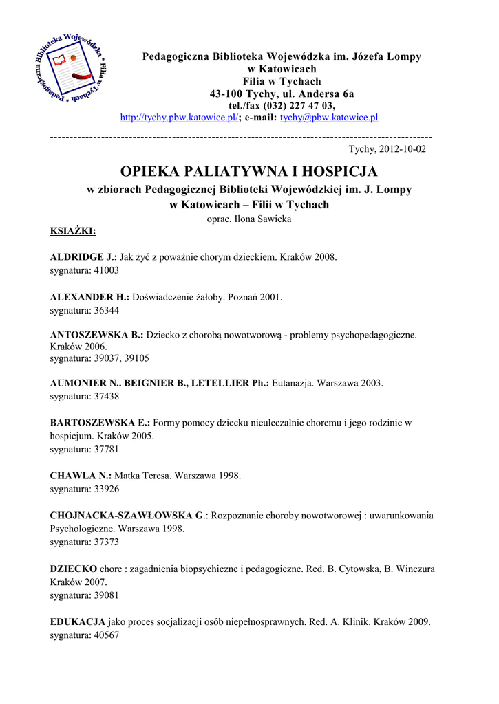Pedagogiczna Biblioteka Wojewódzka im. Józefa Lompy w Katowicach Filia w Tychach 43-100 Tychy, ul. Andersa 6a tel./fax (032) 227 47 03, http://tychy.pbw.katowice.pl/; e-mail: [email protected] ------------------------------------------------------------------------------------------------Tychy, 2012-10-02 OPIEKA PALIATYWNA I HOSPICJA w zbiorach Pedagogicznej Biblioteki Wojewódzkiej im. J. Lompy w Katowicach – Filii w Tychach oprac. Ilona Sawicka KSIĄŻKI: ALDRIDGE J.: Jak żyć z poważnie chorym dzieckiem. Kraków 2008. sygnatura: 41003 ALEXANDER H.: Doświadczenie żałoby. Poznań 2001. sygnatura: 36344 ANTOSZEWSKA B.: Dziecko z chorobą nowotworową - problemy psychopedagogiczne. Kraków 2006. sygnatura: 39037, 39105 AUMONIER N.. BEIGNIER B., LETELLIER Ph.: Eutanazja. Warszawa 2003. sygnatura: 37438 BARTOSZEWSKA E.: Formy pomocy dziecku nieuleczalnie choremu i jego rodzinie w hospicjum. Kraków 2005. sygnatura: 37781 CHAWLA N.: Matka Teresa. Warszawa 1998. sygnatura: 33926 CHOJNACKA-SZAWŁOWSKA G.: Rozpoznanie choroby nowotworowej : uwarunkowania Psychologiczne. Warszawa 1998. sygnatura: 37373 DZIECKO chore : zagadnienia biopsychiczne i pedagogiczne. Red. B. Cytowska, B. Winczura Kraków 2007. sygnatura: 39081 EDUKACJA jako proces socjalizacji osób niepełnosprawnych. Red. A. Klinik. Kraków 2009. sygnatura: 40567 FORMY opieki, wychowania i wsparcia w zreformowanym systemie pomocy społecznej. Red. J. Brągiel, S. Badora. Opole 2005. sygnatura: 38438, 39473 GÓRECKI M. : Hospicjum w służbie umierających. Warszawa 2000. sygnatura: 35034czyt./3 HOSPICJA nadziei = Hospices of hope. Red. W. Falkowski, E. Lewandowska-Tarasiuk, J. Wiktor Sienkiewicz. Warszawa-Londyn 2004. sygnatura: 38421 JAKOŚĆ życia a niepełnosprawność : konteksty psychopedagogiczne. Red. Z. Palak, A. Lewicka, A. Bujnowska. Lublin 2006. sygnatura: 38937 JAKOŚĆ życia w chorobie : społeczno-pedagogiczne studium indywidualnych przypadków. Red. E. Syrek. Kraków 2001. sygnatura: 37138 JAKOŚĆ życia w niepełnosprawności - mity a rzeczywistość. Red. M. Flanczewska-Wolny. Kraków 2007. sygnatura: 39272 KLINICZNE i sądowo-penitencjarne aspekty funkcjonowania człowieka. Red. G. ChojnackaSzawłowska, B. Pastwa-Wojciechowska. Kraków 2007. sygnatura: 39860 KOZŁOWSKA A.: Jak pomagać dziecku z zaburzeniami życia uczuciowego. Warszawa 1996. sygnatura: 32445 KUBLER-ROSS E.: Rozmowy o śmierci i umieraniu. Poznań 1998. sygnatura: 34990 O TRUDNEJ sztuce bycia razem, czyli różne oblicza integracji. Red. A. Stankowski, M. Balukiewicz. Kraków 2006. sygnatura: 39267 OBLICZA dzieciństwa. Red. D.Kornas-Biela. Lublin 2001. sygnatura: 36705 O'CONNOR N.: Pożegnanie miłości : jak przetrwać stratę ukochanej osoby. Warszawa 1994. sygnatura: 30846 OD tradycjonalizmu do ponowoczesności. Red. E. Górniewicz, A. Krause. Olsztyn 2002. sygnatura: 36621 OPIEKA i pomoc społeczna wobec wyzwań współczesności. Red. W. Walc, B. Szluz, I. Marczykowska. Rzeszów 2008. sygnatura: 40274 OSTROWSKA A.: Śmierć w doświadczeniu jednostki i społeczeństwa. Warszawa 1997. sygnatura: 35808 PAWŁOWSKA R., JUNDZIŁŁ E.: Pedagogika człowieka samotnego. Gdańsk 2000. sygnatura: 36750 PECYNA M. B.: Dziecko i jego choroba. Warszawa 2000. sygnatura: 35680 PEDAGOGIKA społeczna : człowiek w zmieniającym się świecie. Red. T. Pilch, I. Lepalczyk. Warszawa 1995. sygnatura: 31897cz./37, 31898, 31898, 31899, 31971, 31972, 32307, 32417, 41839 PIETRZYK A.: "Ta choroba" w rodzinie : psycholog o raku. Kraków 2006. sygnatura: 39378 PILECKA B.: Kryzys psychologiczny : wybrane zagadnienia. Kraków 2004. sygnatura: 37453, 37548 PROBLEMATYKA osób w wieku starszym : materiały z III Ogólnopolskiego Seminarium Naukowego Mysłowice, 22 maja 2004 roku. Red. J. Rzepka. Mysłowice 2006. sygnatura: 40361 PROPEDEUTYKA pielęgniarstwa. Red. S.Collins, E. Parker. Warszawa 1989. sygnatura: 26944 SIMONTON C., HENSON R., HAMPTON B.: Jak żyć z rakiem i go pokonać. - Wyd. 3. Łódź 2003. sygnatura: 37597 STAWIARSKA P.: Wolontariat hospicyjny : perspektywa interdyscyplinarna. Warszawa 2011. sygnatura: 41298 SYTUACJE trudne w życiu dziecka. Red. M. Cywińska. Poznań 2008. sygnatura: 40258 UMIERAĆ bez lęku : wstęp do bioetyki kulturowej. Red. M. Gałuszka, K. Szewczyk. WarszawaŁódź 1996. sygnatura: 33183 WILBER K.: Śmiertelni nieśmiertelni. Warszawa 1995. sygnatura: 31762 WIRSCHING M.: Wokół raka : pacjent, rodzina, opieka medyczna. Gdańsk 1994. sygnatura: 37604, 37605 WYBRANE problemy opieki i wychowania. Red. Z. Brańka. Kraków 1997. sygnatura: 35872 Z POMOCĄ umierającym : przyczynki do rozmowy na temat umierania i śmierci. Zebrał H. Nikelski. Warszawa 1989. sygnatura: 27520, 30323 ZAPOBIEGANIE zakażeniom HIV, opieka nad ludźmi zakażonymi HIV i chorymi na AIDS : (Materiały metodyczne dla nauczycieli szkół medycznych). Warszawa 1992. sygnatura: 31534 ARTYKUŁY Z WYDAWNICTW CIĄGŁYCH: BACZAŁA D.: Gdy choroba nowotworowa spotyka się u dziecka z głębszą niepełnosprawnością intelektualną // Szkoła Specjalna. - 2007, nr 3, s. 192-198 CHODKIEWICZ J., MINISZEWSKA J. : Psyche i soma - od emocji do choroby // Remedium. - 2007, nr 12, s. 1-3 GŁUCH-JUSZKIEWICZ K.: Wolontariusze // Śląsk. - 2009, nr 4, s. 8-11 GÓRECKI M.: Hospicjum - czyli o godnej śmierci i humanitarnej pomocy // Opieka Wychowanie – Terapia. - 1993, nr 1, s. 13-16 GRETKOWSKI A.: Syndrom wypalenia zawodowego w pracy hospicyjnej - próba analizy zjawiska // Edukacja Dorosłych. - 2003, nr 2, s.23-39 GRESZTA E.: Poczucie więzi emocjonalnej z rodzicami u dzieci chorujących na białaczkę // Psychologia Wychowawcza. - 2000, nr 2-3, s. 201-207 KACPERCZYK A.: Budowanie interakcji z nieuleczalnie chorym // Kultura i Społeczeństwo. 1998 , nr 2, s. 181-200 KACPERCZYK A.: Opieka nad pacjentem w stanie terminalnym (na przykładzie analizy przypadku konkretnej instytucji) // Kultura i Społeczeństwo. - 1999, nr 2, s. 103-128 KRAWCZYK A.: Fundacja "Mam Marzen