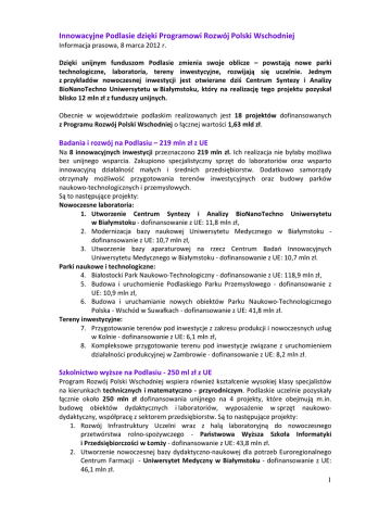 Innowacyjne Podlasie dzięki Programowi Rozwój Polski Wschodniej Informacja prasowa, 8 marca 2012 r. Dzięki unijnym funduszom Podlasie zmienia swoje oblicze – powstają nowe parki technologiczne, laboratoria, tereny inwestycyjne, rozwijają się uczelnie. Jednym z przykładów nowoczesnej inwestycji jest otwierane dziś Centrum Syntezy i Analizy BioNanoTechno Uniwersytetu w Białymstoku, który na realizację tego projektu pozyskał blisko 12 mln zł z funduszy unijnych. Obecnie w województwie podlaskim realizowanych jest 18 projektów dofinansowanych z Programu Rozwój Polski Wschodniej o łącznej wartości 1,63 mld zł. Badania i rozwój na Podlasiu – 219 mln zł z UE Na 8 innowacyjnych inwestycji przeznaczono 219 mln zł. Ich realizacja nie byłaby możliwa bez unijnego wsparcia. Zakupiono specjalistyczny sprzęt do laboratoriów oraz wsparto innowacyjną działalność małych i średnich przedsiębiorstw. Dodatkowo samorządy otrzymały możliwość przygotowania terenów inwestycyjnych oraz budowy parków naukowo-technologicznych i przemysłowych. Są to następujące projekty: Nowoczesne laboratoria: 1. Utworzenie Centrum Syntezy i Analizy BioNanoTechno Uniwersytetu w Białymstoku - dofinansowanie z UE: 11,8 mln zł, 2. Modernizacja bazy naukowej Uniwersytetu Medycznego w Białymstoku dofinansowanie z UE: 10,7 mln zł, 3. Utworzenie bazy aparaturowej na rzecz Centrum Badań Innowacyjnych Uniwersytetu Medycznego w Białymstoku - dofinansowanie z UE: 10,7 mln zł. Parki naukowe i technologiczne: 4. Białostocki Park Naukowo-Technologiczny - dofinansowanie z UE: 118,9 mln zł, 5. Budowa i uruchomienie Podlaskiego Parku Przemysłowego - dofinansowanie z UE: 10,9 mln zł, 6. Budowa i uruchamianie nowych obiektów Parku Naukowo-Technologicznego Polska - Wschód w Suwałkach - dofinansowanie z UE: 41,8 mln zł. Tereny inwestycyjne: 7. Przygotowanie terenów pod inwestycje z zakresu produkcji i nowoczesnych usług w Kolnie - dofinansowanie z UE: 6,1 mln zł, 8. Kompleksowe przygotowanie terenu pod inwestycje związane z uruchomieniem działalności produkcyjnej w Zambrowie - dofinansowanie z UE: 8,2 mln zł. Szkolnictwo wyższe na Podlasiu - 250 ml zł z UE Program Rozwój Polski Wschodniej wspiera również kształcenie wysokiej klasy specjalistów na kierunkach technicznych i matematyczno - przyrodniczym. Podlaskie uczelnie pozyskały łącznie około 250 mln zł dofinansowania unijnego na 4 projekty, które obejmują m.in. budowę obiektów dydaktycznych i laboratoriów, wyposażenie w sprzęt naukowodydaktyczny, współpracę z sektorem przedsiębiorstw. Są to następujące projekty: 1. Rozwój Infrastruktury Uczelni wraz z halą laboratoryjną do nowoczesnego przetwórstwa rolno-spożywczego - Państwowa Wyższa Szkoła Informatyki i Przedsiębiorczości w Łomży - dofinansowanie z UE: 43,8 mln zł. 2. Utworzenie nowoczesnej bazy dydaktyczno-naukowej dla potrzeb Euroregionalnego Centrum Farmacji - Uniwersytet Medyczny w Białymstoku - dofinansowanie z UE: 46,1 mln zł. 1 3. Centrum Nowoczesnego Kształcenia - Politechnika Białostocka - dofinansowanie z UE: 53,7 mln zł. 4. Budowa Instytutu Biologii oraz Wydziału Matematyki i Informatyki wraz z Uniwersyteckim Centrum Obliczeniowym - Uniwersytet w Białymstoku dofinansowanie z UE: 106,5 mln zł. Uniwersytet w Białymstoku – projekty unijnym wsparciem Uniwersytet w Białymstoku korzysta z dofinansowania ze środków unijnych z 3 krajowych programów i regionalnego programu woj. podlaskiego. Łącznie do uczelni trafiło ponad 400 mln zł dofinansowania (środki UE) na realizację 15 projektów. Liczba poszczególnych projektów w podziale na programy. Program Kapitał Ludzki: 11 Program Infrastruktura i Środowisko: 1 Regionalny Program Operacyjny woj. podlaskiego: 1 Program Rozwój Polski Wschodniej: 2 1. Budowa Instytutu Biologii oraz Wydziału Matematyki i Informatyki wraz z Uniwersyteckim Centrum Obliczeniowym (w trakcie realizacji) - dofinansowanie z UE: 106,5 mln zł. 2. Utworzenie Centrum Syntezy i Analizy BioNanoTechno w Białymstoku (zakończony) - dofinansowanie z UE: 11,8 mln zł. Uniwersytetu Celem projektu jest unowocześnienie i zróżnicowanie potencjału badawczego w Instytucie Chemii Uniwersytetu w Białymstoku, oraz utworzenie infrastruktury laboratoryjnej Centrum Syntezy i Analizy BioNanoTechno składającego się z trzech specjalistycznych pracowni: - Pracowni Biochemii i Biologii Strukturalnej, - Pracowni Nanotechnologii i Chemii Materiałowej, - Pracowni Nowoczesnych Technologii Syntezy i Analizy Polimerów, oraz laboratorium o charakterze ogólnym, stanowiącego uzupełnienie wymienionych pracowni. Planowana do zakupu aparatura będzie w większości unikalna i bardzo nowoczesna, wykorzystująca najnowsze odkrycia technologiczne. Takiej aparatury jak dotąd nie ma w regionie północno-wschodniej Polski (np. monokrystaliczny dyfraktometr rentgenowski, transmisyjny mikroskop elektronowy, elipsometr, chromatografy żelowe). *** Innowacyjne projekty w Polsce Wschodniej i inwestycje w szkolnictwo wyższe Dofinansowanie z programu - około 1,6 mld zł w ramach działania I.1 Infrastruktura uczelni otrzymały uniwersytety, politechniki, szkoły medyczne oraz zawodowe w Polsce Wschodniej, które prowadzą badania naukowe i kształcą specjalistów z zakresu nauk technicznych i matematyczno-przyrodniczych. W programie realizowane są również inwestycje w sprzęt laboratoryjny światowej klasy. Takie projekty realizują zarówno uczelnie, jak i instytuty badawcze (działanie I.3 Wspieranie innowacji). Jednym z najlepszych laboratoriów w Europie, które powstało dzięki dofinansowaniu z programu, może pochwalić się Uniwersytet WarmińskoMazurski w Olsztynie. W Laboratorium Diagnostyki Molekularnej znajduje się m.in. nowoczesna aparatura do analizy DNA. W dalszej perspektywie sprzęt, 2 którym dysponuje laboratorium, może stanowić doskonałą bazę do wykonywania najnowocześniejszych badań diagnost