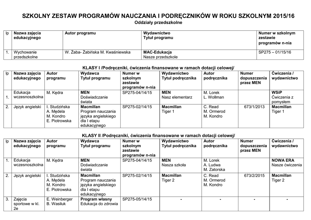 SZKOLNY ZESTAW PROGRAMÓW NAUCZANIA I PODRĘCZNIKÓW W ROKU SZKOLNYM 2015/16 Oddziały przedszkolne lp Nazwa zajęcia edukacyjnego Autor programu Wydawnictwo Tytuł programu Numer w szkolnym zestawie programów n-nia 1. Wychowanie przedszkolne W. Żaba- Żabińska M. Kwaśniewska MAC-Edukacja Nasze przedszkole SP275 – 01/15/16 KLASY I /Podręczniki, ćwiczenia finansowane w ramach dotacji celowej/ lp Nazwa zajęcia edukacyjnego Autor programu 1. Edukacja M. Kędra wczesnoszkolna 2. Język angielski I. Studzińska A. Mędela M. Kondro E. Piotrowska Wydawca Tytuł programu MEN Doświadczanie świata Macmillan Program nauczania języka angielskiego dla I etapu edukacyjnego Numer w szkolnym zestawie programów n-nia SP275-04/14/15 Wydawnictwo Tytuł podręcznika Autor podręcznika MEN Nasz elementarz M. Lorek L. Wollman SP275-02/14/15 Macmillan Tiger 1 C. Read M. Ormerod M. Kondro Numer dopuszczenia przez MEN 673/1/2013 Ćwiczenia / wydawnictwo WSiP Ćwiczenia z pomysłem Macmillan Tiger 1 KLASY II /Podręczniki, ćwiczenia finansowane w ramach dotacji celowej/ lp Nazwa zajęcia edukacyjnego 1. Edukacja M. Kędra wczesnoszkolna 2. Język angielski I. Studzińska A. Mędela M. Kondro E. Piotrowska 3. Zajęcia sportowe w kl. 2e E. Weinberger B. Wasiluk Autor programu Wydawca Tytuł programu MEN Doświadczanie świata Macmillan Program nauczania języka angielskiego dla I etapu edukacyjnego Program własny Edukacja do zdrowia Numer w szkolnym zestawie programów n-nia SP275-04/14/15 Wydawnictwo Tytuł podręcznika Autor podręcznika MEN Nasza szkoła SP275-02/14/15 Macmillan Tiger 2 M. Lorek A. Ludwa M. Zatorska C. Read M. Ormerod M. Kondro SP275-05/14/15 - - Numer dopuszczenia przez MEN Ćwiczenia / wydawnictwo NOWA ERA Nasze ćwiczenia 673/2/2015 - Macmillan Tiger 2 - KLASY III lp Nazwa zajęcia edukacyjnego 1. Edukacja A. Korcz wczesnoszkolna D. Zagrodzka 3. Język angielski lp Nazwa przedmiotu Autor programu Wydawnictwo Tytuł programu Numer w Wydawnictwo szkolnym Tytuł podręcznika zestawie programów n-nia 1. Język polski A. Klimowicz K. Brząkalik NOWA ERA Teraz polski SP275-02/13/14 NOWA ERA Teraz polski! 4 + ćwiczenia A. Klimowicz 538/1/2012 2. Historia T. Maćkowski NOWA ERA Wczoraj i dziś SP275-05/12/13 NOWA ERA Wczoraj i dziś 4+ zeszyt ćwiczeń G. Wojciechowski 443/1/2012 3. Język angielski M. Ellis A. Rak OXFORD Program nauczania języka angielskiego II etap edukacyjny SP275-06/12/13 OXFORD Steps Forward 1+ ćwiczenia 741/1/2015 4. Matematyka H. Lewicka M. Kowalczyk WSiP Matematyka wokół nas SP275-02/15/16 WSiP Matematyka wokół nas 4 + zeszyty ćwiczeń T. Falla P.A. Davies S. Wheeldon P. Shipton E. Palczak H. Lewicka M. Kowalczyk 5. Przyroda U. Depczyk B. Sienkiewicz H. Binkiewicz WSiP Przyroda z pomysłem SP275-08/12/13 WSiP Przyroda z pomysłem kl. 4 cz.1 i 2 +zeszyty ćwiczeń U. Depczyk B. Sienkiewicz 604/1/2012 Autor programu A. Mędela I. Studzińska Autor podręcznika Numer dopuszczenia przez MEN Wydawnictwo Tytuł programu Numer w Wydawnictwo szkolnym Tytuł podręcznika zestawie programów n-nia Edukacja Polska Witaj Szkoło SP275-01/12/13 Edukacja Polska Witaj szkoło! – kl.3 (pakiet) A. Korcz D. Zagrodzka 59/4/2011 Macmillan Program nauczania jęz. angielskiego kurs dla początkujących w kl.1-3 szkoły podstawowej. SP275-04/10/11 Macmillan Bugs 3 World – wersja A z elementami pisania + zeszyty ćwiczeń C. Read, A. Soberon 30/3/2011 KLASY IV /Podręczniki, ćwiczenia finansowane w ramach dotacji celowej/ Autor podręcznika Numer dopuszczenia przez MEN 275/1/2010 6. Muzyka T. Wójcik MAC-Edukacja Muzyczny świat – program nauczania muzyki w kl. 4-6 SP275-09/12/13 MAC-Edukacja Muzyczny świat 4 + zeszyt ćwiczeń T .Wójcik 495/1/2012 7. Plastyka A. Przybyszewska – Pietrasiak SP275-10/12/13 MAC-Edukacja Lubię tworzyć klasa 4 + zeszyt ćwiczeń M. Kwiecień W. Sygut 397/1/2011 8. Zajęcia techniczne M. Czuj MAC-Edukacja Plastyka – program nauczania dla klas 4-6 szkoły podstawowej Lubię tworzyć MAC-Edukacja Lubię technikę SP275-03/15/16 MAC-Edukacja Lubię technikę+ ćwiczenia M. Czuj 752/1/2015 WSiP Zajęcia komputerowe – Lekcje z komputerem SP275-04/15/16 WSiP Lekcje z komputerem 4 W. O. FOSZE Ruch – zdrowie dla każdego SP275-29/11/12 W. Jochemczyk 453/1/2012 I. Krajewska-Kranas W. Kranas A. Samulska M. Wyczółkowski - 9. W. Jochemczyk Zajęcia komputerowe 10. WF I. Krajewska-Kranas W. Kranas A. Samulska M. Wyczółkowski Stanisław Żołyński - KLASY V lp Nazwa przedmiotu Autor programu Wydawnictwo Tytuł programu Numer w szkolnym zestawie programów n-nia SP275-02/13/14 1. Język polski A. Klimowicz K. Brząkalik NOWA ERA Teraz polski 2. Historia T. Maćkowski NOWA ERA Wczoraj i dziś SP275-05/12/13 3. Język angielski M. Ellis A. Rak OXFORD Program nauczania języka angielskiego II etap edukacyjny SP275-06/12/13 4. Matematyka M. Jucewicz M. Karpiński, J. Lech GWO Matematyka z plusem SP275-07/12/13 Wydawnictwo Tytuł podręcznika Autor podręcznika Numer dopuszczenia przez MEN NOWA ERA Teraz polski! 5 + ćwiczenia NOWA ERA Wczoraj i dziś 5 + zeszyt ćwiczeń OXFORD Steps in English 2 + ćwiczenia A. Klimowicz 538/2/2013 G. Wojciechowski 443/2/2013 T. Falla P.A. Davies 302/2/2011 GWO Matematyka 5 +zeszyty ćwiczeń M. Dobrowolska M. Jucewicz M. Karpiński P. Zarzycki 340/2/2013 5. Przyroda U. Depczyk B. Sienkiewicz H. Binkiewicz T. Wójcik 6. Muzyka 7. Plastyka A. Przybyszewska – Pietrasiak 8. Zajęcia techniczne L. Łabęcki M. Łabęcka 9. Zajęcia komputerowe D i K. Kiałka 10. WF S. Żołyński 11. WF – kl 5d B. Wasiluk 12. Wychowanie do T. Król życia w rodzinie K. Maśnik G. Węglarczyk WSiP Przyroda z pomysłem SP275-08/12/13 MAC - Edukacja SP275-09/12/13 Muzyczny świat – program nauczania muzyki w kl. 4-6 MAC - Edukacja SP275-10/12/13 Plastyka – program nauczania dla klas 4-6 szkoły podstawowejLubię tworzyć NOWA ERA SP275-11/12/13 Jak to działa – program zajęć technicznych w klasach 4-6 szkoły podstawowe