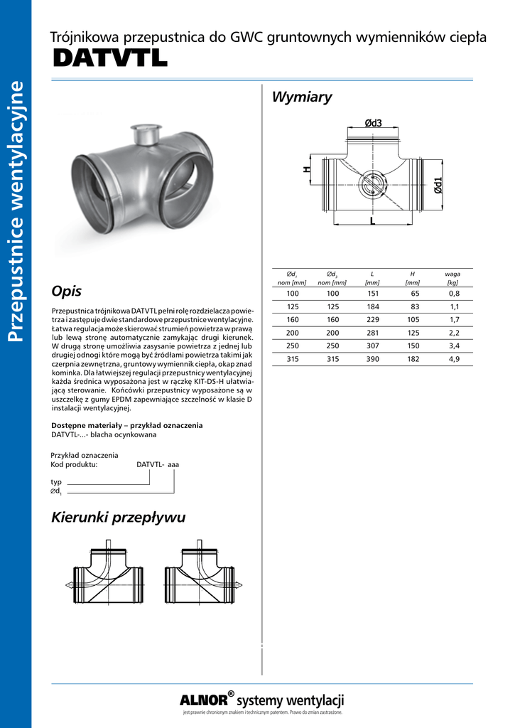 Trójnikowa przepustnica do GWC gruntownych wymienników ciepła Pobierz Wentyle Przepustnice wentylacyjne DATVTL Pobierz AlnorCAM Zamawiaj w B2B Wymiary Opis Przepustnica trójnikowa DATVTL pełni rolę rozdzielacza powietrza i zastępuje dwie standardowe przepustnice wentylacyjne. Łatwa regulacja może skierować strumień powietrza w prawą lub lewą stronę automatycznie zamykając drugi kierunek. W drugą stronę umożliwia zasysanie powietrza z jednej lub drugiej odnogi które mogą być źródłami powietrza takimi jak czerpnia zewnętrzna, gruntowy wymiennik ciepła, okap znad kominka. Dla łatwiejszej regulacji przepustnicy wentylacyjnej każda średnica wyposażona jest w rączkę KIT-DS-H ułatwiającą sterowanie. Końcówki przepustnicy wyposażone są w uszczelkę z gumy EPDM zapewniające szczelność w klasie D instalacji wentylacyjnej. d1 nom [mm] d3 nom [mm] L [mm] H [mm] waga [kg] 100 100 151 65 0,8 125 125 184 83 1,1 160 160 229 105 1,7 200 200 281 125 2,2 250 250 307 150 3,4 315 315 390 182 4,9 Dostępne materiały – przykład oznaczenia DATVTL-...- blacha ocynkowana Przykład oznaczenia Kod produktu: DATVTL- aaa typ d1 Kierunki przepływu http://www.alnor.com.pl/produkty_pl/Przepustnice-wentylacyjne.html http://www.alnor.com.pl/pro ALNOR® systemy wentylacji jest prawnie chronionym znakiem i technicznym patentem. Prawo do zmian zastrzeżone. Trójnikowa przepustnica do GWC gruntownych wymienników ciepła Pobierz Wentyle DATVTL Pobierz AlnorCAM Zamawiaj w B2B 5 31 0 25 20 0 16 5 12 0 10 0 Wymiar [mm] [ Pa ] 300 200 Spadek ciśnienia Dpt 100 50 10 5 1 10 50 50 100 100 500 500 1000 Przepływ odukty_pl/Przepustnice-wentylacyjne.html ALNOR® systemy wentylacji jest prawnie chronionym znakiem i technicznym patentem. Prawo do zmian zastrzeżone. 1000 2000 [ I/s ] 5000 [ m3/h ] Przepustnice wentylacyjne Dane techniczne