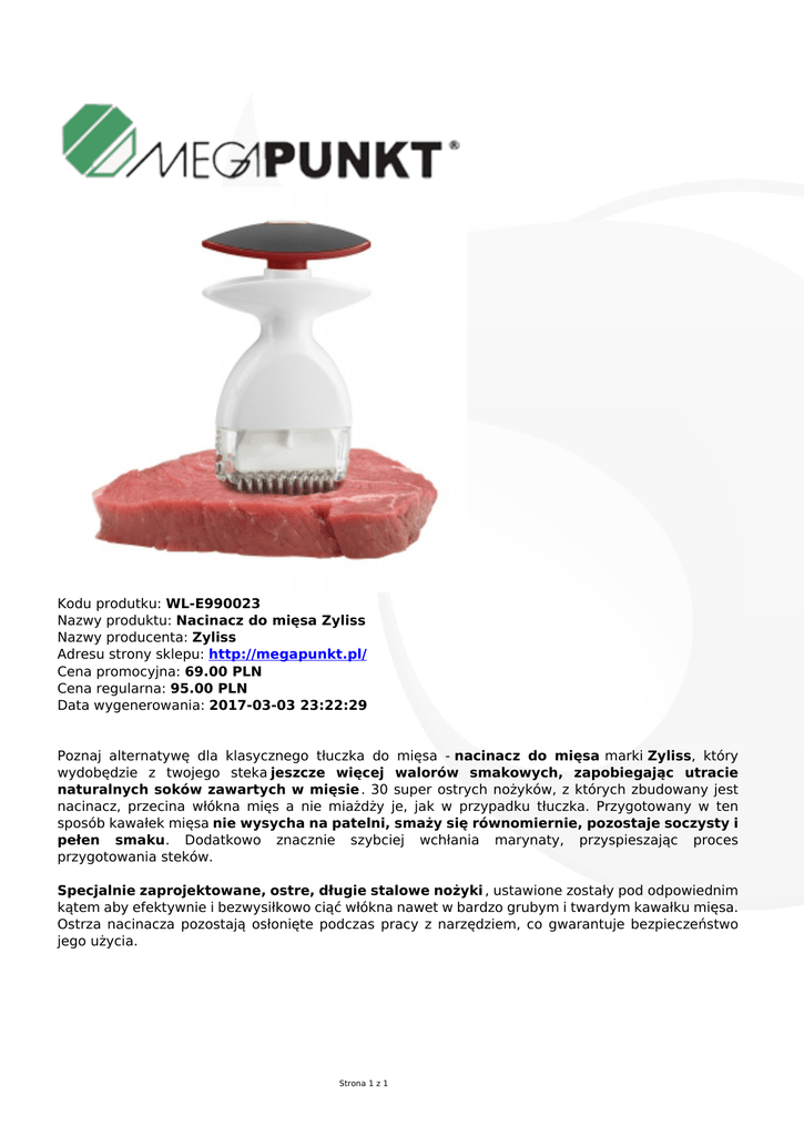 Kodu produtku: WL-E990023 Nazwy produktu: Nacinacz do mięsa Zyliss Nazwy producenta: Zyliss Adresu strony sklepu: http://megapunkt.pl/ Cena promocyjna: 69.00 PLN Cena regularna: 95.00 PLN Data wygenerowania: 2017-03-03 23:22:29 Poznaj alternatywę dla klasycznego tłuczka do mięsa - nacinacz do mięsa marki Zyliss, który wydobędzie z twojego steka jeszcze więcej walorów smakowych, zapobiegając utracie naturalnych soków zawartych w mięsie . 30 super ostrych nożyków, z których zbudowany jest nacinacz, przecina włókna mięs a nie miażdży je, jak w przypadku tłuczka. Przygotowany w ten sposób kawałek mięsa nie wysycha na patelni, smaży się równomiernie, pozostaje soczysty i pełen smaku. Dodatkowo znacznie szybciej wchłania marynaty, przyspieszając proces przygotowania steków. Specjalnie zaprojektowane, ostre, długie stalowe nożyki , ustawione zostały pod odpowiednim kątem aby efektywnie i bezwysiłkowo ciąć włókna nawet w bardzo grubym i twardym kawałku mięsa. Ostrza nacinacza pozostają osłonięte podczas pracy z narzędziem, co gwarantuje bezpieczeństwo jego użycia. Strona 1 z 1