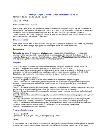 Francja - Alpe D Huez - Obóz narciarski 12-18 lat Terminy: 18.01 - 27.01, 25.01 - 03.02 Cena: od 1799 zł Wiek uczestników: 12-18 lat Alpe D'Huez jest jedną z największych stacji narciarskich w północnych Alpach francuskich. Miejscowość usytuowana na wysokości 1860 m n.p.m. Z racji swojego położenia przeważa tu słoneczna pogoda. Do naszej dyspozycji jest ok. 250 km tras narciarskich o bardzo zróżnicowanym poziomie trudności. Możemy również spróbować naszych sił na najdłuższej trasie narciarskiej na świecie " Sarenne". Zakwaterowanie Hotel Belle Aurore *** w Alpe D'Huez. Pokoje 4 i 6 -osobowe z łazienkami. Hotel usytuowany jest 50m od najbliższego wyciągu narciarskiego i 200m od centrum miasta. Świadczenia Zakwaterowanie: 7 noclegów. Wyżywienie: śniadania i obiadokolacje w restauracji hotelowej. Pierwszy posiłek: obiadokolacja w dniu przyjazdu, ostatni: śniadanie w dniu wyjazdu. Transport: autokar (klimatyzacja, video, WC). Ubezpieczenie: Signal Iduna S.A.SKI. Opieka wychowawcy/instruktora. Realizacja programu. Program Obóz skierowany dla młodzieży chcącej doskonalić bądź też rozpocząć naukę jazdy na nartach. Zajęcia na stoku odbywają się od 9:30 do 16:00 pod okiem wychowawcy/licencjonowanego instruktora (w trakcie zajęć przewidujemy krótkie przerwy połączone z możliwością zjedzenia ciepłego posiłku. Koszt takiego posiłku to 5-10 EUR). Dodatkowo po zajęciach, realizujemy wspólny program sportowo-rekreacyjny. Przykładowy program obozu: Dzień 1: Przyjazd do Alpe D"Huez, zakwaterowanie, spotkanie organizacyjne. Dzień 2: Narciarskie zajęcie programowe- podział na grupy pod względem tematycznym i poziomu zaawansowania, wieczorem dyskoteka a dla chętnych bilard, gry planszowe i komputerowe. Dzień 3: Szkolenie narciarskie w grupach, wieczorem dla chętnych wyjście do miasta, wykłady narciarskie w grupach szkoleniowych a dla chętnych wyjście na pływalnię. Dzień 4: Szkolenie narciarskie w grupach, wieczorem gry i zabawy na śniegu a dla chętnych wyjście na łyżwy. Dzień 5: Szkolenie narciarskie w grupach, wieczorem ABC serwisowania sprzętu oraz wykłady tematyczne. Dzień 6: Szkolenie narciarskie w grupach oraz dodatkowo konkurs trików "freestylowych" , wieczorem quiz z wiedzy narciarsko- snowboardowej oraz mecz " śnieżnej piłki nożnej". Dzień 7: Szkolenie narciarskie w grupach, podsumowanie zajęć oraz zawody narciarskie na tyczkach, wieczorem rozdanie nagród za zawody, konkursy i quiz, dyskoteka. Dzień 8: Po śniadaniu wyjazd do Polski. Program fakultatywny - łyżwy - 6,6 EUR, - pływalnia - 5 EUR (do 13 lat), 8 EUR (powyżej 13 lat). Uwagi W przypadku złych warunków pogodowych, złej kondycji psychofizycznej obozowiczów zajęcia programowe oraz uzupełniające mogą ulec modyfikacji. Na obóz należy zabrać ze sobą paszport/dowód osobisty, kaski ochronne, które są obowiązkowe poniżej 18 roku życia; stroje kąpielowe. Cena nie obejmuje dopłaty za transport z miast wyszczególnionych w planie podróży. Informacje praktyczne Cena karnetu: 135 EUR (przy wykupieniu obozu na min. 7 dni przed jego rozpoczęciem). Wypożyczenie sprzętu narciarskiego: w cenie zakwaterowania. Sugerowane kieszonkowe: ok. 50 EUR (nie dotyczy kosztu karnetu).