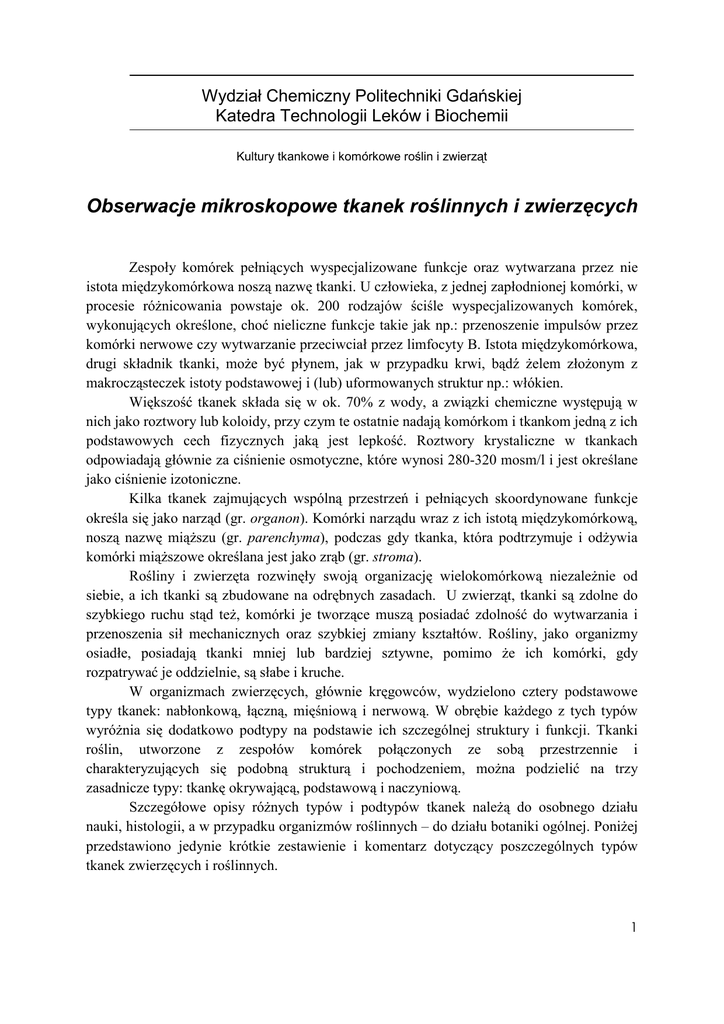 Wydział Chemiczny Politechniki Gdańskiej Katedra Technologii Leków i Biochemii Kultury tkankowe i komórkowe roślin i zwierząt Obserwacje mikroskopowe tkanek roślinnych i zwierzęcych Zespoły komórek pełniących wyspecjalizowane funkcje oraz wytwarzana przez nie istota międzykomórkowa noszą nazwę tkanki. U człowieka, z jednej zapłodnionej komórki, w procesie róŜnicowania powstaje ok. 200 rodzajów ściśle wyspecjalizowanych komórek, wykonujących określone, choć nieliczne funkcje takie jak np.: przenoszenie impulsów przez komórki nerwowe czy wytwarzanie przeciwciał przez limfocyty B. Istota międzykomórkowa, drugi składnik tkanki, moŜe być płynem, jak w przypadku krwi, bądź Ŝelem złoŜonym z makrocząsteczek istoty podstawowej i (lub) uformowanych struktur np.: włókien. Większość tkanek składa się w ok. 70% z wody, a związki chemiczne występują w nich jako roztwory lub koloidy, przy czym te ostatnie nadają komórkom i tkankom jedną z ich podstawowych cech fizycznych jaką jest lepkość. Roztwory krystaliczne w tkankach odpowiadają głównie za ciśnienie osmotyczne, które wynosi 280-320 mosm/l i jest określane jako ciśnienie izotoniczne. Kilka tkanek zajmujących wspólną przestrzeń i pełniących skoordynowane funkcje określa się jako narząd (gr. organon). Komórki narządu wraz z ich istotą międzykomórkową, noszą nazwę miąŜszu (gr. parenchyma), podczas gdy tkanka, która podtrzymuje i odŜywia komórki miąŜszowe określana jest jako zrąb (gr. stroma). Rośliny i zwierzęta rozwinęły swoją organizację wielokomórkową niezaleŜnie od siebie, a ich tkanki są zbudowane na odrębnych zasadach. U zwierząt, tkanki są zdolne do szybkiego ruchu stąd teŜ, komórki je tworzące muszą posiadać zdolność do wytwarzania i przenoszenia sił mechanicznych oraz szybkiej zmiany kształtów. Rośliny, jako organizmy osiadłe, posiadają tkanki mniej lub bardziej sztywne, pomimo Ŝe ich komórki, gdy rozpatrywać je oddzielnie, są słabe i kruche. W organizmach zwierzęcych, głównie kręgowców, wydzielono cztery podstawowe typy tkanek: nabłonkową, łączną, mięśniową i nerwową. W obrębie kaŜdego z tych typów wyróŜnia się dodatkowo podtypy na podstawie ich szczególnej struktury i funkcji. Tkanki roślin, utworzone z zespołów komórek połączonych ze sobą przestrzennie i charakteryzujących się podobną strukturą i pochodzeniem, moŜna podzielić na trzy zasadnicze typy: tkankę okrywającą, podstawową i naczyniową. Szczegółowe opisy róŜnych typów i podtypów tkanek naleŜą do osobnego działu nauki, histologii, a w przypadku organizmów roślinnych – do działu botaniki ogólnej. PoniŜej przedstawiono jedynie krótkie zestawienie i komentarz dotyczący poszczególnych typów tkanek zwierzęcych i roślinnych. 1 1. Tkanki zwierzęce. 1.1. Tkanka nabłonkowa. Komórki nabłonkowe stanowią niezwykle urozmaiconą grupę róŜniącą się pochodzeniem (ektodermalnym, entodermalnym lub mezodermalnym), strukturą i funkcją. Nabłonki są układem ściśle upakowanych komórek, z bardzo skąpą istotą międzykomórkową, przez co stanowią nieprzepuszczalną barierę dla cieczy. Komórki nabłonkowe wyściełają powierzchnię ciała, jamy ciała, kanały wyprowadzające oraz budują róŜnego rodzaju gruczoły. Tkanki nabłonkowe klasyfikuje się według trzech podstawowych kryteriów: 1) liczby warstw komórek (nabłonek jednowarstwowy, wielowarstwowy i pseudowielowarstwowy); 2) kształtu komórek (nabłonek płaski, kubiczny, cylindryczny; 3) specjalizacji powierzchni komórek nabłonka (nabłonek orzęsiony, nieorzęsiony, zrogowaciały). Główne funkcje nabłonków to: 1) Mechaniczna ochrona tkanek leŜących pod nabłonkiem (np. nabłonek skóry); 2) izolacja róŜnych środowisk od siebie, dzięki czemu zostają zachowane róŜnice chemiczne i fizyczne między tymi środowiskami; przy uszkodzeniu takiej izolacji (np. w skutek oparzenia) dochodzi do ucieczki wody z tkanek na zewnątrz, co moŜe powodować odwodnienie i śmierć organizmu; 3) wchłanianie (absorpcja) róŜnych związków chemicznych i gazów co stanowi podstawę przyswajania substancji odŜywczych i wymiany gazowej; 4) wydzielanie (sekrecja) związków chemicznych wytwarzanych lub modyfikowanych w komórkach nabłonkowych. Nabłonki znajdują się na podłoŜu tkanki łącznej właściwej, z którą łączą się przez wyspecjalizowaną strukturę zwaną błoną podstawną. Za jej pomocą nabłonek: 1) mechanicznie łączy się z podłoŜem, 2) transportuje substancje odŜywcze i metabolity do i z naczyń krwionośnych tkanki łącznej, co stanowi sposób odŜywiania nabłonka pozbawionego własnych naczyń krwionośnych, oraz 3) zachowuje kształt swoich komórek. Z uwagi na pełnione funkcje wchłaniania, transportu i oddzielania od siebie róŜnych środowisk, komórki nabłonkowe wykształciły na swoich powierzchniach: wolnej, bocznych i podstawnej wyspecjalizowane struktury. Na wolnej powierzchni komórki nabłonkowe wykształcają wypustki w postaci mikrokosmków czy rzęsek. Na powierzchniach bocznych, komórki tworzą połączenia, które spajają je między sobą oraz słuŜą przenikaniu jonów i cząstek między sąsiadującymi komórkami. Z kolei na powierzchni podstawnej tworzą się wgłębienia oraz struktury spajające komórki nabłonkowe z podłoŜem tzw. hemidezmosomy. Komórki nabłonkowe z uwagi na intensywnie prowadzone funkcje transportu przez błony, wydzielania i wchłaniania, szybko się zuŜywają, opuszczają nabłonek przez złuszczanie i są zastępowane nowymi komórkami, przy czym sam proces odnowy nabłonków przebiega z udziałem komórek macierzystych. 2 1.2. Tkanka łączna. Tkanka łączna zapewnia strukturalną i metaboliczną bazę dla wszystkich narządów organizmu. Jest podścieliskiem dla naczyń krwionośnych i pośredniczy w wymianie produktów metabolizmu oraz składników odŜy