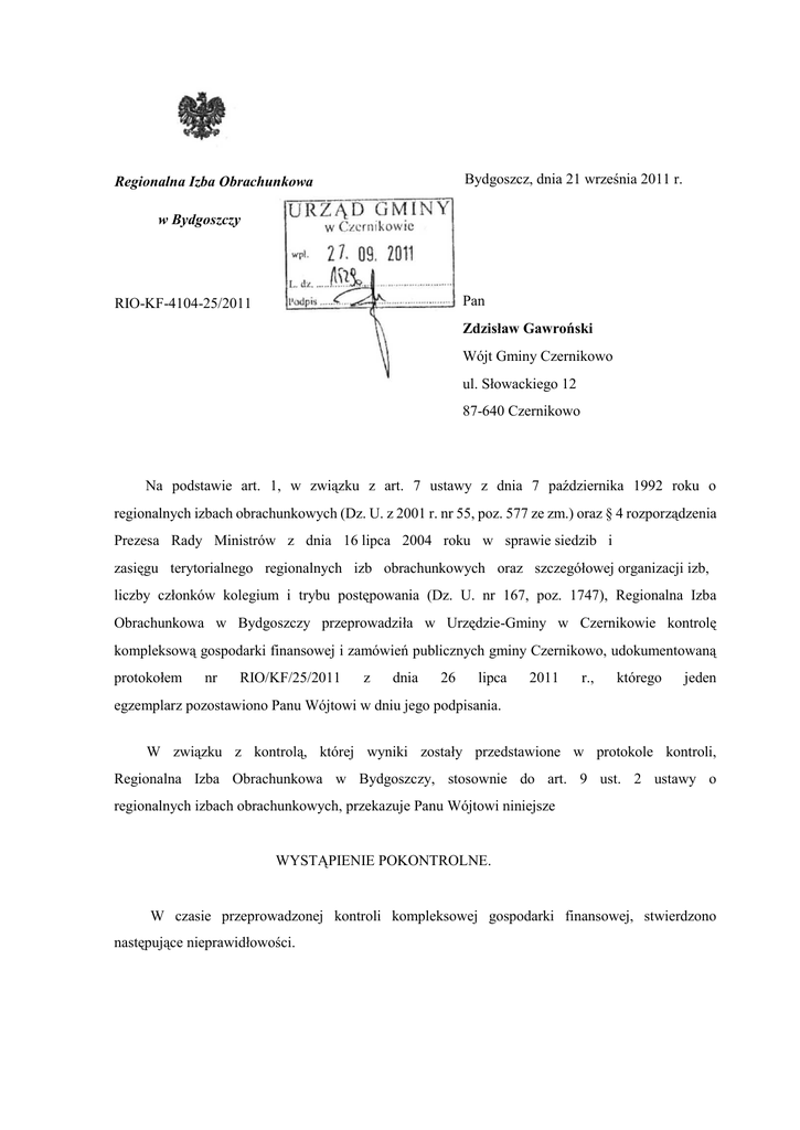 Bydgoszcz, dnia 21 września 2011 r. Regionalna Izba Obrachunkowa w Bydgoszczy Pan RIO-KF-4104-25/2011 Zdzisław Gawroński Wójt Gminy Czernikowo ul. Słowackiego 12 87-640 Czernikowo Na podstawie art. 1, w związku z art. 7 ustawy z dnia 7 października 1992 roku o regionalnych izbach obrachunkowych (Dz. U. z 2001 r. nr 55, poz. 577 ze zm.) oraz § 4 rozporządzenia Prezesa Rady Ministrów z dnia 16 lipca 2004 roku w sprawie siedzib i zasięgu terytorialnego regionalnych izb obrachunkowych oraz szczegółowej organizacji izb, liczby członków kolegium i trybu postępowania (Dz. U. nr 167, poz. 1747), Regionalna Izba Obrachunkowa w Bydgoszczy przeprowadziła w Urzędzie-Gminy w Czernikowie kontrolę kompleksową gospodarki finansowej i zamówień publicznych gminy Czernikowo, udokumentowaną protokołem nr RIO/KF/25/2011 z dnia 26 lipca 2011 r., którego jeden egzemplarz pozostawiono Panu Wójtowi w dniu jego podpisania. W związku z kontrolą, której wyniki zostały przedstawione w protokole kontroli, Regionalna Izba Obrachunkowa w Bydgoszczy, stosownie do art. 9 ust. 2 ustawy o regionalnych izbach obrachunkowych, przekazuje Panu Wójtowi niniejsze WYSTĄPIENIE POKONTROLNE. W czasie przeprowadzonej kontroli kompleksowej gospodarki finansowej, stwierdzono następujące nieprawidłowości. W związku ze stwierdzonymi nieprawidłowościami, które nie zostały usunięte w trakcie wykonywania czynności kontrolnych, proszę Pana Wójta o podjęcie działań, które wyeliminują wszystkie nieprawidłowości z prac podległych służb, usprawnią ich działalność oraz zapobiegną ich powstawaniu w przyszłości. Wobec powyższego proszę o: 1. Dokonywanie wydatków w granicach kwot ujętych w planie finansowym, zgodnie z zasadami wydatkowania środków publicznych, określonymi w art. 44 ust. 1 pkt 3, art. 52 ust. 1 pkt 2 oraz art. 254 pkt 3 ustawy z dnia 27 sierpnia 2009 r. o finansach publicznych (Dz. U. nr 157, poz.'1240 ze zm.). 2. Prawidłowe udzielanie dotacji celowej podmiotom niezaliczanym do sektora finansów publicznych na zadania publiczne, o których mowa w art. 7 ust. 1 ustawy z dnia 8 marca 1990 r. o samorządzie gminnym (j.t.: Dz.U. z 2001 r. nr 142, poz. 1591 ze zm.), poprzez • przestrzeganie zasad i trybu, wynikających z przepisów art. 221 ust. 2 ustawy z dnia 27 sierpnia 2009 r. o finansach publicznych (Dz.U. nr 157, poz. 1240 ze zm.), • rozliczanie przekazanych dotacji, dokonując merytorycznej, formalnej i rachunkowej kontroli dokumentów przekazanych przez podmiot, który dotację otrzymał, na 27 podstawie przepisów art. 17 ustawy z dnia 24 kwietnia 2003 r. o działalności pożytku publicznego i o wolontariacie (j.t. Dz.U. z 2010 r. nr 234, poz. 1536 ze zm.), • ustalanie kwoty podlegającej zwrotowi do budżetu gminy, w przypadku udzielenia dotacji bez podstawy prawnej lub wykorzystanej przez beneficjenta niezgodnie z przeznaczeniem, zgodnie z przepisami art. 252 ustawy o finansach publicznych. 3. Udzielanie dotacji uprzednim odrębnej przedmiotowej ustaleniu uchwały, przez która Radę jest dla samorządowego Gminy aktem stawek prawnym zakładu dotacji budżetowego, przedmiotowych odrębnym od uchwały w po formie budżetowej, warunkującym dopuszczalność udzielania dotacji przedmiotowej i określania zakresu i kwot tych dotacji w uchwale budżetowej, stosownie do przepisów art. 219 ust. 1, 3 i 4 ustawy z o finansach publicznych. 4. Udzielanie dotacji stanowiących pomoc finansową dla innych jednostek samorządu terytorialnego, wyłącznie po uprzednim podjęciu przez Radę Gminy uchwały w sprawie tej pomocy, stosownie do unormowań zawartych w art. 216 ust.2 pkt. 5, w związku z art. 220 ust. 1 i 2 ustawy o finansach publicznych. 5. Gospodarowanie nieruchomościami Gminy Czernikowo w sposób zgodny z zasadami prawidłowej gospodarki, poprzez ustalanie i dochodzenie kwoty dopłaty w wysokości różnicy wartości zamienianych nieruchomości, stosownie do przepisu art. 15 ust. 1 ustawy z dnia 21 sierpnia 1997 r. o gospodarce nieruchomościami (j.t.: Dz. U. z 2010 r. nr 102, poz. 651 ze zm.) oraz zaprzestanie kompensowania wydatków na inwestycje, należnymi dochodami z tytułu zamiany nieruchomości o różnej wartości, zgodnie zasadą niefunduszowania, o której mowa w przepisach art. 42 ust. 2 ustawy o finansach publicznych. 6. Podjęcie działań, mających na celu wyegzekwowanie od drugiej strony umowy zamiany nieruchomości, zawartej w dniu 11 maja 2009 r. w formie aktu notarialnego, obowiązku przedłożenia dokumentów, potwierdzających wykonanie na własny koszt utwardzonego parkingu na nabytych działkach, w zamian za dokonanie na rzecz budżetu gminy dopłaty w wysokości różnicy wartości zamienianych nieruchomości gruntowych. 7. Zaprzestanie księgowej jednostki prowadzenia Gminnego przez Ośrodka do prowadzenia Urząd Pomocy rachunkowości Gminy w Społecznej Czernikowie i obsługi zobowiązanie we własnym zakresie, finansowo- Kierownika biorąc tej pod uwagę przepisy art. 4 ust. 1 i 2 ustawy o rachunkowości, w związku z art.2 ust. 1 pkt. 4 lit. „a" tej 28 ustawy oraz do zatrudnienia głównego księgowego, na podstawie przepisów art.53 ust.2, w związku z art.54 ust.l ustawy z dnia 27 sierpnia 2009 r. o finansach publicznych (Dz. U. nr 157, poz. 1240), według którego, kierownik jednostki sektora finansów publicznych może powierzyć obowiązki w zakresie prowadzenia rachunkowości, wyłącznie głównemu księgowemu, będącemu pracownikiem tej jednostki. 8. Zobowiązanie Kierownika Gminnej Biblioteki Publicznej w Czernikowie do zatrudnienia głównego księgowego, którym, zgodnie z przepisami art.54 ust. l ustawy o finansach publicznych, może być wyłącznie pracownik jednostki sektora finansów publicznych, wykonujący obowiązki głównego księgowego, powierzone przez jej Kierownika i który pownosi odpowiedzialność za prawidłowe ich wykonywanie. 9. Rzetelne i prawidłowe sporządzanie sprawozdań budżetowych R