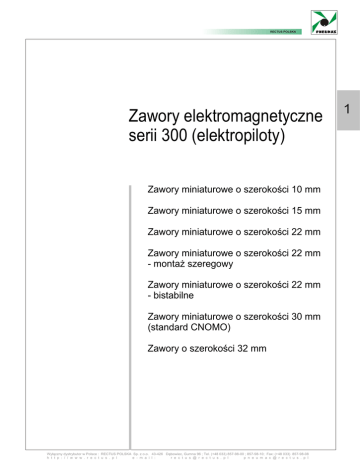 RECTUS POLSKA Zawory elektromagnetyczne serii 300 (elektropiloty) Zawory miniaturowe o szerokoœci 10 mm Zawory miniaturowe o szerokoœci 15 mm Zawory miniaturowe o szerokoœci 22 mm Zawory miniaturowe o szerokoœci 22 mm - monta¿ szeregowy Zawory miniaturowe o szerokoœci 22 mm - bistabilne Zawory miniaturowe o szerokoœci 30 mm (standard CNOMO) Zawory o szerokoœci 32 mm Wy³¹czny dystrybutor w Polsce : RECTUS POLSKA Sp. z o.o. 43-426 Dêbowiec, Gumna 96 ; Tel. (+48 033) 857-98-00 ; 857-98-10; Fax: (+48 033) 857-98-08 h t t p : / / w w w . r e c t u s . p l e - m a i l : r e c t u s @ r e c t u s . p l p n e u m a x @ r e c t u s . p l 1 Zawory elektromagnetyczne sterowane bezpoœrednio Seria 300 RECTUS POLSKA Wstêp Zawory elektromagnetyczne sterowane bezpoœrednio sprzêgaj¹ elektronikê z pneumatyk¹. Sterowane sygna³em elektrycznym pozwalaj¹ na wyjœciu otrzymaæ sygna³ pneumatyczny mog¹cy byæ wykorzystany przez mniejsze elementy wykonawcze (ma³e si³owniki). Najczêstszym zastosowaniem zaworów elektromagnetycznych serii 300 jest sterowanie wiêkszymi rozdzielaczami pneumatycznymi. Firma PNEUMAX oferuje szerok¹ gamê zaworów elektromagnetycznych (pilotów) dla szeregu zastosowañ. Od miniaturowych zaworów 2/2 i 3/2 normalnie zamkniêtych lub otwartych do zaworów 32 mm przystosowanych do sterowania wiêkszych zaworów. Nale¿y zauwa¿yæ, ¿e zawory elektromagnetyczne (piloty ) mo¿na stosowaæ do bezpoœredniego sterowania mniejszymi odbiornikami (np. si³ownikiem ze sprê¿yn¹) poprzez dopasowanie odpowiedniej bazy (indywidualnej lub grupowej, z przy³¹czami pd w¹¿ 4mm, gwint M5 lub G 1/8) Zawory elektromagnetyczne wystêpuj¹ równie¿ w wersjach z homologacj¹ wa¿n¹ w USA i Kanadzie. ( w razie takiej potrzeby prosimy o skierowanie zapytania do firmy Rectus Polska ). Obs³uga i u¿ytkowanie Specjalna obs³uga nie jest wymagana, dlatego nie podano listy czêœci zamiennych. Z³o¿ona konstrukcja zaworów i ich niski koszt, wysokie koszty robocizny czyni¹ naprawê ekonomicznie nieop³acaln¹. Bardziej op³acalna jest wymiana kompletnego zaworu. Dla w³aœciwego smarowania nale¿y u¿ywaæ tylko olei hydraulicznych klasy H np. Castrol typu MAGNA GC 32. 1.1 Wy³¹czny dystrybutor w Polsce : RECTUS POLSKA Sp. z o.o. 43-426 Dêbowiec, Gumna 96 ; Tel. (+48 033) 857-98-00 ; 857-98-10; Fax: (+48 033) 857-98-08 h t t p : / / w w w . r e c t u s . p l e - m a i l : r e c t u s @ r e c t u s . p l p n e u m a x @ r e c t u s . p l Seria 300 Zawory elektromagnetyczne sterowane bezpoœrednio miniaturowe o szerokoœci 10 mm. RECTUS POLSKA Opis Ma³e rozmiary, mo¿liwoœæ monta¿u pojedynczego lub grupowego równie¿ w w¹skich miejscach, szybkie i o du¿ym przep³ywie pozwalaj¹ na szerokie zastosowanie, tak¿e z innymi mediami. Wersje 3/2 N.C. i N.O., 2/2 N.C. zasilane 12 lub 24 VDC. 1 Schemat dzia³ania Normalnie Otwarty (N.O.) 3/2 Normalnie Zamkniêty (N.Z.) 3/2 Normalnie Zamkniêty (N.Z.) 2/2 1 = WEJŒCIE 2 = WYJŒCIE 3 = ODPOWIETRZENIE 1 3 2 1 3 2 3 1 2 AKTYWNY W SPOCZYNKU 3 1 2 AKTYWNY W SPOCZYNKU 2 3 Budowa: 1 3 1 1 2 2 AKTYWNY W SPOCZYNKU 2 2 1 1 Czêœæ elektryczna : Miniaturowa cewka wykonana z drutu nawojowego o œrednicy zale¿nej od napiêcia, w klasie izolacji F. Wszystkie elementy s¹ zabezpieczone przeciw korozji . Po³¹czenie elektryczne realizowane poprzez wtyczkê lub poprzez przewody. Czêœæ mechaniczna : Rdzeñ cewki wykonany ze stali AISI 430F, sprê¿yny ze stali AISI 302, uszczelnienia z gumy NBR , korpus z tworzwa . Zawory miniaturowe s¹ stosowane razem z bazami indywidualnymi lub wielozaworowymi (praca bezpoœrednia - np.sterowanie ma³ymi si³ownikami) lub bezpoœrednio: na zaworach i rozdzielaczach pneumatycznych (jako elektropiloty). Dane technicze: Pneumatyka: Czêœæ elektryczna: Ciœnienie robocze : Œrednica nominalna: Temperatura pracy : Przep³yw przy 6 barach i spadku 1 bar: Przep³yw na wylocie: Maks. iloœæ cykli na minutê: Œredni czas bezawaryjnej pracy: Napiêcia: Moc: Tolerancja napiêcia: Czas odpowiedzi na impuls steruj¹cy: Czas odpowiedzi na zanik sygna³u steruj¹cego: Klasa izolacji przewodów na cewce: Stopieñ zabezpieczenia elektrycznego: 0 - 7 bar 0,7 mm -5°C do + 50°C 14 Nl/min 22 Nl/min 2700 50 milionów cykli 12 - 24 VDC 1,3 W -5% +10% 8 ms 10 ms : F (155°C) IP40 - IP65 (z przewodem) IP 00 ( z wtyczk¹) Wy³¹czny dystrybutor w Polsce : RECTUS POLSKA Sp. z o.o. 43-426 Dêbowiec, Gumna 96 ; Tel. (+48 033) 857-98-00 ; 857-98-10; Fax: (+48 033) 857-98-08 h t t p : / / w w w . r e c t u s . p l e - m a i l : r e c t u s @ r e c t u s . p l p n e u m a x @ r e c t u s . p l 1.2 Zawory elektromagnetyczne miniaturowe, sterowane bezpoœrednio, o szerokoœci 10 mm. Seria 300 RECTUS POLSKA Kod zamówieniowy: N3 __ __ . __ 6 = 2/2 N.Z. 7 = 3/2 N.Z. 8 = 3/2 N.O. 1 = 24 V D.C. 2 = 12 V D.C. 4 = 6 V D.C. 1 = Z³¹cze pod k¹tem 90°, dioda LED 2 = Przewód 300 mm., zabezpieczenie - IP40 3 = Z³¹cze w osi zaworu, dioda LED 4 = Z³¹cze pod k¹tem 90°, bez diody LED 5 = Z³¹cze w osi zaworu, bez diody LED 32=Przewód 300 mm., zabezpieczenie - IP 64 6 6 27.2 M1.7x0.35 Miniaturowy elektrozawór 10 mm z przewodem 300mm 6.5 2 13 6.5 Waga: 12 g Miniaturowy elektrozawór 10 mm Z³¹cze pod k¹tem 90° 6 M1.7x0.35 27.2 22.8 2 13 6.5 Waga: 12 g Miniaturowy elektrozawór 10 mm Z³¹cze w osi zaworu 6 M1.7x0.35 31.9 21.1 2 13 Waga: 12 g Wtyk z przewodem kod zamówieniowy 371 . __ 300 - przewód 300 mm 600 - przewód 600 mm 1000 - przewód 1000 mm Waga: 3 g 1.3 Wy³¹czny dystrybutor w Polsce : RECTUS POLSKA Sp. z o.o. 43-426 Dêbowiec, Gumna 96 ; Tel. (+48 033) 857-98-00 ; 857-98-10; Fax: (+48 033) 857-98-08 h t t p : / / w w w . r e c t u s . p l e - m a i l : r e c t u s @ r e c t u s . p l p n e u m a x @ r e c t u s . p l 6.5 Seria 300 Zawory elektromagnetyczne miniaturowe, sterowane bezpoœrednio, o szerokoœci 10 mm. RECTUS POLSKA Baza indywidualna 3,5 3,5 11 2 1 11 18 3,5 ¨6 395.01 3 ¨3,25 M5 kod zamówieniowy 3,5 1 Waga: