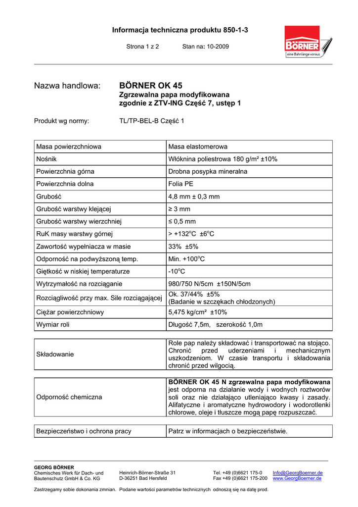 Informacja techniczna produktu 850-1-3 Strona 1 z 2 Nazwa handlowa: Stan na: 10-2009 BÖRNER OK 45 Zgrzewalna papa modyfikowana zgodnie z ZTV-ING Część 7, ustęp 1 Produkt wg normy: TL/TP-BEL-B Część 1 Masa powierzchniowa Masa elastomerowa Nośnik Włóknina poliestrowa 180 g/m² ±10% Powierzchnia górna Drobna posypka mineralna Powierzchnia dolna Folia PE Grubość 4,8 mm ± 0,3 mm Grubość warstwy klejącej ≥ 3 mm Grubość warstwy wierzchniej ≤ 0,5 mm RuK masy warstwy górnej > +132oC ±6oC Zawortość wypełniacza w masie 33% ±5% Odporność na podwyższoną temp. Min. +100oC Giętkość w niskiej temperaturze -10oC Wytrzymałość na rozciąganie 980/750 N/5cm ±150N/5cm Rozciągliwość przy max. Sile rozciągającej Ok. 37/44% ±5% (Badanie w szczękach chłodzonych) Ciężar powierzchniowy 5,475 kg/cm² ±10% Wymiar roli Długość 7,5m, szerokość 1,0m Składowanie Role pap należy składować i transportować na stojąco. Chronić przed uderzeniami i mechanicznym uszkodzeniom. W czasie transportu i składowania chronić przed wilgocią. Odporność chemiczna BÖRNER OK 45 N zgrzewalna papa modyfikowana jest odporna na działanie wody i wodnych roztworów soli oraz nie działająco utleniająco kwasy i zasady. Alifatyczne i aromatyczne hydrowodory i wodorotlenki chlorowe, oleje i tłuszcze mogą papę rozpuszczać. Bezpieczeństwo i ochrona pracy Patrz w informacjach o bezpieczeństwie. GEORG BÖRNER Chemisches Werk für Dach- und Bautenschutz GmbH & Co. KG Heinrich-Börner-Straße 31 D-36251 Bad Hersfeld Tel. +49 (0)6621 175-0 Fax +49 (0)6621 175-200 Zastrzegamy sobie dokonania zmnian. Podane wartości parametrów technicznych odnoszą się na datę prod. [email protected] www.GeorgBoerner.de Informacja techniczna produktu 850-1-3 Strona 2 z 2 Stan na: 10-2009 Informacja dla klientow: Przeznaczenie BÖRNER OK 45 papa zgrzewalna modyfikowana jest przeznaczona do jednowarstwowego systemu uszczelnienia płyt betonowych mostów zgodnie z ZTV-ING część 7, ustęp 1 w połączeniu z warstwą ochronną z masy asfaltowej i powłoki pokrycia z masy betonowo-asfaltowej lub aspaltowej masy grysowej do uszczelnienia z np. powierzchni parkingów, powierzni podwórzowo-piwnicznych itp odpowiadających Normie DIN 18195 część 5 w połączeniu z masą asfaltową. BÖRNER OK 45 papa zgrzewalna modyfikowana jest zgrzewalną papą modyfukowaną z wysokopołożonym nośnikiem poliestrowym. Termicznie stabilna włóknina poliestrowa w połączeniu ze specjalną masą bituminu modyfikowanego zapobiega negatywnym skutkom mieszania się ochronnej warstwy masy asfaltowej z masą warstwy wierzchniej papy. Dodatkowe naklejanie na zakładki wzdłużne i poprzeczne nie jest koniecznym. Przerób Przerób papy bitumicznej modyfikowanej BÖRNER OK 45 na płytach betonowych mostów wykonywać zgodnie ze wymogami TL/TP-BEL B część 1. Przy wykonywaniu izolacji np. płyt parkingów, płyt powierzchni podwórzowo-piwnicznych itd., należy przestrzegać przepisy wynikające z normy DIN 18195. Uwagi Przy wykonywaniu izolacji konstrukcji specjalnej w kombinacji z jednowarstwową powłoką ochronnokryjącą z masy asfaltowej mogą się zakładki papy bitumicznej modyfikowanej BÖRNER OK 45 odznaczać oraz/lub jest możliwym powstawanie wypukłości lub wgłębień masy asfaltowej w tych miejscach. GEORG BÖRNER Chemisches Werk für Dach- und Bautenschutz GmbH & Co. KG Heinrich-Börner-Straße 31 D-36251 Bad Hersfeld Tel. +49 (0)6621 175-0 Fax +49 (0)6621 175-200 Zastrzegamy sobie dokonania zmnian. Podane wartości parametrów technicznych odnoszą się na datę prod. [email protected] www.GeorgBoerner.de