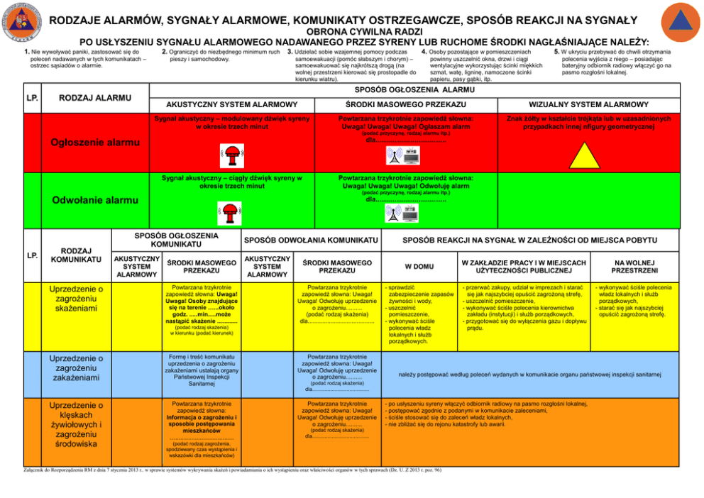 RODZAJE ALARMÓW, SYGNAŁY ALARMOWE, KOMUNIKATY OSTRZEGAWCZE, SPOSÓB REAKCJI NA SYGNAŁY OBRONA CYWILNA RADZI PO USŁYSZENIU SYGNAŁU ALARMOWEGO NADAWANEGO PRZEZ SYRENY LUB RUCHOME ŚRODKI NAGŁAŚNIAJĄCE NALEŻY: 1. Nie wywoływać paniki, zastosować się do 2. Ograniczyć do niezbędnego minimum ruch poleceń nadawanych w tych komunikatach – ostrzec sąsiadów o alarmie. 3. Udzielać sobie wzajemnej pomocy podczas samoewakuacji (pomóc słabszym i chorym) – samoewakuować się najkrótszą drogą (na wolnej przestrzeni kierować się prostopadle do kierunku wiatru). pieszy i samochodowy. 4. Osoby pozostające w pomieszczeniach powinny uszczelnić okna, drzwi i ciągi wentylacyjne wykorzystując ścinki miękkich szmat, watę, ligninę, namoczone ścinki papieru, pasy gąbki, itp. 5. W ukryciu przebywać do chwili otrzymania polecenia wyjścia z niego – posiadając bateryjny odbiornik radiowy włączyć go na pasmo rozgłośni lokalnej. SPOSÓB OGŁOSZENIA ALARMU LP. RODZAJ ALARMU AKUSTYCZNY SYSTEM ALARMOWY ŚRODKI MASOWEGO PRZEKAZU WIZUALNY SYSTEM ALARMOWY Sygnał akustyczny – modulowany dźwięk syreny w okresie trzech minut Powtarzana trzykrotnie zapowiedź słowna: Uwaga! Uwaga! Uwaga! Ogłaszam alarm Znak żółty w kształcie trójkąta lub w uzasadnionych przypadkach innej nfigury geometrycznej (podać przyczynę, rodzaj alarmu itp.) 1.Ogłoszenie alarmu dla...................................... Sygnał akustyczny – ciągły dźwięk syreny w okresie trzech minut (podać przyczynę, rodzaj alarmu itp.) 2.Odwołanie alarmu LP. RODZAJ KOMUNIKATU Uprzedzenie o zagrożeniu skażeniami 1. dla...................................... SPOSÓB OGŁOSZENIA KOMUNIKATU AKUSTYCZNY SYSTEM ALARMOWY Powtarzana trzykrotnie zapowiedź słowna: Uwaga! Uwaga! Uwaga! Odwołuję alarm ŚRODKI MASOWEGO PRZEKAZU Powtarzana trzykrotnie zapowiedź słowna: Uwaga! Uwaga! Osoby znajdujące się na terenie …...około godz. .....min.....może nastąpić skażenie …......... SPOSÓB ODWOŁANIA KOMUNIKATU AKUSTYCZNY SYSTEM ALARMOWY ŚRODKI MASOWEGO PRZEKAZU Powtarzana trzykrotnie zapowiedź słowna: Uwaga! Uwaga! Odwołuję uprzedzenie o zagrożeniu.......... (podać rodzaj skażenia) dla......................................... (podać rodzaj skażenia) w kierunku (podać kierunek) Uprzedzenie o zagrożeniu 2.zakażeniami Formę i treść komunikatu uprzedzenia o zagrożeniu zakażeniami ustalają organy Państwowej Inspekcji Sanitarnej Powtarzana trzykrotnie zapowiedź słowna: Uwaga! Uwaga! Odwołuję uprzedzenie o zagrożeniu.......... Uprzedzenie o klęskach żywiołowych i 3. zagrożeniu środowiska Powtarzana trzykrotnie zapowiedź słowna: Informacja o zagrożeniu i sposobie postępowania mieszkańców ….................................... Powtarzana trzykrotnie zapowiedź słowna: Uwaga! Uwaga! Odwołuję uprzedzenie o zagrożeniu.......... SPOSÓB REAKCJI NA SYGNAŁ W ZALEŻNOŚCI OD MIEJSCA POBYTU W DOMU - sprawdzić zabezpieczenie zapasów żywności i wody, - uszczelnić pomieszczenie, - wykonywać ściśle polecenia władz lokalnych i służb porządkowych. W ZAKŁADZIE PRACY I W MIEJSCACH UŻYTECZNOŚCI PUBLICZNEJ NA WOLNEJ PRZESTRZENI - przerwać zakupy, udział w imprezach i starać się jak najszybciej opuścić zagrożoną strefę, - uszczelnić pomieszczenie, - wykonywać ściśle polecenia kierownictwa zakładu (instytucji) i służb porządkowych, - przygotować się do wyłączenia gazu i dopływu prądu. - wykonywać ściśle polecenia władz lokalnych i służb porządkowych, - starać się jak najszybciej opuścić zagrożoną strefę. należy postępować według poleceń wydanych w komunikacie organu państwowej inspekcji sanitarnej (podać rodzaj skażenia) dla......................................... - po usłyszeniu syreny włączyć odbiornik radiowy na pasmo rozgłośni lokalnej, - postępować zgodnie z podanymi w komunikacie zaleceniami, - ściśle stosować się do zaleceń władz lokalnych, - nie zbliżać się do rejonu katastrofy lub awarii. (podać rodzaj skażenia) dla......................................... (podać rodzaj zagrożenia, spodziewany czas wystąpienia i wskazówki dla mieszkańców) Załącznik do Rozporządzenia RM z dnia 7 stycznia 2013 r.. w sprawie systemów wykrywania skażeń i powiadamiania o ich wystąpieniu oraz właściwości organów w tych sprawach (Dz. U. Z 2013 r. poz. 96)