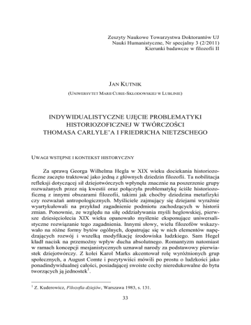 Zeszyty Naukowe Towarzystwa Doktorantów UJ Nauki Humanistyczne, Nr specjalny 3 (2/2011) Kierunki badawcze w filozofii II JAN KUTNIK (UNIWERSYTET MARII CURIE-SKŁODOWSKIEJ W LUBLINIE) INDYWIDUALISTYCZNE UJĘCIE PROBLEMATYKI HISTORIOZOFICZNEJ W TWÓRCZOŚCI THOMASA CARLYLE’A I FRIEDRICHA NIETZSCHEGO UWAGI WSTĘPNE I KONTEKST HISTORYCZNY Za sprawą Georga Wilhelma Hegla w XIX wieku dociekania historiozoficzne zaczęto traktować jako jedną z głównych dziedzin filozofii. Ta nobilitacja refleksji dotyczącej sił dziejotwórczych wpłynęła znacznie na poszerzenie grupy rozważanych przez nią kwestii oraz połączyła problematykę ściśle historiozoficzną z innymi obszarami filozofii, takimi jak choćby dziedzina metafizyki czy rozważań antropologicznych. Myśliciele zajmujący się dziejami wyraźnie wyartykułowali na przykład zagadnienie podmiotu zachodzących w historii zmian. Ponownie, ze względu na siłę oddziaływania myśli heglowskiej, pierwsze dziesięciolecia XIX wieku opanowało myślenie eksponujące uniwersalistyczne rozwiązanie tego zagadnienia. Innymi słowy, wielu filozofów wskazywało na różne formy bytów ogólnych, dopatrując się w nich elementów napędzających rozwój i wszelką modyfikację środowiska ludzkiego. Sam Hegel kładł nacisk na przemożny wpływ ducha absolutnego. Romantyzm natomiast w ramach koncepcji mesjanistycznych uznawał narody za podstawowy pierwiastek dziejotwórczy. Z kolei Karol Marks akcentował rolę wyróżnionych grup społecznych, a August Comte i pozytywiści mówili po prostu o ludzkości jako ponadindywidualnej całości, posiadającej swoiste cechy nieredukowalne do bytu tworzących ją jednostek1. 1 Z. Kuderowicz, Filozofia dziejów, Warszawa 1983, s. 131. 33 Jan Kutnik __________________________________________________________________________________________________________________________________________________________________________________________________________________________________ W kontekście romantyzmu obok mesjanizmu wyrastał także nurt opisujący człowieka skrajnie indywidualistycznie. Trend ten dostrzegał w poszczególnej i konkretnej egzystencji twór ze wszech miar bardziej pierwotny metafizycznie od wszelkich form realności ogólnych. Konsekwencją tego stanowiska była radykalna afirmacja jednostkowości, samoświadomości Ja oraz specyficzne pojmowanie ludzkiej autonomii przy możliwie najszerzej zarysowanych granicach tejże. Pod koniec pierwszej połowy XIX stulecia do „ideowej” skrajności doprowadzili tę ścieżkę pojmowania bytu ludzkiego przede wszystkim Søren Kierkegaard oraz Max Stirner. Ci dwaj autorzy praktycznie pominęli jednak w swych rozważaniach refleksję o naturze historiozoficznej. Kiedy epoka „burzy i naporu” wraz z niesionymi przez siebie na kartach manifestów ideami odeszła w przeszłość, towarzyszący jej trend indywidualistyczny w historiozofii „usamodzielnił się” i poszedł dwiema głównymi ścieżkami, prekursorskimi wobec wizji dwudziestowiecznych. Jako pierwszy w swoją własną drogę myślową wyruszył Thomas Carlyle, który był autorem ujęcia heroistycznego. Nieco później do wniosków znacznie odmiennych niż szkocki piewca bohaterstwa doszedł Fryderyk Nietzsche, który w pierwszej kolejności starał się rozpoznać, jakie pożytki mogą płynąć z historii dla konkretnej egzystencji i żywiołu życia. Zarówno Carlyle, jak i Nietzsche podchodzili do historiozofii i historii całkowicie niedogmatycznie i asystematycznie. Nie interesowało ich ujęcie teoretyczne, lecz możliwość wykorzystania refleksji poświęconej dziejom dla celów znajdujących się w sferze praxis. Stąd brało się analizowanie treści historycznych: w kategorii „pożyteczności” oraz „szkodliwości” przez Nietzschego oraz w perspektywie działania, oddającego dziejotwórczą aktywność jednostek, przez Carlyle’a. Szkot, jak najbardziej słusznie zresztą, przez znaczną część interpretatorów jest łączony ze schyłkową formą romantyzmu. Należy ponadto zaznaczyć, że był on w pierwszej kolejności historiozofem i refleksja tego typu dominowała w jego dziełach. Idee historiozoficzne wyrażane przez Carlyle’a są bardzo silnie powiązane z głoszoną przez niego metafizyką, której oś stanowiła ukuta przezeń „metafora szaty”. Dzięki tej poetyckiej przenośni starał się oddać konstatowaną dwuwarstwowość rzeczywistości. Swoją koncepcję kształtował w tym względzie pod szczególnym wpływem filozofów niemieckich, przede wszystkim Immanuela Kanta, Johanna Gottlieba Fichtego oraz Georga von Hardenberga (Novalisa). Autor Bohaterów twierdził, że świat materialno-zmysłowy jest niczym odzienie, które skrywa idealny i stały rdzeń wszelkiego istnienia. Ten drugi element bytu ujawnia się jedynie w działalności wielkich jednostek i w głoszonej przez nich nauce. Carlyle uważał, że historia to właściwie prosta suma biografii wybitnych i genialnych indywidualności, które dzięki swej twórczej mocy kształtują „wierzchnią” postać bytu duchowego i formują w pełni, jako jedyna realna siła, świat ludzkich relacji interpersonalnych. Heroizm, czyli swoiste przymioty wielkich jednostek, stanowi wedle Szkota szczególny rodzaj podmio34 Indywidualistyczne ujęcie problematyki historiozoficznej... __________________________________________________________________________________________________________________________________________________________________________________________________________________________________ towości rozwiniętej w stopniu najwyższym, który podlega w dziejach znamiennej ewolucji. Na mocy tej ewolucji jesteśmy w stanie doświadczyć sześciu następujących po sobie modeli/typów bohaterstwa. W koncepcji historiozoficznej sformułowanej przez Nietzschego na pierwszym planie znajduje się krytyczny stosunek do wiedzy historycznej oraz oryginalne pytanie o pożyteczność i