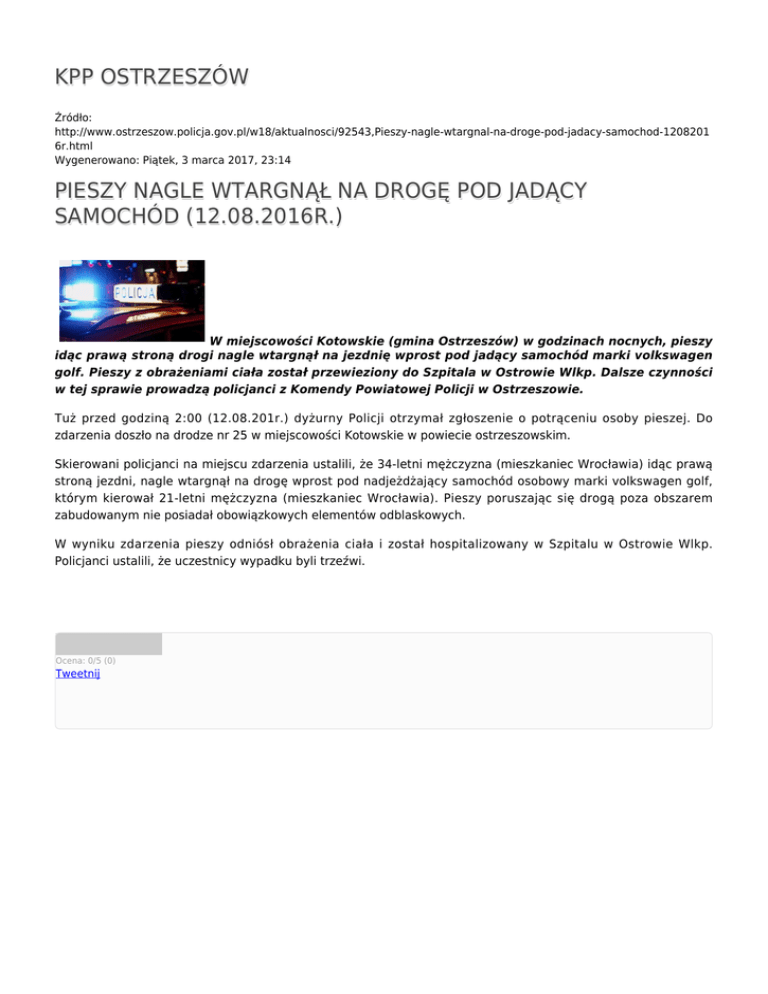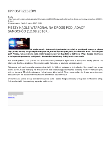 KPP OSTRZESZÓW Źródło: http://www.ostrzeszow.policja.gov.pl/w18/aktualnosci/92543,Pieszy-nagle-wtargnal-na-droge-pod-jadacy-samochod-1208201 6r.html Wygenerowano: Piątek, 3 marca 2017, 23:14 PIESZY NAGLE WTARGNĄŁ NA DROGĘ POD JADĄCY SAMOCHÓD (12.08.2016R.) W miejscowości Kotowskie (gmina Ostrzeszów) w godzinach nocnych, pieszy idąc prawą stroną drogi nagle wtargnął na jezdnię wprost pod jadący samochód marki volkswagen golf. Pieszy z obrażeniami ciała został przewieziony do Szpitala w Ostrowie Wlkp. Dalsze czynności w tej sprawie prowadzą policjanci z Komendy Powiatowej Policji w Ostrzeszowie. Tuż przed godziną 2:00 (12.08.201r.) dyżurny Policji otrzymał zgłoszenie o potrąceniu osoby pieszej. Do zdarzenia doszło na drodze nr 25 w miejscowości Kotowskie w powiecie ostrzeszowskim. Skierowani policjanci na miejscu zdarzenia ustalili, że 34-letni mężczyzna (mieszkaniec Wrocławia) idąc prawą stroną jezdni, nagle wtargnął na drogę wprost pod nadjeżdżający samochód osobowy marki volkswagen golf, którym kierował 21-letni mężczyzna (mieszkaniec Wrocławia). Pieszy poruszając się drogą poza obszarem zabudowanym nie posiadał obowiązkowych elementów odblaskowych. W wyniku zdarzenia pieszy odniósł obrażenia ciała i został hospitalizowany w Szpitalu w Ostrowie Wlkp. Policjanci ustalili, że uczestnicy wypadku byli trzeźwi. Ocena: 0/5 (0) Tweetnij