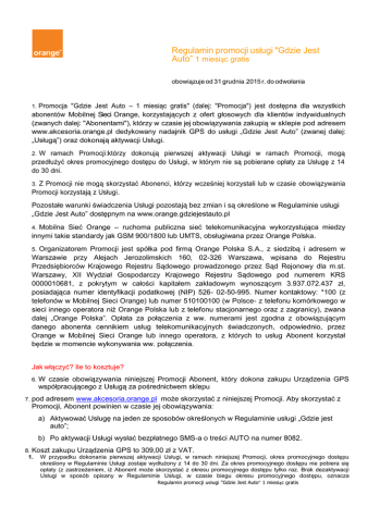 Regulamin promocji usługi "Gdzie Jest Auto” 1 miesiąc gratis obowiązuje od 31 grudnia 2015 r. do odwołania Promocja "Gdzie Jest Auto – 1 miesiąc gratis" (dalej: "Promocja") jest dostępna dla wszystkich abonentów Mobilnej Sieci Orange, korzystających z ofert głosowych dla klientów indywidualnych (zwanych dalej: "Abonentami"), którzy w czasie jej obowiązywania zakupią w sklepie pod adresem www.akcesoria.orange.pl dedykowany nadajnik GPS do usługi „Gdzie Jest Auto” (zwanej dalej: „Usługą”) oraz dokonają aktywacji Usługi. 1. W ramach Promocji:którzy dokonują pierwszej aktywacji Usługi w ramach Promocji, mogą przedłużyć okres promocyjnego dostępu do Usługi, w którym nie są pobierane opłaty za Usługę z 14 do 30 dni. 2. Z Promocji nie mogą skorzystać Abonenci, którzy wcześniej korzystali lub w czasie obowiązywania Promocji korzystają z Usługi. 3. Pozostałe warunki świadczenia Usługi pozostają bez zmian i są określone w Regulaminie usługi „Gdzie Jest Auto” dostępnym na www.orange.gdziejestauto.pl Mobilna Sieć Orange – ruchoma publiczna sieć telekomunikacyjna wykorzystująca miedzy innymi takie standardy jak GSM 900/1800 lub UMTS, obsługiwana przez Orange Polska. 4. Organizatorem Promocji jest spółka pod firmą Orange Polska S.A., z siedzibą i adresem w Warszawie przy Alejach Jerozolimskich 160, 02-326 Warszawa, wpisana do Rejestru Przedsiębiorców Krajowego Rejestru Sądowego prowadzonego przez Sąd Rejonowy dla m.st. Warszawy, XII Wydział Gospodarczy Krajowego Rejestru Sądowego pod numerem KRS 0000010681, z pokrytym w całości kapitałem zakładowym wynoszącym 3.937.072.437 zł, posiadająca numer identyfikacji podatkowej (NIP) 526- 02-50-995. Numer kontaktowy: *100 (z telefonów w Mobilnej Sieci Orange) lub numer 510100100 (w Polsce- z telefonu komórkowego w sieci innego operatora niż Orange Polska lub z telefonu stacjonarnego oraz z zagranicy), zwana dalej „Orange Polska”. Opłata za połączenia z ww. numerami jest zgodna z obowiązującym danego abonenta cennikiem usług telekomunikacyjnych świadczonych, odpowiednio, przez Orange w Mobilnej Sieci Orange lub innego operatora, z których to usług Abonent korzystał będzie w momencie wykonywania ww. połączenia. 5. Jak włączyć? Ile to kosztuje? czasie obowiązywania niniejszej Promocji Abonent, który dokona zakupu Urządzenia GPS współpracującego z Usługą za pośrednictwem sklepu 6. W adresem www.akcesoria.orange.pl może skorzystać z niniejszej Promocji. Aby skorzystać z Promocji, Abonent powinien w czasie jej obowiązywania: 7. pod a) Aktywować Usługę na jeden ze sposobów określonych w Regulaminie usługi „Gdzie jest auto”; b) Po aktywacji Usługi wysłać bezpłatnego SMS-a o treści AUTO na numer 8082. 8. Koszt zakupu Urządzenia GPS to 309,00 zł z VAT. 1. W przypadku dokonania pierwszej aktywacji Usługi, w ramach niniejszej Promocji, okres promocyjnego dostępu określony w Regulaminie Usługi zostaje wydłużony z 14 do 30 dni. Za okres promocyjnego dostępu nie pobiera się opłaty (z zastrzeżeniem, iż Abonent może skorzystać z okresu promocyjnego dostępu tylko raz. Brak dezaktywacji Usługi w sposób opisany w Regulaminie Usługi, w czasie biegu okresu promocyjnego dostępu, oznacza Regulamin promocji usługi "Gdzie Jest Auto” 1 miesiąc gratis automatyczne przejście Usługi w opcję płatną, odnawialną w siedmiodniowych okresach rozliczeniowych,, oraz naliczaniem opłaty za Usługę w wysokości 4,92 zł co 7 dni, z zastrzeżeniem szczególnych wymogów względem Użytkowników prepaid określonych w Regulaminie Usługi. 9. W każdej chwili Abonent może bezpłatnie wyłączyć Usługę wysyłając SMS-a o treści STOP A na numer 8082. Po upływie Okresu Promocyjnego, w dniu przekształcenia się̨ Usługi w opcję płatną, Abonenci, którzy nie wysłali SMS dezaktywującego Usługę̨, zostaną̨ poinformowani w wiadomości SMS o przejściu Usługi w opcję płatną oraz o sposobie rezygnacji z Usługi. 10. 11. Z Promocji można skorzystać tylko raz na danym numerze telefonu. Jak wyłączyć? W każdej chwili można zrezygnować z Usługi wysyłając darmową wiadomość SMS o treści STOP A na numer 8082. 12. Niniejszy regulamin dostępny jest na stronie www.akcesoria.orange.pl oraz w siedzibie Orange Polska S.A. W kwestiach nieuregulowanych w niniejszym regulaminie zastosowanie mają postanowienia regulaminu Usługi Gdzie jest Auto dostępnego na www.orange.pl oraz w siedzibie Orange Polska. Regulamin promocji usługi "Gdzie Jest Auto” 1 miesiąc gratis