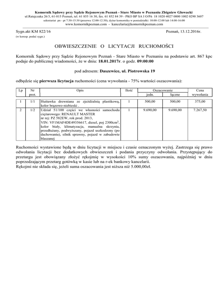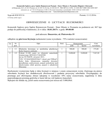 Komornik Sądowy przy Sądzie Rejonowym Poznań - Stare Miasto w Poznaniu Zbigniew Głowacki ul.Ratajczaka 26/3, 61-815 Poznań, tel. 61 855 16 30, fax. 61 852 84 39 - PKO BP SA I O/Pń 18 1020 4027 0000 1002 0290 3607 sekretariat pn - pt 7:30-15:30 (przerwa 12:00-12:30), dyżur komornika w poniedziałki: 10:00-12:00 lub 14:00-16:00 www.komornikpoznan.com - [email protected] Sygn.akt KM 822/16 Poznań, 13.12.2016r. (w koresp. podać sygn.) OBWIESZCZENIE O LICYTACJI RUCHOMOŚCI Komornik Sądowy przy Sądzie Rejonowym Poznań - Stare Miasto w Poznaniu na podstawie art. 867 kpc podaje do publicznej wiadomości, że w dniu: 18.01.2017r. o godz. 09:00:00 pod adresem: Daszewice, ul. Piotrowska 19 odbędzie się pierwsza licytacja ruchomości (cena wywołania - 75% wartości oszacowania): Lp Nr prot. Opis Ilość Oszacowanie jedn. łączne Cena wywołania 1 1/1 1 500,00 500,00 375,00 2 1/2 Huśtawka drewniana ze zjeżdżalnią plastikową, kolor brązowo-niebieski . Udział 51/100 części we własności samochodu ciężarowego: RENAULT MASTER nr rej: PZ 582EW, rok prod. 2013, VIN: VF1MAF4DE49356617, diesel, poj 2300cm3, kolor biały, klimatyzacja, manualna skrzynia, przedłużany, podwyższany, pojazd uszkodzony (po dachowaniu), silnik sprawny, pojazd w zabudowie blaszanej 1 9.690,00 9.690,00 7.267,50 Ruchomości wystawione będą w dniu licytacji w miejscu i czasie oznaczonym wyżej. Zastrzega się prawo odwołania licytacji bez dodatkowych obwieszczeń i podania przyczyny odwołania. Przystępujący do przetargu jest obowiązany złożyć rękojmię w wysokości 10% sumy oszacowania, najpóźniej w dniu poprzedzającym przetarg gotówką w kasie lub na r-ek bankowy kancelarii. Rękojmi nie składa się, jeżeli suma oszacowania jest niższa niż 5.000,00zł.