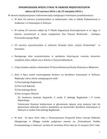 SPRAWOZDANIE WÓJTA Z PRAC W OKRESIE MIĘDZYSESYJNYM okres od 23 czerwca 2016 r. do 25 sierpnia 2016 r. W okresie międzysesyjnym realizowane były następujące ważniejsze przedsięwzięcia: • W dniu 24 czerwca uczestniczyłem w zakończeniu roku w Szkole Podstawowej w Godkowie i w Gimnazjum w Dobrym. • W sobotę 25 czerwca odbył się V Piknik Organizacji Pozarządowych w m. Sąpy, w którym uczestniczył w moim zastępstwie Pan Tomasz Borkowski - Zastępca Przewodniczącego Rady. • 29 czerwca uczestniczyłem w zebraniu Związku Gmin „Czyste Środowisko” w Ostródzie. • Następnego dnia uczestniczyłem w spotkaniu dotyczącym rozwoju obszarów wiejskich, które odbyło się w Hotelu w Starych Jabłonkach. • 2 lipca brałem udział w obchodach 70-lecia Ochotniczej Straży Pożarnej w Milejewie. • Dnia 4 lipca został rozstrzygnięty konkurs na dyrektora Gimnazjum w Dobrym. Wpłynęły cztery oferty następujących osób: 1) Pani Jadwiga Bogdaniuk, 2) Pan Lech Babecki, 3) Pani Jadwiga Bloch, 4) Pan Grzegorz Więcek. Do konkursu komisja dopuściła 2 osoby P. Jadwigę Bogdaniuk i P. Lecha Babeckiego. Ostatecznie Komisja konkursowa w głosowaniu tajnym, przy pomocy kart do głosowania dokonała wyboru kandydata na stanowisko dyrektora Gimnazjum w Dobrym w osobie Pani Jadwigi Bogdaniuk. • W dniu 22 lipca 2016 roku z Towarzystwem Przyjaciół Dzieci Zarząd Oddziału Okręgowego w Elblągu została podpisana umowa na ,,Prowadzenie Punktu Przedszkolnego w Dobrym” od dnia 01 września 2016 roku do 31 sierpnia 2017 roku. 1 Wartość ogólna zadania wynosi 83.000 zł. Kwota 30.000 zł zostanie przekazana w 2016 roku i kwota 53.000 zł w roku 2017. • Również w miesiącu lipcu zorganizowane zostały dwa spotkania integracyjne, dla radnych i sołtysów z terenu Gminy Godkowo. Bardzo dziękuję tym wszystkim, którzy wzięli udział w zorganizowanych spotkaniach. • W okresie od 1 do 12 sierpnia przebywałem na urlopie wypoczynkowym. • Od 1 sierpnia 2016 roku przyjmowane są wnioski o ustalenie prawa do świadczeń z funduszu alimentacyjnego na okres świadczeniowy od 1 października 2016 roku do 30 września 2017 roku. • 5 sierpnia rozstrzygnięty został przetarg na dowóz uczniów do szkół. Złożona została jedna oferta z firmy PKS Elbląg. W dniu 18 sierpnia 2016 roku została podpisana umowa z Przedsiębiorstwem Komunikacji Samochodowej w Elblągu na kwotę 114.076,30 zł na rok szkolny 2016/2017. • 15 sierpnia na zaproszenie Wojewody Warmińsko-Mazurskiego P. Artura Chojeckiego uczestniczyłem w obchodach wojewódzkich Święta Wojska Polskiego, które organizowane były w Węgorzewie. • W dniu 16 sierpnia 2016 roku wydałem Zarządzenie Nr 40/2016 w sprawie przyjęcia informacji o przebiegu wykonania budżetu gminy za pierwsze półrocze 2016 roku. Dochody zostały wykonane w wysokości 6.480.046,85 zł zł co stanowi 52,27% zaplanowanego planu. Wydatki wykonano w kwocie 5.862.790,69 zł co stanowi 46,17% planu. • W okresie od 16 do 20 sierpnia organizowany był w miejscowości Podągi „Tydzień profilaktyki”, który zakończył się imprezą pod nazwą: Dni Podąg” w dniu 20 sierpnia. Bardzo dziękuję za zaangażowanie organizatorów. 2 • 20 sierpnia odbył się Integracyjny Rajd Rowerowy pod nazwą „W krainie Bizonów” organizowany przez Stowarzyszenie „Pomocna Dłoń”. Na ręce Pani Renaty Korwel chciałbym w tym miejscu złożyć serdeczne podziękowania na sprawne zorganizowanie wszystkich rajdów kijkowego i rowerowych. • W Bielicy również 20 sierpnia odbyła się impreza pod nazwą „Pożegnanie lata”, w której uczestniczyłem. • Od dnia 21 sierpnia Klub Sportowy „Żuraw” rozpoczął rozgrywki w sezonie jesiennozimowym. Pierwszy mecz został rozegrany z Klubem Sportowym „Piast” Wilczęta. Wynik: 2:1 dla Wilcząt. • W poniedziałek 22 sierpnia złożyłem podpis pod petycją Burmistrza Gołdapi dotyczącą wznowienia Małego Ruchu Granicznego. • Przypominam, iż do 31 sierpnia 2016 roku przyjmowane są wnioski o zwrot podatku akcyzowego zawartego w cenie oleju napędowego za II półrocze 2016 roku. Na dzień dzisiejszy wpłynęło 58 wniosków. • Od 1 września 2016 roku będą przyjmowane wnioski o ustalenie świadczeń rodzinnych na okres zasiłkowy od 1 listopada 2016 roku do 31 października 2017 roku. • Od 1 do 15 września 2016 roku będą przyjmowane wnioski o przyznanie stypendium szkolnego. • Zostały zakończone prace remontowe ocieplenia remizy strażackiej w Osieku. Koszt zakupu materiałów wyniósł 7.734 zł. • Informacja dotycząca bieżącego utrzymania dróg: Od początku roku 2016 na bieżąco wykonywane były prace związane z naprawą dróg gminnych, gruntowych tj. zakupiliśmy materiały na naprawę dróg w postaci żwiru i 3 gruzu kruszonego za kwotę 22.017,06 zł ( 280 t. gruzu i 120 t. żwiru). Dodatkowo dokonana zastała wymiana materiałów porozbiórkowych: starych rynienek, uszkodzonych krawężników na gruz kruszony, za co otrzymaliśmy 120 t gruzu. Zakupione materiały służyły głównie do naprawy dróg w miejscowościach: Ząbrowiec, Stary Cieszyn, Krykajny, Cieszyniec, Lesiska i Łępno, Godkowo. W czerwcu zamówiona została równiarka z Zakładu Komunalnego Wilczęta, która pracowała 44 h na drogach gminnych w miejscowości Dobry oraz Skowrony za kwotę 5.953,20 zł. W miejscowości Skowrony wykonane zostały prace związane z odwodnieniem uliczki bocznej, usługę wykonał Rejonowy Związek Spółek Wodnych z Braniewa za kwotę 14.900,00 zł, gmina przekazała materiał na wykonanie tj. porozbiórkowe rynienki z przebudowy drogi 513. Sukcesywnie staraliśmy się poprawiać warunki techniczne na drogach gminnych , zakupiliśmy i zamontowaliśmy 7 przepustów w miejscowościach Ząbrowiec, Karwity, Stojpy, Łępno, Szymbory, za kwotę 3.863,65 zł. Pan Marek Sowiński dyrektor Rejonowego Związku Spółek Wodnych w Braniewie wykonał remont przepustu w miejsco