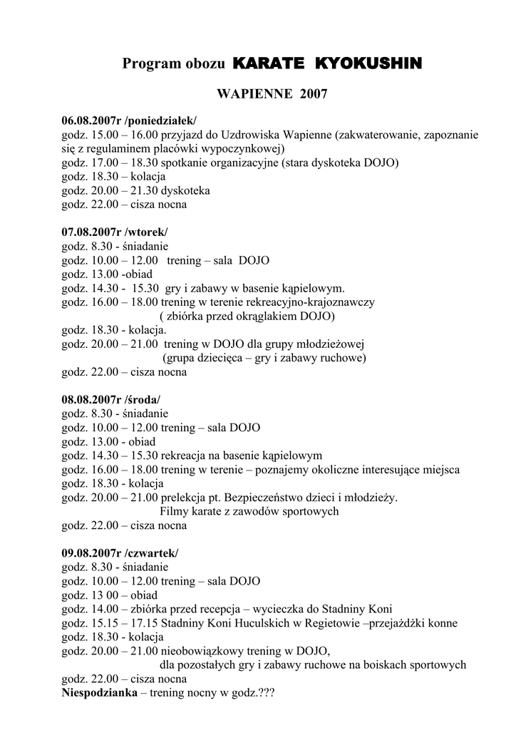Program obozu KARATE KYOKUSHIN WAPIENNE 2007 06.08.2007r /poniedziałek/ godz. 15.00 – 16.00 przyjazd do Uzdrowiska Wapienne (zakwaterowanie, zapoznanie się z regulaminem placówki wypoczynkowej) godz. 17.00 – 18.30 spotkanie organizacyjne (stara dyskoteka DOJO) godz. 18.30 – kolacja godz. 20.00 – 21.30 dyskoteka godz. 22.00 – cisza nocna 07.08.2007r /wtorek/ godz. 8.30 - śniadanie godz. 10.00 – 12.00 trening – sala DOJO godz. 13.00 -obiad godz. 14.30 - 15.30 gry i zabawy w basenie kąpielowym. godz. 16.00 – 18.00 trening w terenie rekreacyjno-krajoznawczy ( zbiórka przed okrąglakiem DOJO) godz. 18.30 - kolacja. godz. 20.00 – 21.00 trening w DOJO dla grupy młodzieżowej (grupa dziecięca – gry i zabawy ruchowe) godz. 22.00 – cisza nocna 08.08.2007r /środa/ godz. 8.30 - śniadanie godz. 10.00 – 12.00 trening – sala DOJO godz. 13.00 - obiad godz. 14.30 – 15.30 rekreacja na basenie kąpielowym godz. 16.00 – 18.00 trening w terenie – poznajemy okoliczne interesujące miejsca godz. 18.30 - kolacja godz. 20.00 – 21.00 prelekcja pt. Bezpieczeństwo dzieci i młodzieży. Filmy karate z zawodów sportowych godz. 22.00 – cisza nocna 09.08.2007r /czwartek/ godz. 8.30 - śniadanie godz. 10.00 – 12.00 trening – sala DOJO godz. 13 00 – obiad godz. 14.00 – zbiórka przed recepcja – wycieczka do Stadniny Koni godz. 15.15 – 17.15 Stadniny Koni Huculskich w Regietowie –przejażdżki konne godz. 18.30 - kolacja godz. 20.00 – 21.00 nieobowiązkowy trening w DOJO, dla pozostałych gry i zabawy ruchowe na boiskach sportowych godz. 22.00 – cisza nocna Niespodzianka – trening nocny w godz.??? 10.08.2007r /piątek/ godz. 8.30 – śniadanie godz. 9.30 – 11.00 trening – sala DOJO godz. 11.30 – 12.45 eliminacje grupowe w piłkę nożną lub w inną grę zespołową: Nowy Sącz, Nowy Targ, Gorlice godz. 13.00 - obiad godz. 14.30 – 15.30 basen kąpielowy godz. 16.00 – 18.00 trening w terenie godz. 18.30 – kolacja godz. 20.00 – 21.00 trening nieobowiązkowy – DOJO (dla pozostałych gry i zabawy rekreacyjne)) godz. 22.00 – cisza nocna 11.08.2007r /sobota/ godz. 8.30 - śniadanie godz. 9.30 – 11.00 trening w terenie godz. 11.30 – 12.30 finały rozgrywek zespołowych godz. 13.00 – obiad godz. 14.30 – 15.30 trening na basenie godz. 16.00 – 18.00 trening w DOJO (egzamin nieobowiązkowy) godz. 18.30 - kolacja godz. 20.00 – 22.00 ognisko, występy kabaretowe i pasowanie na samuraja godz. 22.30 – cisza nocna 12. 08. 2007r /niedziela/ godz. 9.00 - śniadanie godz. 10.00 – 11.30 trening – teren /zakończenie obozu/ godz 12.00 – obiad /oddanie pokoi do godz. 13.00/ godz. 13.00 – zbiórka, zakończenie obozu, zgłoszenie gotowości do wyjazdu godz. 13.30 wyjazd z placówki wypoczynkowej. Kierownik Obozu Sensei Andrzej Krawontka