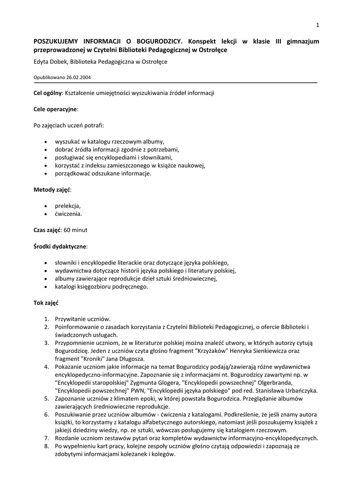 POSZUKUJEMY INFORMACJI O BOGURODZICY. Konspekt lekcji w