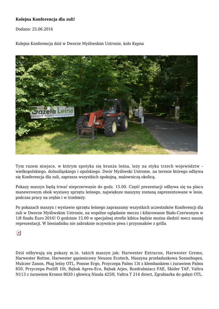 Kolejna Konferencja dla zuli! Dodano: 25.06.2016 Kolejna Konferencja dziś w Dworze Myśliwskim Ustronie, koło Kępna Tym razem miejsce, w którym spotyka się branża leśna, leży na styku trzech województw – wielkopolskiego, dolnośląskiego i opolskiego. Dwór Myśliwski Ustronie, na terenie którego odbywa się Konferencja dla zuli, zaprasza wszystkich spokojną, malowniczą okolicą. Pokazy maszyn będą trwać nieprzerwanie do godz. 15.00. Część prezentacji odbywa się na placu manewrowym obok wystawy sprzętu leśnego, największe maszyny zostaną zaprezentowane w lesie, podczas pracy na zrębie i w trzebieży. Po pokazach maszyn i wystawie sprzętu leśnego zapraszamy wszystkich uczestników Konferencji dla zuli w Dworze Myśliwskim Ustronie, na wspólne oglądanie meczu i kibicowanie Biało-Czerwonym w 1/8 finału Euro 2016! O godzinie 15.00 w specjalnej strefie kibica będzie można śledzić mecz naszej reprezentacji. W biesiadniku nie zabraknie oczywiście piwa i przysmaków z grilla. Dziś odbywają się pokazy m.in. takich maszyn jak: Harwester Entracon, Harwester Gremo, Harwester Rottne, Harwester gąsienicowy Neuson Ecotech, Maszyna przeładunkowa Sonnebogen, Mulczer Zanon, Pług leśny OTL, Ponsse Ergo, Przyczepa Palms 13t z klembankiem i żurawiem Palms 850, Przyczepa Pozlift 10t, Rębak Agrex-Eco, Rębak Arjes, Rozdrabniacz FAE, Skider TAF, Valtra N113 z żurawiem Kronos 8020 i głowicą Nisula 425H, Valtra T 214 direct, Zgrabiarka do gałęzi OTL. Poza pokazami maszyn podczas pracy przez cały dzień będzie można oglądać wystawę maszyn i sprzętu leśnego. Swoje stoiska rozstawi ponad 40 firm, które zgłosiły swój udział konferencji. Obecność na Konferencji dla zuli w Dworze Myśliwskim Ustronie potwierdziły m.in. firmy: 2forest, AGCO, Agrex-Eco, Bałdyga, Bank Ochrony Środowiska, Bax-Baumaschinen, Cleo, Eurogate, FIRMYLESNE.pl, Forex Polska, Fortech Serwis, GAZETA LEŚNA, Grupa ATH, Hylmet, Kamar, Kancelaria Adwokacja Jaskot-Bąk Adwokaci, Kingspan, Kompania Leśna, Kopa-Kamiński, LKT, OTL Jarocin, PHU Andrzej Klimowicz, Polska Leśna Izba Gospodarcza, Pozlift, Profesjonalne Maszyny Leśne, Prooil, Rol-Max, Sadmasz, Swimer, Trafica, Utech, Vegas Opony, Zetor, ZUL Alicja Stryszyk. Dokładna data i adres konferencji: Konferencja dla zuli 25 czerwca 2016 r., godz. 9.00 - 15.00 Dwór Myśliwski Ustronie, Trzebień 73, 63-645 Łęka Opatowska Organizatorem Konferencji dla zuli jest GAZETA LEŚNA, patronat medialny objął portal FIRMYLESNE.pl. Patronat honorowy nad Konferencją objął prof. dr hab. Grzegorz Skrzypczak - Rektor Uniwersytetu Przyrodniczego w Poznaniu, a także w imieniu Polskiej Leśnej Gospodarczej - Mariusz Rakowski prezydent Izby. Udział w Konferencji jest bezpłatny. Czekamy na Was! Zaproszenie na konferencję z mapką dojazdu: kliknij TUTAJ lub skopiuj link: /images/source/Od Maja 2016/Zaproszenie Konferencja dla zuli Ustronie.jpg Bieżących informacji szukaj na stronie głównej portalu: FIRMYLESNE.pl oraz FACEBOOK YOUTUBE – zobacz filmy z poprzednich konferencji: Konferencja dla zuli Spychowo Konferencja dla zuli w Suścu Kto będzie na Konferencji? OxyTree: http://firmylesne.pl/lista/informacje/pokaz/oxytree_wyrosna_w_dworze_mysliwskim_ustronie,3375 OTL Jarocin: http://firmylesne.pl/lista/informacje/pokaz/otl_jarocin_kolejnym_gosciem_konferencji_dla_zuli,3374 PROML - (diler Ponsse): http://firmylesne.pl/lista/informacje/pokaz/ponsse_na_placu_manewrowym_konferencji_dla_zuli,3373 Agrexeco: http://firmylesne.pl/lista/technika-lesna/pokaz/nowe_rebako-rozdrabniacze_ts_industries_na_konferen cji_dla_zuli,3372 Komentarze (0) Nie dodano jeszcze żadnego komentarza.
