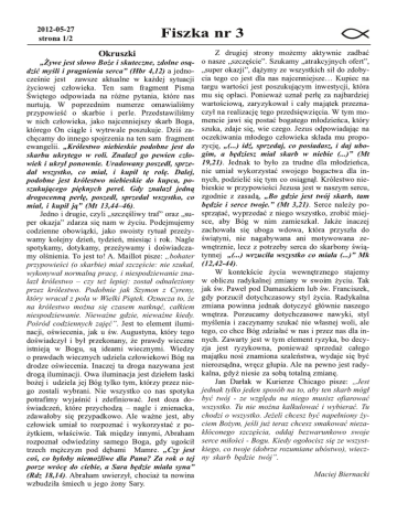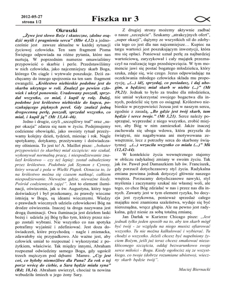 Fiszka nr 3 2012-05-27 strona 1/2 Okruszki „Żywe jest słowo Boże i skuteczne, zdolne osą dzić myśli i pragnienia serca” (Hbr 4,12) a jedno- cześnie jest zawsze aktualne w każdej sytuacji życiowej człowieka. Ten sam fragment Pisma Świętego odpowiada na różne pytania, które nas nurtują. W poprzednim numerze omawialiśmy przypowieść o skarbie i perle. Przedstawiliśmy w nich człowieka, jako najcenniejszy skarb Boga, którego On ciągle i wytrwale poszukuje. Dziś zachęcamy do innego spojrzenia na ten sam fragment ewangelii. „Królestwo niebieskie podobne jest do Z drugiej strony możemy aktywnie zadbać o nasze „szczęście”. Szukamy „atrakcyjnych ofert”, „super okazji”, dążymy ze wszystkich sił do zdobycia tego co jest dla nas najcenniejsze… Kupiec na targu wartości jest poszukującym inwestycji, która mu się opłaci. Ponieważ uznał perłę za najbardziej wartościową, zaryzykował i cały majątek przeznaczył na realizację tego przedsięwzięcia. W tym momencie jawi się postać bogatego młodzieńca, który szuka, zdaje się, wie czego. Jezus odpowiadając na oczekiwania młodego człowieka składa mu propozycję, „(...) idź, sprzedaj, co posiadasz, i daj ubo skarbu ukrytego w roli. Znalazł go pewien czło gim, a będziesz miał skarb w niebie (...)” (Mt wiek i ukrył ponownie. Uradowany poszedł, sprze 19,21). Jednak to było za trudne dla młodzieńca, dał wszystko, co miał, i kupił tę rolę. Dalej, nie umiał wykorzystać swojego bogactwa dla inpodobne jest królestwo niebieskie do kupca, po nych, podzielić się tym co osiągnął. Królestwo nieszukującego pięknych pereł. Gdy znalazł jedną bieskie w przypowieści Jezusa jest w naszym sercu, drogocenną perłę, poszedł, sprzedał wszystko, co zgodnie z zasadą, „Bo gdzie jest twój skarb, tam będzie i serce twoje.” (Mt 3,21). Serce należy pomiał, i kupił ją” (Mt 13,44–46). Jedno i drugie, czyli „szczęśliwy traf” oraz „super okazja” zdarza się nam w życiu. Podejmujemy codzienne obowiązki, jako swoisty rytuał przeżywamy kolejny dzień, tydzień, miesiąc i rok. Nagle spotykamy, dotykamy, przeżywamy i doświadczamy olśnienia. To jest to! A. Maillot pisze: „bohater przypowieści (o skarbie) miał szczęście: nie szukał, wykonywał normalną pracę, i niespodziewanie zna lazł królestwo – czy też lepiej: został odnaleziony przez królestwo. Podobnie jak Szymon z Cyreny, który wracał z pola w Wielki Piątek. Oznacza to, że na królestwo można się czasem natknąć, całkiem niespodziewanie. Nieważne gdzie, nieważne kiedy. Pośród codziennych zajęć”. Jest to element ilumi- nacji, oświecenia, jak u św. Augustyna, który tego doświadczył i był przekonany, że prawdy wieczne istnieją w Bogu, są ideami wiecznymi. Wiedzy o prawdach wiecznych udziela człowiekowi Bóg na drodze oświecenia. Inaczej ta droga nazywana jest drogą iluminacji. Owa iluminacja jest dziełem łaski bożej i udziela jej Bóg tylko tym, którzy przez niego zostali wybrani. Nie wszystko co nas spotyka potrafimy wyjaśnić i zdefiniować. Jest doza doświadczeń, które przychodzą – nagle i znienacka, zdawałoby się przypadkowo. Ale ważne jest, aby człowiek umiał to rozpoznać i wykorzystać z pożytkiem, właściwie. Tak między innymi, Abraham rozpoznał odwiedziny samego Boga, gdy ugościł trzech mężczyzn pod dębami Mamre. „Czy jest sprzątać, wyprzedać z niego wszystko, zrobić miejsce, aby Bóg w nim zamieszkał. Jakże inaczej zachowała się uboga wdowa, która przyszła do świątyni, nie nagabywana ani motywowana zewnętrznie, lecz z potrzeby serca do skarbony świątynnej „(...) wrzuciła wszystko co miała (...)” Mk (12,4244). W kontekście życia wewnętrznego stajemy w obliczu radykalnej zmiany w swoim życiu. Tak jak św. Paweł pod Damaszkiem lub św. Franciszek, gdy porzucił dotychczasowy styl życia. Radykalna zmiana powinna jednak dotyczyć głównie naszego wnętrza. Porzucamy dotychczasowe nawyki, styl myślenia i zaczynamy szukać nie własnej woli, ale tego, co chce Bóg zdziałać w nas i przez nas dla innych. Zawarty jest w tym element ryzyka, bo decyzja jest ryzykowna, ponieważ sprzedaż całego majątku nosi znamiona szaleństwa, wydaje się być nierozsądna, wręcz głupia. Ale na pewno jest radykalna, gdyż niesie za sobą totalną zmianę. Jan Darłak w Kurierze Chicago pisze: „Jest jednak tylko jeden sposób na to, aby ten skarb mógł być twój ze względu na niego musisz ofiarować wszystko. Tu nie można kalkulować i wybierać. Tu chodzi o wszystko. Jeżeli chcesz być napełniony ży ciem Bożym, jeśli już teraz chcesz smakować nieza kłóconego szczęścia, oddaj bezwarunkowo swoje serce miłości Bogu. Kiedy ogołocisz się ze wszyst kiego, co twoje (dobrze rozumiane ubóstwo), wiecz coś, co byłoby niemożliwe dla Pana? Za rok o tej ny skarb będzie twój”. porze wrócę do ciebie, a Sara będzie miała syna” Maciej Biernacki (Rdz 18,14). Abraham uwierzył, chociaż ta nowina wzbudziła śmiech u jego żony Sary. 2012-05-27 strona 2/2 Fiszka nr 3 Kamienie w ogródku Jakie jest nasze zdanie o dzisiejszej młodzieży? Co o niej myślimy? Co tak naprawdę o niej wiemy? Skąd czerpiemy informacje na jej temat? Czy nie nazbyt pochopnie powtarzamy, że młodzi ludzie są zdemoralizowani, agresywni, pozbawieni ambicji i pasji, i że nie ma już dziś porządnej młodzieży? Spróbujmy odpowiedzieć sobie na te pytania. Myślę o młodych i trzymam w dłoni kamień. Średniej wielkości kawałek granitu, doskonale wyważony, dobrze leżący w ręku, jakby stworzony po to, by wziąć zamach i cisnąć nim przed siebie, w coś lub kogoś... Jednak TEN kamień nie po to powstał. Trzymam go w dłoni, uśmiecham się, a w sercu mam czułość i dumę. Moja córka przywiozła go do domu rok temu, jako pamiątkę ze Spotkania Młodych w Lednicy. Kamień z odciśniętym wizerunkiem ryby – symbo