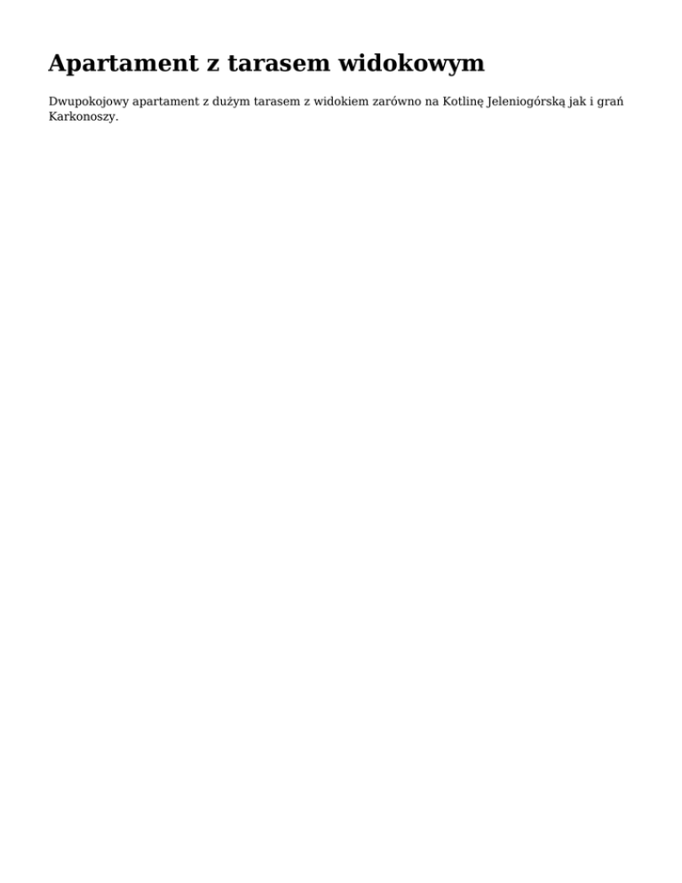 Apartament z tarasem widokowym Dwupokojowy apartament z dużym tarasem z widokiem zarówno na Kotlinę Jeleniogórską jak i grań Karkonoszy.
