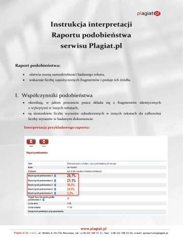 Instrukcja interpretacji Raportu podobieństwa serwisu Plagiat.pl Raport podobieństwa: ułatwia ocenę samodzielności badanego tekstu, wskazuje liczbę zapożyczonych fragmentów i podaje ich źródła. I. Współczynniki podobieństwa określają, w jakim procencie praca składa się z fragmentów identycznych z wykrytymi w innych tekstach, są stosunkiem liczby wyrazów odnalezionych w innych tekstach do całkowitej liczby wyrazów w badanym dokumencie. Interpretacja przykładowego raportu: 1 Wartość Współczynnika podobieństwa 1 określa, jaką część badanej pracy stanowią frazy o długości 5 wyrazów lub dłuższe, odnalezione w bazie uczelni macierzystej, bazach innych uczelni (uczestniczących w Międzyuczelnianym Programie Wymiany Baz) lub w zasobach Internetu (z wyłączeniem fragmentów aktów prawnych odnalezionych w Bazie Aktów Prawnych - BAP). Współczynnik podobieństwa 1 służy przede wszystkim do badania samodzielności językowej autora pracy. 2 Wartość Współczynnika podobieństwa 2 określa, jaka część badanej pracy składa się z fraz odnalezionych w w/w bazach (z wyłączeniem BAP) o długości 25 wyrazów lub dłuższej. Ze względu na długość wykrywanych fraz Współczynnik podobieństwa 2 jest lepszym narzędziem do wykrywania nieuprawnionych zapożyczeń. 3 Współczynnik podobieństwa 3 jest wyliczany analogicznie do Współczynnika podobieństwa 1 z tym, że uwzględnia on dodatkowo wszystkie frazy o długości 8 wyrazów lub dłuższe odnalezione przez System w Bazie Aktów Prawnych. 4 Współczynnik podobieństwa 4 jest wyliczany analogicznie do Współczynnika podobieństwa 2 z tym, że uwzględnia on dodatkowo wszystkie frazy o długości 25 wyrazów lub dłuższe odnalezione przez System w Bazie Aktów Prawnych. 5 Wartość Współczynnika podobieństwa 5 oznacza, jaka część badanej pracy składa się wyłącznie z fraz aktów prawnych odnalezionych w Bazie Aktów Prawnych o długości co najmniej 8 wyrazów. II. Funkcjonalności Raportu podobieństwa wykrywa i przedstawia w postaci listy 10 najdłuższych fragmentów zidentyfikowanych jako zapożyczenia, tworzy listy fragmentów zidentyfikowanych jako tożsame z badanym tekstem, występujących w bazie uczelni macierzystej, bazach innych uczelni, Bazie Aktów Prawnych (BAP) oraz w Internecie, umożliwia zaznaczanie (kolorem niebieskim) wybranych zapożyczeń, określa stopień zapożyczeń wyrażony w liczbie wyrazów występujących w danym fragmencie tekstu, pozwala zaznaczyć wykorzystane fragmenty z wybranego źródła. III. Treść Raportu podobieństwa Kolory występujące w treści Raportu podobieństwa oznaczają odpowiednio: zielony — fragmenty pochodzące z zasobów Internetu, czerwony — fragmenty pochodzące z bazy macierzystej i z baz innych uczelni, niebieski — fragmenty zaznaczone przy użyciu funkcji znajdujących się w rozwijanych listach, niebieski kolor tła — fragmenty odnalezione w dokumentach pochodzących z Bazy Aktów Prawnych (BAP), żółty kolor tła — znaki pochodzące z alfabetu innego niż łaciński, mogące świadczyć o próbie ukrycia dokonanych zapożyczeń. IV. Interpretacja Raportu podobieństwa Aby dokonać właściwej interpretacji Raportu podobieństwa, należy wykonać następujące czynności: 1. Sprawdzić wartości Współczynników podobieństwa (wątpliwości powinno budzić przekroczenie progu 50% dla Współczynnika podobieństwa 1 i 5% dla Współczynnika podobieństwa 2). 2. Jeżeli w badanej pracy pojawi się Alert oznaczający możliwą próbę ukrycia niedopuszczalnych zapożyczeń, należy zwrócić na to szczególną uwagę poprzez przeanalizowanie akapitów zawierających litery oznaczone kolorem żółtym. Mogą one pochodzić z innych alfabetów niż łaciński. 3. Przeanalizować listę „Najdłuższe fragmenty zidentyfikowane jako podobne” (wątpliwości powinny budzić fragmenty o liczbie wyrazów przekraczającej 150; jeżeli takie występują, należy i sprawdzić, czy są cytatami). je odnaleźć, używając linku „zaznacz fragment” 4. Przeanalizować pozostałe listy, zwracając szczególną uwagę na dokumenty zawierające fragmenty o długości przekraczającej limit ustalony dla Współczynnika podobieństwa 2 (są one oznaczone pogrubioną czcionką). W przypadku takich dokumentów, zwłaszcza znajdujących sie na początku listy, należy użyć linku „zaznacz fragmenty” i sprawdzić, czy są one raczej krótkimi frazami rozproszonymi po całym dokumencie (w takiej sytuacji można je uznać za przypadkowe zapożyczenia), czy też długimi fragmentami tekstu sąsiadującymi ze sobą i rozdzielonymi tylko krótkimi frazami (taka sytuacja powinna budzić podejrzenia). 5. W przypadku pojawienia się jakichkolwiek podejrzeń, należy poddać Raport podobieństwa szczegółowej analizie, polegającej, poza użyciem funkcji Raportu podobieństwa wymienionych w pkt. 1-4, także na dokładnym sprawdzeniu treści dokumentu, z uwzględnieniem prawidłowego oznaczenia cytowanych fragmentów użytych w badanej pracy wykrytych przez System jako podobne do tekstów odnalezionych w bazach Systemu. V. Kontakt W razie problemów, uprzejmie prosimy o kontakt z Działem Pomocy. e-mail: [email protected] tel.: (22) 100 11 11