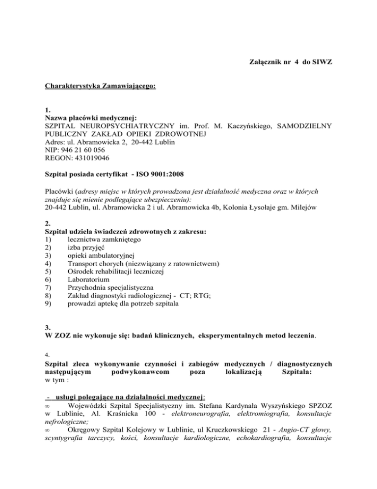 Załącznik nr 4 do SIWZ Charakterystyka Zamawiającego: 1. Nazwa placówki medycznej: SZPITAL NEUROPSYCHIATRYCZNY im. Prof. M. Kaczyńskiego, SAMODZIELNY PUBLICZNY ZAKŁAD OPIEKI ZDROWOTNEJ Adres: ul. Abramowicka 2, 20-442 Lublin NIP: 946 21 60 056 REGON: 431019046 Szpital posiada certyfikat - ISO 9001:2008 Placówki (adresy miejsc w których prowadzona jest działalność medyczna oraz w których znajduje się mienie podlegające ubezpieczeniu): 20-442 Lublin, ul. Abramowicka 2 i ul. Abramowicka 4b, Kolonia Łysołaje gm. Milejów 2. Szpital udziela świadczeń zdrowotnych z zakresu: 1) lecznictwa zamkniętego 2) izba przyjęć 3) opieki ambulatoryjnej 4) Transport chorych (niezwiązany z ratownictwem) 5) Ośrodek rehabilitacji leczniczej 6) Laboratorium 7) Przychodnia specjalistyczna 8) Zakład diagnostyki radiologicznej - CT; RTG; 9) prowadzi aptekę dla potrzeb szpitala 3. W ZOZ nie wykonuje się: badań klinicznych, eksperymentalnych metod leczenia. 4. Szpital zleca wykonywanie czynności i zabiegów medycznych / diagnostycznych następującym podwykonawcom poza lokalizacją Szpitala: w tym : - usługi polegające na działalności medycznej: Wojewódzki Szpital Specjalistyczny im. Stefana Kardynała Wyszyńskiego SPZOZ w Lublinie, Al. Kraśnicka 100 - elektroneurografia, elektromiografia, konsultacje nefrologiczne; • Okręgowy Szpital Kolejowy w Lublinie, ul Kruczkowskiego 21 - Angio-CT głowy, scyntygrafia tarczycy, kości, konsultacje kardiologiczne, echokardiografia, konsultacje • chirurgii naczyń, konsultacje chirurgiczne - pilne, podczas nieobecności lekarzy zatrudnionych w szpitalu; • Centrum Onkologii Ziemi Lubelskiej w Lublinie ul. Jaczewskiego 7 - konsultacje onkologiczne • Ośrodek Medyczny DMP w Lublinie ul. Mełgiewska 7/9 - konsultacje gastrologiczne, kolonoskopia, konsultacje pulmonologiczne, bronchoskopia, konsultacje urologiczne , cystoskopia, konsultacje dermatologiczne, konsultacje okulistyczne, konsultacje alergologiczne, konsultacje reumatologiczne, konsultacje endokrynologiczne, ortopedyczne, ginekologiczne, laryngologiczne oraz dermatolog, okulista , laryngolog – dla pracowników, audiometria, spirometria, WR odczyn FTA WR FTA-ABS, komórki CD 4, elektroforeza białek, odczyn Vaalery Rosego, ASO, latex R, APC – fosfataza kwaśna, Anty TPO, Anty TG, Clostridium difficile, AFP, ACTH, Cytomegalia, Komórki LE, Homocysteina, Przeciwciała p. jądrowe; • ALAB Laboratoria PS z o.o. – Laboratorium Analiz Lekarskich, ul. Jaczewskiego 8 w Lublinie - wymaz w kier. SS (pacjenci, profilaktyka), hormony płciowe, progesteron, testosteron, FSH, LH, HIV – test potwierdzenia, witamina B 12, immunoglobuliny IGM, IGG, IGA, Kwas foliowy, HBS test potwierdzenia, HbA1c, Kortyzol, Estradiol, Enterowirusy, Antykoagulant toczniowy, P-ciała antykardiolopinowe, Aktywność antytrombiny; • Samodzielny Publiczny Szpital Kliniczny Nr 4 w Lublinie - rezonans magnetyczny, arteriografia, konsultacje neurochirurgiczne, konsultacje torakochirurgiczne. Pozostali podwykonawcy to: • lekarze zatrudnieni na umowy cywilno –prawne (posiadający własną polisę OC ) - usługi nie związane z działalnością medyczną: • usługi sprzątania - prowadzi je firma zewnętrzna / pracownicy ZOZ 5. Szpital używa własnych środków transportu do przewożenia chorych karetki sanitarne Tak 6.Szpital prowadzi dodatkową, pozamedyczną działalność gospodarczą w zakresie: • przygotowuje we własnym zakresie posiłki dla : pacjentów, personelu szpitala • sprzedaż posiłków przygotowanych we własnym zakresie • prowadzi działalność – wynajem pomieszczeń • sterylizacji narzędzi na zlecenie • Szpital prowadzi parking - niestrzeżony 8. Liczba pracowników (dane - za wrzesień 2010) Liczba pracowników łącznie : 827 Liczba pielęgniarek: 252 w tym położnych: 0 Liczba lekarzy ogółem: 103 Liczba lekarzy na umowę o pracę: 103 Liczba lekarzy na kontrakcie (na umowie cywilno - prawnej): 4 Lekarze z I stopniem specjalizacji: 25 w tym: chirurg - 1 ginekolog - 0 ortopeda - 0 neurolog - 5 rehabilitant - 0 rtg - 1 psychiatra - 13 otolaryngolog - 0 psychiatria dzieci i młodzieży - 0 choroby płuc - 0 medycyna ratunkowa - 0 choroby wewnętrzne - 4 anestezjolog - 0 kardiochirurg - 0 neurochirurg -0 kardiolog -0 okulista -0 geriatra - 0 choroby dziecięce – 0 medycyna pracy - 1 Lekarze z II stopniem specjalizacji: 65 Liczba rezydentów: 5 Liczba stażystów: 0 Liczba wolontariuszy: 0 Liczba praktykantów: 0 9. Liczba łóżek ogółem: 892 10. Liczba przyjętych w ostatnim roku pacjentów w lecznictwie zamkniętym – 8 715 Liczba przyjętych w ostatnim roku pacjentów w lecznictwie otwartym – 29 456 11. Liczba zabiegów operacyjnych w ostatnim roku: w szpitalu nie przeprowadza się zabiegów chirurgicznych 12. Aktualne oddziały szpitalne/liczba łóżek (w oddziałach dziennych liczba miejsc) 1. Oddział Psychiatryczny dla Chorych na Gruźlicę I - 17 2. Oddział Psychiatryczny Rehabilitacyjny III - 24 3. Oddziały Psychiatryczne Ogólne IV-VIII - 353 4. Oddział Neuropsychiatrii Dziecięcej - 25 5. Oddział Neurologiczny I - 44 6. Oddział Neurologiczny II -41 7. Oddział Chorób Wewnętrznych - 38 8. Oddział Detoksykacyjny dla narkomanów - 18 9. Oddział Leczenia Alkoholowych Zespołów Abstynencyjnych - 30 10. Całodobowy Oddział Terapii Uzależnienia od Alkoholu - 66 11. Oddział Psychogeriatryczny - 25 12. Zakład Opiekuńczo Leczniczy w Łysołajach - 78 13. Oddział Rehabilitacji Neurologicznej - 27 14. Oddział Psychiatryczny dla Młodzieży - 22 15. Oddział Leczenia Zaburzeń Nerwicowych – 32 16. 17. 18. 19. 20. 21. Oddział Psychiatrii Sądowej - 52 Pododdział Dzienny dziecięcy - 12 Oddział Rehabilitacji Dziennej - 15 Dzienny Oddział Terapii Uzależnienia od Alkoholu – 10 Oddział Psychiatryczny Dzienny - 20 Oddział Hospitalizacji Domowej I i II (dzienne) - 60 13 . Suma Gwarancyjna w ubezpieczeniu Odpowiedzialności Cywilnej w poprzednim 