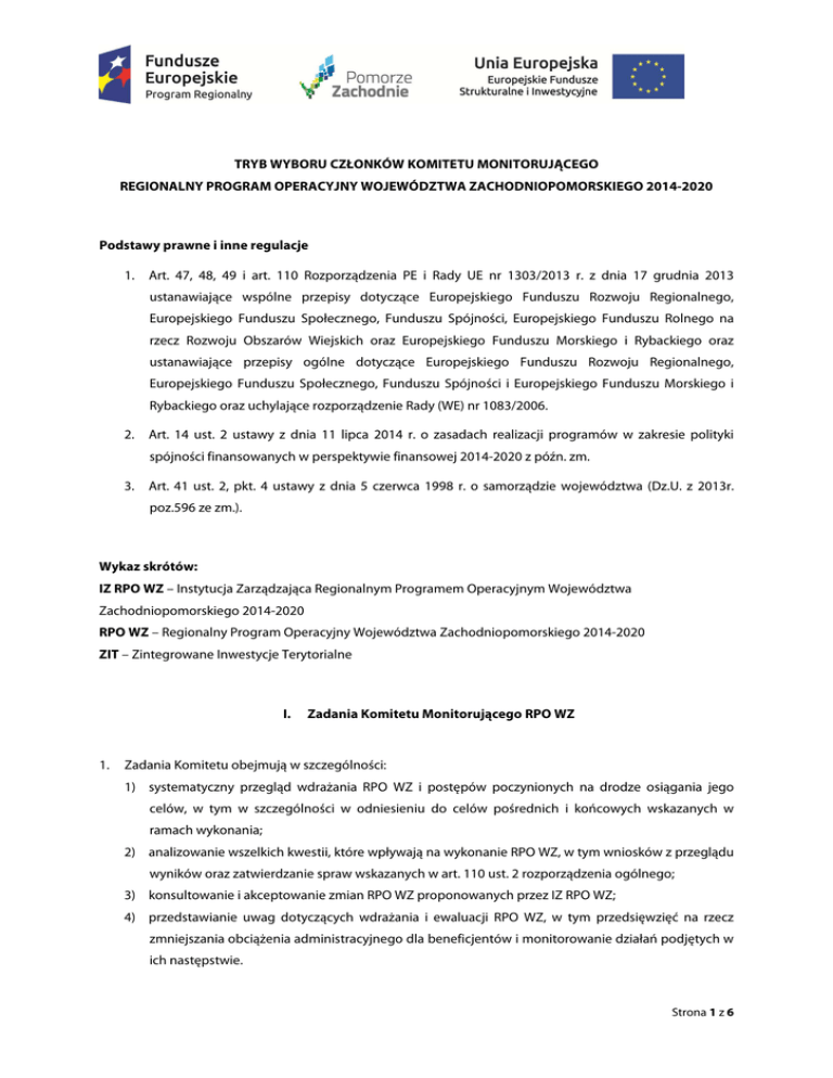 TRYB WYBORU CZŁONKÓW KOMITETU MONITORUJĄCEGO REGIONALNY PROGRAM OPERACYJNY WOJEWÓDZTWA ZACHODNIOPOMORSKIEGO 2014-2020 Podstawy prawne i inne regulacje 1. Art. 47, 48, 49 i art. 110 Rozporządzenia PE i Rady UE nr 1303/2013 r. z dnia 17 grudnia 2013 ustanawiające wspólne przepisy dotyczące Europejskiego Funduszu Rozwoju Regionalnego, Europejskiego Funduszu Społecznego, Funduszu Spójności, Europejskiego Funduszu Rolnego na rzecz Rozwoju Obszarów Wiejskich oraz Europejskiego Funduszu Morskiego i Rybackiego oraz ustanawiające przepisy ogólne dotyczące Europejskiego Funduszu Rozwoju Regionalnego, Europejskiego Funduszu Społecznego, Funduszu Spójności i Europejskiego Funduszu Morskiego i Rybackiego oraz uchylające rozporządzenie Rady (WE) nr 1083/2006. 2. Art. 14 ust. 2 ustawy z dnia 11 lipca 2014 r. o zasadach realizacji programów w zakresie polityki spójności finansowanych w perspektywie finansowej 2014-2020 z późn. zm. 3. Art. 41 ust. 2, pkt. 4 ustawy z dnia 5 czerwca 1998 r. o samorządzie województwa (Dz.U. z 2013r. poz.596 ze zm.). Wykaz skrótów: IZ RPO WZ – Instytucja Zarządzająca Regionalnym Programem Operacyjnym Województwa Zachodniopomorskiego 2014-2020 RPO WZ – Regionalny Program Operacyjny Województwa Zachodniopomorskiego 2014-2020 ZIT – Zintegrowane Inwestycje Terytorialne I. 1. Zadania Komitetu Monitorującego RPO WZ Zadania Komitetu obejmują w szczególności: 1) systematyczny przegląd wdrażania RPO WZ i postępów poczynionych na drodze osiągania jego celów, w tym w szczególności w odniesieniu do celów pośrednich i końcowych wskazanych w ramach wykonania; 2) analizowanie wszelkich kwestii, które wpływają na wykonanie RPO WZ, w tym wniosków z przeglądu wyników oraz zatwierdzanie spraw wskazanych w art. 110 ust. 2 rozporządzenia ogólnego; 3) konsultowanie i akceptowanie zmian RPO WZ proponowanych przez IZ RPO WZ; 4) przedstawianie uwag dotyczących wdrażania i ewaluacji RPO WZ, w tym przedsięwzięć na rzecz zmniejszania obciążenia administracyjnego dla beneficjentów i monitorowanie działań podjętych w ich następstwie. Strona 1 z 6 II. Skład Komitetu (maksymalnie 40 członków) 2. Przy powołaniu składu Komitetu IZ RPO WZ będzie kierować zasadą partnerstwa, o której mowa w art. 5 rozporządzenia PE i Rady (UE) nr 1303/2013 z dnia 17 grudnia 2013 r. tj. zapewni zrównoważony udział strony rządowej, samorządowej i przedstawicieli partnerów spoza administracji, jak również zapewni propagowanie równości kobiet i mężczyzn i niedyskryminację, zgodnie z art. 7 ww. rozporządzenia. 3. Członek Komitetu reprezentuje w składzie Komitetu podmiot, przez który został wydelegowany. Członkowi Komitetu przysługują prawa i obowiązki, określone w Regulaminie Komitetu, o którym mowa w punkcie 16 niniejszego Trybu. 4. W celu zapewnienia sprawnego funkcjonowania Komitetu każdy podmiot, którego przedstawiciel jako członek został powołany do Komitetu, wyznacza jego zastępcę. Zastępca członka Komitetu korzysta z takich samych praw i ma takie same obowiązki jak członek Komitetu, z tym, że prawo do głosowania przysługuje mu jedynie wtedy, gdy członek Komitetu jest nieobecny na posiedzeniu Komitetu. 5. Obserwator w Komitecie ma prawo uczestnictwa w obradach Komitetu oraz prawo zabierania głosu i wyrażania opinii w każdej ze spraw będących przedmiotem obrad, z tym, że nie przysługuje mu prawo do głosowania. W przypadku obserwatorów podmioty delegujące nie mają obowiązku wyznaczania zastępcy. 6. W skład Komitetu wchodzą: 1) ze strony rządowej (7 członków), po 1 przedstawicielu: a. ministra właściwego do spraw rozwoju regionalnego ds. koordynacji strategicznej, b. ministra właściwego do spraw rozwoju regionalnego ds. koordynacji wdrażania EFS, c. ministra właściwego do spraw finansów, d. Pełnomocnika Rządu do spraw Osób Niepełnosprawnych, e. Pełnomocnika Rządu do spraw Równego Traktowania, f. Wojewody Zachodniopomorskiego, g. ministra właściwego do spraw rolnictwa i rozwoju wsi. 2) ze strony samorządowej (maksymalnie 17 członków): a. przewodniczący Komitetu - Marszałek Województwa Zachodniopomorskiego jako przedstawiciel Zarządu Województwa Zachodniopomorskiego pełniącego rolę IZ RPO WZ; b. po jednym przedstawicielu wydziałów Urzędu Marszałkowskiego Województwa Zachodniopomorskiego, wykonujących zadania IZ RPO WZ, tj.: i. Wydziału Zarządzania Strategicznego, ii. Wydziału Wdrażania RPO. c. po jednym przedstawicielu podmiotów, którym Zarząd Województwa Zachodniopomorskiego zamierza powierzyć rolę Instytucji Pośredniczących RPO WZ, tj.; i. Wojewódzkiego Funduszu Ochrony Środowiska w Szczecinie, ii. Wojewódzkiego Urzędu Pracy w Szczecinie, d. po jednym przedstawicielu każdej z ogólnopolskich organizacji jednostek samorządu terytorialnego wyłonionych na podstawie ustawy z dnia 6 maja 2005 r. o Komisji Wspólnej Strona 2 z 6 Rządu i Samorządu Terytorialnego oraz przedstawicielach Rzeczpospolitej Polskiej Komitecie Regionów Unii Europejskiej ( DZ. U. nr 90, poz.759), tj.: i. Unii Metropolii Polskich, ii. Unii Miasteczek Polskich, iii. Związku Gmin Wiejskich RP, iv. Związku Miast Polskich, v. Związku Powiatów Polskich, vi. Związku Województw RP. e. po dwóch przedstawicieli regionalnych korporacji samorządowych, tj.: i. Konwentu Wójtów, Burmistrzów i Prezydentów Województwa Zachodniopomorskiego, ii. Konwentu Starostów Województwa Zachodniopomorskiego. f. po jednym przedstawicielu Związków ZIT, które podpiszą z IZ RPO WZ stosowne porozumienie dotyczące realizacji ZIT w ramach RPO WZ. 3) ze strony partnerów spoza administracji (16 członków): a. po jednym przedstawicielu organizacji związkowych i organizacji pracodawców, reprezentatywnych w rozumieniu ustawy z dnia 6 lipca 2001 r. o Trójstronnej Komisji do Spraw Społeczno-Gospodarczych i wojewódzkich komisjach dialogu społecznego (Dz. U. Nr 100, poz. 1080, z późn