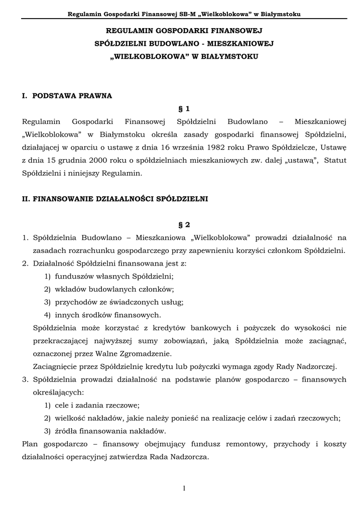 Regulamin Gospodarki Finansowej SB-M „Wielkoblokowa” w Białymstoku REGULAMIN GOSPODARKI FINANSOWEJ SPÓŁDZIELNI BUDOWLANO - MIESZKANIOWEJ „WIELKOBLOKOWA” W BIAŁYMSTOKU I. PODSTAWA PRAWNA §1 Regulamin Gospodarki Finansowej Spółdzielni Budowlano – Mieszkaniowej „Wielkoblokowa” w Białymstoku określa zasady gospodarki finansowej Spółdzielni, działającej w oparciu o ustawę z dnia 16 września 1982 roku Prawo Spółdzielcze, Ustawę z dnia 15 grudnia 2000 roku o spółdzielniach mieszkaniowych zw. dalej „ustawą”, Statut Spółdzielni i niniejszy Regulamin. II. FINANSOWANIE DZIAŁALNOŚCI SPÓŁDZIELNI §2 1. Spółdzielnia Budowlano – Mieszkaniowa „Wielkoblokowa” prowadzi działalność na zasadach rozrachunku gospodarczego przy zapewnieniu korzyści członkom Spółdzielni. 2. Działalność Spółdzielni finansowana jest z: 1) funduszów własnych Spółdzielni; 2) wkładów budowlanych członków; 3) przychodów ze świadczonych usług; 4) innych środków finansowych. Spółdzielnia może korzystać z kredytów bankowych i pożyczek do wysokości nie przekraczającej najwyższej sumy zobowiązań, jaką Spółdzielnia może zaciągnąć, oznaczonej przez Walne Zgromadzenie. Zaciągnięcie przez Spółdzielnię kredytu lub pożyczki wymaga zgody Rady Nadzorczej. 3. Spółdzielnia prowadzi działalność na podstawie planów gospodarczo – finansowych określających: 1) cele i zadania rzeczowe; 2) wielkość nakładów, jakie należy ponieść na realizację celów i zadań rzeczowych; 3) źródła finansowania nakładów. Plan gospodarczo – finansowy obejmujący fundusz remontowy, przychody i koszty działalności operacyjnej zatwierdza Rada Nadzorcza. 1 Regulamin Gospodarki Finansowej SB-M „Wielkoblokowa” w Białymstoku 4. Spółdzielnia prowadzi rachunkowość w oparciu o Ustawę o rachunkowości z dnia 29 września 1994 roku oraz sporządza sprawozdanie finansowe wynikające z powszechnie obowiązujących przepisów. Szczegółowe zasady ewidencji księgowej określa zakładowy plan kont zatwierdzony przez Zarząd Spółdzielni. 5. Roczne sprawozdanie finansowe podlega badaniu oraz ogłoszeniu w Monitorze Spółdzielczym B. Wyboru podmiotu do badania sprawozdania finansowego dokonuje Rada Nadzorcza. Biegły rewident przedstawia opinię na temat rzetelności i prawidłowości prowadzonych ksiąg rachunkowych na podstawie przepisów prawa. Roczne sprawozdanie z działalności Spółdzielni, łącznie ze sprawozdaniem finansowym i opinią biegłego rewidenta, wykłada się w lokalu Spółdzielni, co najmniej na 14 dni przed terminem Walnego Zgromadzenia w celu umożliwienia członkom Spółdzielni zapoznania się z nim. 6. Zasady podziału nadwyżki finansowej lub sposobu pokrycia strat dokonuje w formie uchwały Walnego Zgromadzenia. 7. Pożytki i inne przychody nieruchomości wspólnej służą pokrywaniu wydatków związanych z jej eksploatacją i utrzymaniem, a w części przekraczającej te wydatki przypadają właścicielom lokali proporcjonalne do ich udziałów w nieruchomości wspólnej. W takim samym stosunku właściciele lokali ponoszą wydatki i ciężary związane z utrzymaniem nieruchomości wspólnej w części nie znajdującej pokrycia w pożytkach i innych przychodach. Pożytki i inne przychody z własnej działalności gospodarczej Spółdzielni przeznacza się na pokrycie wydatków związanych z eksploatacją i utrzymaniem nieruchomości. 8. Koszty remontów budynków i urządzeń technicznych zasobów mieszkaniowych finansowane są z funduszu remontowego zasobów mieszkaniowych. 9. Spółdzielnia podstawowe, samodzielnie dodatki, ustala premie, wielkość nagrody środków itp.) w na ramach wynagrodzenia uchwalanych (płace planów gospodarczo – finansowych. 10. Zasady wynagradzania określa Zakładowy Układ Zbiorowy Pracy ustanawiany według zasad i w trybie określonym przepisami Kodeksu Pracy. III. DZIAŁALNOŚĆ SPÓŁDZIELNI §3 1. Przedmiot działalności Spółdzielni obejmuje: 1) obsługę nieruchomości na własny rachunek; 2) zagospodarowanie i sprzedaż nieruchomości na własny rachunek; 2 Regulamin Gospodarki Finansowej SB-M „Wielkoblokowa” w Białymstoku 3) kupno i sprzedaż nieruchomości na własny rachunek; 4) wynajem nieruchomości na własny rachunek; 5) zarządzanie nieruchomościami mieszkalnymi; 6) zarządzanie nieruchomościami niemieszkalnymi; 7) zarządzanie nieruchomościami na zlecenie; 8) wykonywanie robót ogólnobudowlanych związanych z wznoszeniem budynków; 9) kierowanie w zakresie działalności społecznej; 10) działalność pozostałych organizacji członkowskich, gdzie indziej nie sklasyfikowana; 11) działalność związana z kulturą, oświatą i sportem. 2. Wymienione powyżej działalności prowadzone przez Spółdzielnię na rzecz członków są rozliczane według kosztów rzeczywiście poniesionych przez Spółdzielnię. 3. Jeżeli niektóre rodzaje działalności Spółdzielni prowadzone są w celu osiągnięcia dochodu, to koszty i przychody tych działalności wyodrębnia się ewidencyjnie od kosztów i przychodów działalności rozliczanej według ustępu 2. 4. Koszty zarządu i administracji ogólnej wyodrębnia się w ewidencji księgowej. Podział kosztów ogólnych podlega rozliczeniu proporcjonalnie do powierzchni m2 lokali. 5. Inwestycje mieszkaniowe Spółdzielni są prowadzone z uwzględnieniem: 1) zasad organizacyjno – finansowych poszczególnych przedsięwzięć, uchwalonych przez Walne Zgromadzenie; 2) planów gospodarczo – finansowych inwestycji; 3) zezwoleń na budowę uzyskanych zgodnie z przepisami prawa budowlanego; 4) zasad rozliczania początkowej lokali, kosztów inwestycji uchwalonych w mieszkaniowych formie ustalania regulaminu przez wartości statutowo uprawniony organ Spółdzielni; 5) umów o budowę lokali zawartych przez Spółdzielnię. 6. Spółdzielnia prowadzi inwestycje mieszkaniowe przy udziale wykonawców zewnętrznych. Inwestycje mi