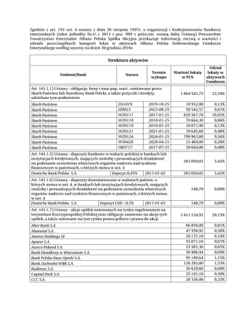Zgodnie z art. 193 ust. 4 ustawy z dnia 28 sierpnia 1997r. o organizacji i funkcjonowaniu funduszy emerytalnych (tekst jednolity Dz.U. z 2013 r. poz. 989 z późn.zm. zwaną dalej Ustawą) Powszechne Towarzystwo Emerytalne Allianz Polska Spółka Akcyjna przekazuje informację roczną o wartości i udziale poszczególnych kategorii lokat w aktywach Allianz Polska Dobrowolnego Funduszu Emerytalnego według wyceny na dzień 30 grudnia 2016r. Struktura aktywów Emitent/Bank Nazwa Termin wykupu Art. 141.1.1) Ustawy - obligacje, bony i inne pap. wart., emitowane przez Skarb Państwa lub Narodowy Bank Polski, a także pożyczki i kredyty, udzielane tym podmiotom Skarb Państwa Skarb Państwa Skarb Państwa Skarb Państwa Skarb Państwa Skarb Państwa Skarb Państwa Skarb Państwa Skarb Państwa DS1019 IZ0823 WZ0117 WZ0118 WZ0119 WZ0121 WZ0124 WS0428 OK0717 2019-10-25 2023-08-25 2017-01-25 2018-01-25 2019-01-25 2021-01-25 2024-01-25 2028-04-25 2017-07-25 Art. 141.1.5) Ustawy - depozyty bankowe w walucie polskiej w bankach lub instytucjach kredytowych, mających siedzibę i prowadzących działalność na podstawie zezwolenia właściwych organów nadzoru nad rynkiem finansowym w państwach, o których mowa w ust. 4 Deutsche Bank Polska S.A. Depozyt 0,45% 2017-01-02 Art. 141.1.6) Ustawy - depozyty denominowane w walutach państw, o których mowa w ust. 4, w bankach lub instytucjach kredytowych, mających siedzibę i prowadzących działalność na podstawie zezwolenia właściwych organów nadzoru nad rynkiem finansowym w państwach, o których mowa w ust. 4 Deutsche Bank Polska S.A. Depozyt USD - 0,5% 2017-01-03 Art. 141.1.7) Ustawy - akcje spółek notowanych na rynku regulowanym na terytorium Rzeczypospolitej Polskiej oraz obligacje zamienne na akcje tych spółek, a także notowane na tym rynku prawa poboru i prawa do akcji Alior Bank S.A. Alumetal S.A. Amrest Holdings SE Apator S.A. Asseco Poland S.A. Bank Handlowy w Warszawie S.A. Bank Polska Kasa Opieki S.A. Bank Zachodni WBK S.A. Budimex S.A. Capital Park S.A. CCC S.A. Wartość lokaty w PLN Udział lokaty w aktywach Funduszu 1 864 541,75 22,54% 10 952,80 50 542,57 828 567,78 70 664,30 10 071,90 39 645,60 790 963,80 23 469,00 39 664,00 0,13% 0,61% 10,02% 0,86% 0,12% 0,48% 9,56% 0,28% 0,48% 283 050,02 3,42% 283 050,02 3,42% 148,70 0,00% 148,70 0,00% 2 411 124,93 29,15% 66 856,00 47 950,92 28 137,10 55 071,16 53 501,36 56 986,94 95 180,64 126 292,00 56 629,60 25 181,10 20 336,00 0,81% 0,58% 0,34% 0,67% 0,65% 0,69% 1,15% 1,53% 0,68% 0,30% 0,25% Ceramika Nowa Gala S.A. Cyfrowy Polsat S.A. Dom Development S.A. Echo Investment S.A. Elektrobudowa S.A. Fabryka Farb i Lakierów Śnieżka S.A. Fabryki Mebli Forte S.A. Globe Trade Centre S.A. Grupa Kęty S.A. Grupa Lotos S.A. Immofinanz AG ING Bank Śląski S.A. Inpro S.A. Inter Cars S.A. Kruk S.A. Mangata Holding S.A. mBank S.A. Newag S.A. Orange S.A. Orbis S.A. OT Logistics S.A. Pfleiderer Group S.A. PKO Bank Polski S.A. Polski Koncern Naftowy ORLEN S.A. Polskie Górnictwo Naftowe i Gazownictwo S.A. Powszechny Zakład Ubezpieczeń S.A. Robyg S.A. Sanok Rubber CompanyS.A. Selena FM S.A. UniCredit S.P.A. Vistula Group S.A. Voxel S.A. Zespół Elektrociepłowni Wrocławskich Kogeneracja S.A. Art. 141.1.9) Ustawy - akcje spółek notowanych na rynku regulowanym w państwach innych niż Rzeczpospolita Polska oraz obligacje zamienne na akcje tych spółek, a także notowane na tych rynkach prawa poboru i prawa do akcji Andritz AG Boeing CO CA Immobilien Anlagen AG DO & CO AG General Electric CO Lockheed Martin CO Osram Licht AG Raytheon CO Zalando SE Art. 141.1.21) Ustawy - będące przedmiotem oferty publicznej na terytorium Rzeczypospolitej Polskiej obligacje emitowane przez inne 2 1 965,60 69 599,25 46 759,14 44 353,43 62 867,60 20 831,85 90 374,90 32 958,75 137 851,98 26 882,72 24 593,02 117 493,52 20 010,00 45 342,72 116 078,82 13 483,60 63 260,19 20 540,00 20 621,90 80 771,18 12 462,48 8 805,60 165 493,85 209 809,60 47 365,36 116 874,30 46 332,00 37 048,05 10 994,50 26 609,48 10 946,10 14 363,70 15 256,92 0,02% 0,84% 0,57% 0,54% 0,76% 0,25% 1,09% 0,40% 1,67% 0,33% 0,30% 1,42% 0,24% 0,55% 1,40% 0,16% 0,76% 0,25% 0,25% 0,98% 0,15% 0,11% 2,00% 2,54% 0,57% 1,41% 0,56% 0,45% 0,13% 0,32% 0,13% 0,17% 0,18% 222 633,70 2,69% 26 797,34 32 531,67 25 497,50 36 727,43 13 206,59 24 025,21 20 279,17 20 771,12 22 797,67 0,32% 0,39% 0,31% 0,44% 0,16% 0,29% 0,25% 0,25% 0,28% 402 607,12 4,87% podmioty niż jednostki samorządu terytorialnego lub ich związki, które zostały zabezpieczone w wysokości odpowiadającej pełnej wartości nominalnej i ewentualnemu oprocentowaniu Multimedia Polska S.A. MMP0520 2020-05-10 402 607,12 4,87% 300 055,32 3,63% 300 055,32 3,63% 1 642 393,85 19,86% 196 978,56 196 731,50 102 418,00 416 691,66 100 077,15 42 163,38 4 026,40 310 902,00 101 341,00 171 064,20 2,38% 2,38% 1,24% 5,04% 1,21% 0,51% 0,05% 3,76% 1,22% 2,07% Art. 141.1.26) Ustawy - będące przedmiotem oferty publicznej na terytorium Rzeczypospolitej Polskiej obligacje i inne dłużne pap. wart., inne niż pap. wart., o których mowa w pkt 15) i 21) 700 231,00 8,47% Ghelamco Invest sp. z o.o. 700 231,00 8,47% Art. 141.1.33) Ustawy - obligacje emitowane przez Bank Gospodarstwa Krajowego na zasadach określonych w ustawie z 27.10.1994r. o autostradach płatnych oraz o Krajowym Funduszu Drogowym 10 835,70 0,13% Bank Gospodarstwa Krajowego 10 835,70 0,13% 10 028,70 0,12% 10 028,70 0,12% 423 540,97 5,12% Art. 141.1.22) Ustawy - inne niż będące przedmiotem oferty publicznej na terytorium Rzeczypospolitej Polskiej obligacje i inne dłużne pap. wart., emitowane przez mające siedzibę na terytorium Rzeczypospolitej Polskiej podmioty inne niż jednostki samorządu terytorialnego lub ich związki, które zostały zabezpieczone w wysokości odpowiadającej wartości nominalnej i ewentualnemu oprocentowaniu Griffin Real Estate Invest Sp. zo.o. GFN1217 2017-12-29 Art. 141.1.25) Ustawy - obligacje i inne dłużne pap. wart., dla któ