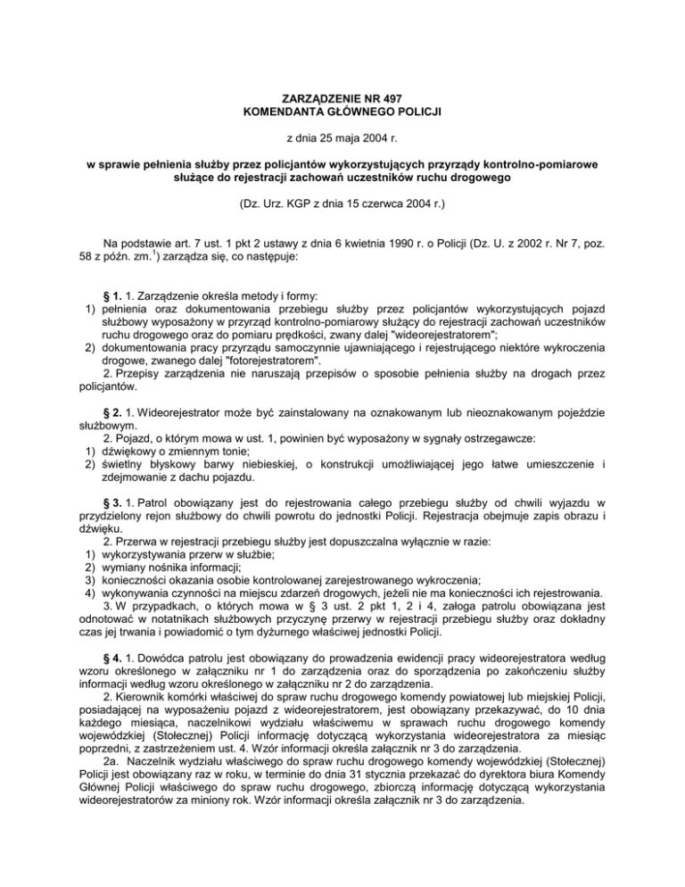 ZARZĄDZENIE NR 497 KOMENDANTA GŁÓWNEGO POLICJI z dnia 25 maja 2004 r. w sprawie pełnienia służby przez policjantów wykorzystujących przyrządy kontrolno-pomiarowe służące do rejestracji zachowań uczestników ruchu drogowego (Dz. Urz. KGP z dnia 15 czerwca 2004 r.) Na podstawie art. 7 ust. 1 pkt 2 ustawy z dnia 6 kwietnia 1990 r. o Policji (Dz. U. z 2002 r. Nr 7, poz. 1 58 z późn. zm. ) zarządza się, co następuje: § 1. 1. Zarządzenie określa metody i formy: 1) pełnienia oraz dokumentowania przebiegu służby przez policjantów wykorzystujących pojazd służbowy wyposażony w przyrząd kontrolno-pomiarowy służący do rejestracji zachowań uczestników ruchu drogowego oraz do pomiaru prędkości, zwany dalej "wideorejestratorem"; 2) dokumentowania pracy przyrządu samoczynnie ujawniającego i rejestrującego niektóre wykroczenia drogowe, zwanego dalej "fotorejestratorem". 2. Przepisy zarządzenia nie naruszają przepisów o sposobie pełnienia służby na drogach przez policjantów. § 2. 1. Wideorejestrator może być zainstalowany na oznakowanym lub nieoznakowanym pojeździe służbowym. 2. Pojazd, o którym mowa w ust. 1, powinien być wyposażony w sygnały ostrzegawcze: 1) dźwiękowy o zmiennym tonie; 2) świetlny błyskowy barwy niebieskiej, o konstrukcji umożliwiającej jego łatwe umieszczenie i zdejmowanie z dachu pojazdu. § 3. 1. Patrol obowiązany jest do rejestrowania całego przebiegu służby od chwili wyjazdu w przydzielony rejon służbowy do chwili powrotu do jednostki Policji. Rejestracja obejmuje zapis obrazu i dźwięku. 2. Przerwa w rejestracji przebiegu służby jest dopuszczalna wyłącznie w razie: 1) wykorzystywania przerw w służbie; 2) wymiany nośnika informacji; 3) konieczności okazania osobie kontrolowanej zarejestrowanego wykroczenia; 4) wykonywania czynności na miejscu zdarzeń drogowych, jeżeli nie ma konieczności ich rejestrowania. 3. W przypadkach, o których mowa w § 3 ust. 2 pkt 1, 2 i 4, załoga patrolu obowiązana jest odnotować w notatnikach służbowych przyczynę przerwy w rejestracji przebiegu służby oraz dokładny czas jej trwania i powiadomić o tym dyżurnego właściwej jednostki Policji. § 4. 1. Dowódca patrolu jest obowiązany do prowadzenia ewidencji pracy wideorejestratora według wzoru określonego w załączniku nr 1 do zarządzenia oraz do sporządzenia po zakończeniu służby informacji według wzoru określonego w załączniku nr 2 do zarządzenia. 2. Kierownik komórki właściwej do spraw ruchu drogowego komendy powiatowej lub miejskiej Policji, posiadającej na wyposażeniu pojazd z wideorejestratorem, jest obowiązany przekazywać, do 10 dnia każdego miesiąca, naczelnikowi wydziału właściwemu w sprawach ruchu drogowego komendy wojewódzkiej (Stołecznej) Policji informację dotyczącą wykorzystania wideorejestratora za miesiąc poprzedni, z zastrzeżeniem ust. 4. Wzór informacji określa załącznik nr 3 do zarządzenia. 2a. Naczelnik wydziału właściwego do spraw ruchu drogowego komendy wojewódzkiej (Stołecznej) Policji jest obowiązany raz w roku, w terminie do dnia 31 stycznia przekazać do dyrektora biura Komendy Głównej Policji właściwego do spraw ruchu drogowego, zbiorczą informację dotyczącą wykorzystania wideorejestratorów za miniony rok. Wzór informacji określa załącznik nr 3 do zarządzenia. 3. Naczelnik wydziału właściwego do spraw ruchu drogowego komendy wojewódzkiej Policji sprawuje nadzór nad sposobem pełnienia oraz dokumentowaniem przebiegu służby przy użyciu wideorejestratora na terenie województwa. 4. Naczelnik Wydziału Ruchu Drogowego Komendy Stołecznej Policji jest odpowiedzialny za opracowywanie informacji, o której mowa w ust. 2. Przepis ust. 3 stosuje się odpowiednio. § 5. 1. Po ujawnieniu faktu popełnienia wykroczenia lub przestępstwa patrol jest obowiązany niezwłocznie podjąć czynności zmierzające do zatrzymania jego sprawcy. 2. Pojazd policyjny powinien być ustawiony za pojazdem zatrzymanym w sposób umożliwiający rejestrację przebiegu czynności kontrolnych. § 6. Dowódca patrolu po zakończeniu służby jest obowiązany: 1) przekazać materiał zarejestrowany przez wideorejestrator kierownikowi komórki właściwej do spraw ruchu drogowego jednostki Policji, w której policjant pełni służbę, a w razie jego nieobecności policjantowi dokonującemu rozliczenia ze służby; 2) zgłosić fakt zarejestrowania materiałów, które mogą być przydatne w działalności profilaktyczno-szkoleniowej prowadzonej przez Policję. § 7. 1. Kierownik, o którym mowa w § 6 pkt 1: 1) prowadzi rejestr przechowywanych materiałów oraz zobowiązany jest do ich przechowywania przez okres nie krótszy niż 30 dni; 2) wyznacza osobę odpowiedzialną za przeglądanie materiałów, o których mowa w § 6 pkt 2, oraz kopiowanie ich fragmentów, przekazywanych następnie do właściwej miejscowo komendy wojewódzkiej (Stołecznej) Policji; 2. Dopuszcza się niestosowanie przepisu, o którym mowa w ust. 1 pkt 1, jeżeli wykroczenie zarejestrowano urządzeniem cyfrowym, a na sprawcę wykroczenia nałożono mandat karny albo zastosowano wobec niego środek określony w art. 41 kodeksu wykroczeń. § 8. Kierownik jednostki organizacyjnej Policji zapewnia odpowiednią liczbę: 1) kaset magnetowidowych lub innych nośników informacji w ilości niezbędnej do dokumentowania pracy patroli; 2) urządzeń umożliwiających przeglądanie zarejestrowanych materiałów i ich kopiowanie. § 9. 1. Po upływie okresu, o którym mowa w § 7 pkt 1, zarejestrowane materiały podlegają skasowaniu, a nośniki są przekazywane do ponownego wykorzystania przez patrole. 2. W przypadku, gdy zarejestrowane materiały stanowią dowód w sprawie, czas ich przechowywania trwa do ustania przyczyn, dla których je zabezpieczono. Decyzję o ich skasowaniu podejmuje kierownik komórki właściwej do spraw ruchu drogowego. 2a. W przypadku określonym w § 7 ust. 2 sk