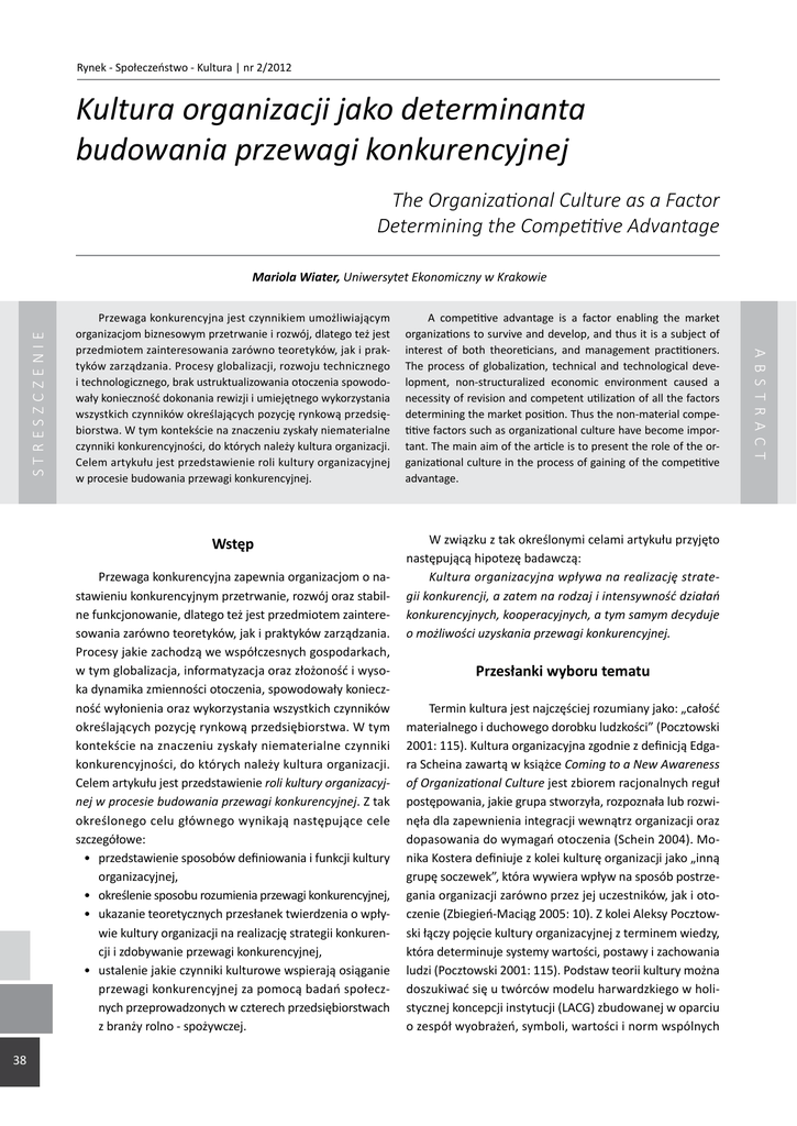 Rynek - Społeczeństwo - Kultura | nr 2/2012 Kultura organizacji jako determinanta budowania przewagi konkurencyjnej The Organizational Culture as a Factor Determining the Competitive Advantage Przewaga konkurencyjna jest czynnikiem umożliwiającym organizacjom biznesowym przetrwanie i rozwój, dlatego też jest przedmiotem zainteresowania zarówno teoretyków, jak i praktyków zarządzania. Procesy globalizacji, rozwoju technicznego i technologicznego, brak ustruktualizowania otoczenia spowodowały konieczność dokonania rewizji i umiejętnego wykorzystania wszystkich czynników określających pozycję rynkową przedsiębiorstwa. W tym kontekście na znaczeniu zyskały niematerialne czynniki konkurencyjności, do których należy kultura organizacji. Celem artykułu jest przedstawienie roli kultury organizacyjnej w procesie budowania przewagi konkurencyjnej. A competitive advantage is a factor enabling the market organizations to survive and develop, and thus it is a subject of interest of both theoreticians, and management practitioners. The process of globalization, technical and technological development, non-structuralized economic environment caused a necessity of revision and competent utilization of all the factors determining the market position. Thus the non-material competitive factors such as organizational culture have become important. The main aim of the article is to present the role of the organizational culture in the process of gaining of the competitive advantage. Wstęp W związku z tak określonymi celami artykułu przyjęto następującą hipotezę badawczą: Kultura organizacyjna wpływa na realizację strategii konkurencji, a zatem na rodzaj i intensywność działań konkurencyjnych, kooperacyjnych, a tym samym decyduje o możliwości uzyskania przewagi konkurencyjnej. Przewaga konkurencyjna zapewnia organizacjom o nastawieniu konkurencyjnym przetrwanie, rozwój oraz stabilne funkcjonowanie, dlatego też jest przedmiotem zainteresowania zarówno teoretyków, jak i praktyków zarządzania. Procesy jakie zachodzą we współczesnych gospodarkach, w tym globalizacja, informatyzacja oraz złożoność i wysoka dynamika zmienności otoczenia, spowodowały konieczność wyłonienia oraz wykorzystania wszystkich czynników określających pozycję rynkową przedsiębiorstwa. W tym kontekście na znaczeniu zyskały niematerialne czynniki konkurencyjności, do których należy kultura organizacji. Celem artykułu jest przedstawienie roli kultury organizacyjnej w procesie budowania przewagi konkurencyjnej. Z tak określonego celu głównego wynikają następujące cele szczegółowe: • przedstawienie sposobów definiowania i funkcji kultury organizacyjnej, • określenie sposobu rozumienia przewagi konkurencyjnej, • ukazanie teoretycznych przesłanek twierdzenia o wpływie kultury organizacji na realizację strategii konkurencji i zdobywanie przewagi konkurencyjnej, • ustalenie jakie czynniki kulturowe wspierają osiąganie przewagi konkurencyjnej za pomocą badań społecznych przeprowadzonych w czterech przedsiębiorstwach z branży rolno - spożywczej. 38 Przesłanki wyboru tematu Termin kultura jest najczęściej rozumiany jako: „całość materialnego i duchowego dorobku ludzkości” (Pocztowski 2001: 115). Kultura organizacyjna zgodnie z definicją Edgara Scheina zawartą w książce Coming to a New Awareness of Organizational Culture jest zbiorem racjonalnych reguł postępowania, jakie grupa stworzyła, rozpoznała lub rozwinęła dla zapewnienia integracji wewnątrz organizacji oraz dopasowania do wymagań otoczenia (Schein 2004). Monika Kostera definiuje z kolei kulturę organizacji jako „inną grupę soczewek”, która wywiera wpływ na sposób postrzegania organizacji zarówno przez jej uczestników, jak i otoczenie (Zbiegień-Maciąg 2005: 10). Z kolei Aleksy Pocztowski łączy pojęcie kultury organizacyjnej z terminem wiedzy, która determinuje systemy wartości, postawy i zachowania ludzi (Pocztowski 2001: 115). Podstaw teorii kultury można doszukiwać się u twórców modelu harwardzkiego w holistycznej koncepcji instytucji (LACG) zbudowanej w oparciu o zespół wyobrażeń, symboli, wartości i norm wspólnych A B ST RAC T STRESZCZENIE Mariola Wiater, Uniwersytet Ekonomiczny w Krakowie Mariola Wiater - Kultura organizacji jako... uczestnikom organizacji, godzących sprzeczne interesy, zapewniających realizację celów oraz stanowiących część systemu jakim jest organizacja (Prahalad, Hamel 1990: 6). Kultura jest zatem swoistą charakterystyką organizacji, wszystkie bowiem przedsiębiorstwa i instytucje posiadają swoisty zbiór wartości, norm i przekonań tworzących podstawę ich funkcjonowania oraz wszelkich działań, także tych podejmowanych na rynku. Charakterystyczne dla organizacji ze sfery biznesu jest formułowanie strategii konkurencji w celu osiągnięcia przewagi konkurencyjnej, która stanowi wyraz efektywności działania organizacji i skuteczności w realizacji celów (Faulkner, Bowman 1996: 163). Do docenienia roli strategii w procesie zdobywania przewagi konkurencyjnej przyczyniły się procesy globalizacji, informatyzacji i rozwoju technologicznego, którym podlegają współczesne gospodarki. Mały stopień ustrukturalizowania otoczenia i rosnące tempo zmian, jakie w nim zachodzą, uniemożliwiały przewidzenie jak będą zmieniały się warunki prowadzenia działalności (Godziszewski 2001: 6). Wzrost konkurencji na rynku jest równie często wskazywany jako źródło dostrzeżenia i docenienia znaczenia strategicznego podejścia do prowadzenia działalności oraz przypisania strategii roli warunku przetrwania na rynku (Barczak, Bartusik 1999: 5). Według Michaela Portera strategia konkurencji ma wskazać metody efektywnego konkurowania na rynku, co ma na celu wzmocnienie pozycji rynkowej organizacji (Porter 1994: 10). Jak zostało wspomniane, procesy globalizacji rozwoju technicznego i technologicznego, brak