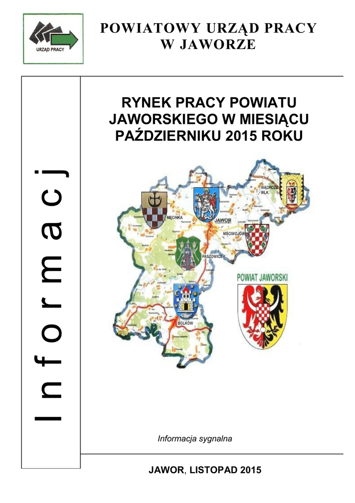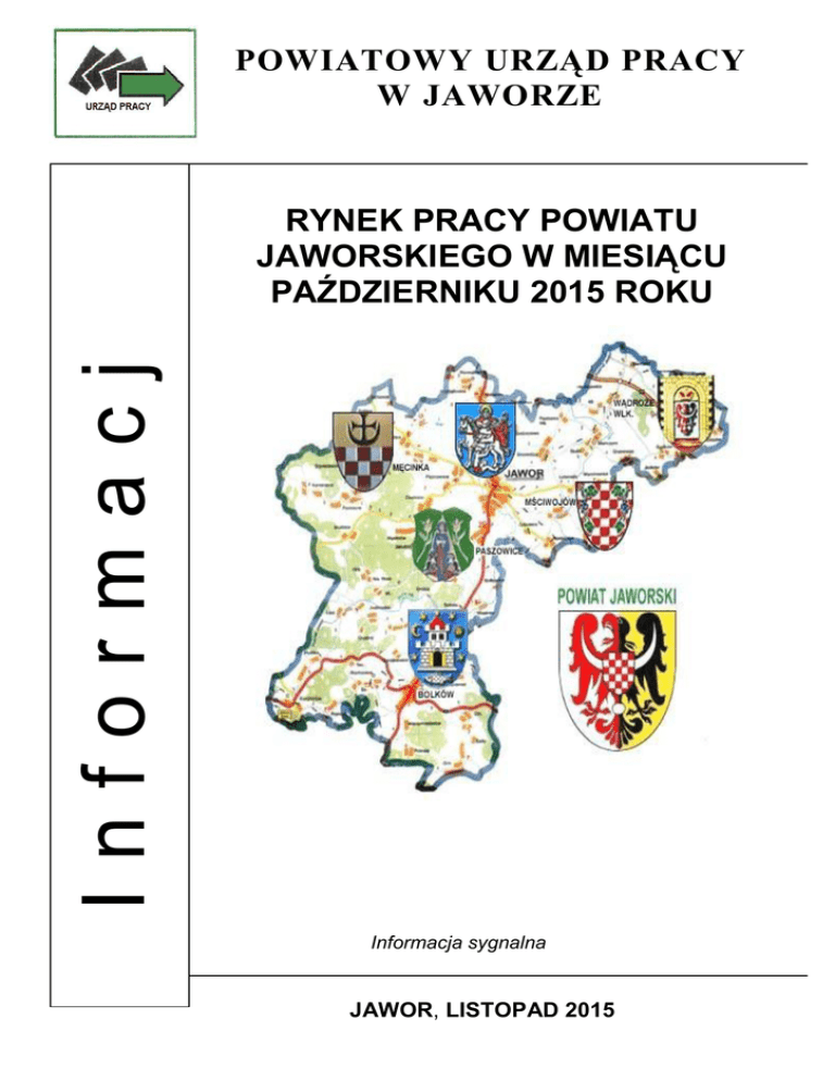 POWIATOWY URZĄD PRACY W JAWORZE Informacj a RYNEK PRACY POWIATU JAWORSKIEGO W MIESIĄCU PAŹDZIERNIKU 2015 ROKU Informacja sygnalna JAWOR, LISTOPAD 2015 INFORMACJA SYGNALNA O SYTUACJI NA RYNKU PRACY W POWIECIE JAWORSKIM W MIESIĄCU PAŹDZIERNIKU 2015 ROKU 1. W miesiącu październiku 2015 r. zanotowano w powiecie jaworskim spadek liczby osób pozostających bez pracy. Liczba zarejestrowanych bezrobotnych zmniejszyła się w porównaniu do stanu z miesiąca poprzedniego o 13 osób tj. o 0,5%. Na koniec okresu sprawozdawczego w ewidencji urzędu pozostawało 2610 osób. 2. W miesiącu sprawozdawczym zarejestrowało się 381 osób bezrobotnych. Po raz kolejny zarejestrowało się 328 osób. Osoby zarejestrowanie po raz pierwszy stanowiły 13,9%. Najliczniejszą grupę rejestrujących się stanowiły osoby do 30 roku życia – 173 osoby (w tym 111 osób do 25 roku życia) oraz osoby, które w okresie ostatnich dwóch lat pozostawały w rejestrze urzędu pracy łącznie przez okres ponad 12 miesięcy – 118 osób, a do 50 roku życia 72 osoby. 3. W miesiącu październiku 2015 r. z ewidencji bezrobotnych wyłączono 394 osoby bezrobotne. Pracę podjęło 206 osób, z tego 167 pracę stałą. Do odbycia stażu skierowano 12 osób, natomiast z powodu braku gotowości do podjęcia pracy wyłączono z ewidencji 73 osoby. 4. W końcu miesiąca sprawozdawczego bezrobotni posiadający prawo do zasiłku w liczbie 462 osób, stanowili blisko 17,7% ogółu bezrobotnych. Wśród osób nowo zarejestrowanych warunki uzasadniające przyznanie prawa do zasiłku spełniało 71 osób. W analogicznym okresie roku 2014 liczba osób z prawem do zasiłku wynosiła 447. 5. W miesiącu październiku do urzędu pracy zgłosiło się 111 osób bezrobotnych do 25 roku życia, wyrejestrowało się natomiast 109 osób, w tym z powodu podjęcia pracy 54 osoby oraz 6 osób z tytułu rozpoczęcia stażu. Według stanu w końcu miesiąca sprawozdawczego, w ewidencji urzędu pozostawało 328 osób bezrobotnych w tej kategorii wiekowej, tj. 12,6% ogółu bezrobotnych. W analogicznym okresie roku 2014 liczba bezrobotnych w tej kategorii wynosiła 468 osób. 6. W październiku br. zarejestrowane zostały 173 osoby bezrobotne do 30 roku życia, wyrejestrowało się natomiast 171 osób, w tym z powodu podjęcia pracy 89 osób oraz 8 osób z tytułu rozpoczęcia stażu. Według stanu w końcu miesiąca sprawozdawczego, w ewidencji urzędu pozostawało 645 osób bezrobotnych w tej kategorii wiekowej, tj. 24,7% ogółu bezrobotnych. 7. W końcu miesiąca sprawozdawczego bezrobotni powyżej 50 roku życia w liczbie 848 osób stanowili 32,5% bezrobotnych ogółem. Napływ do bezrobocia w tej kategorii wyniósł w tym okresie 72 osoby. W omawianym okresie 68 osób zostało wyrejestrowanych, z tego 31 osób podjęło pracę. W analogicznym okresie roku 2014 liczba bezrobotnych w tej kategorii wynosiła 864 osoby. 8. Liczba osób długotrwale bezrobotnych, tj. pozostających w rejestrach urzędu pracy łącznie przez ponad 12 miesięcy w okresie ostatnich dwóch lat, kształtowała się na poziomie 1492 osób, a ich udział w ogólnej liczbie bezrobotnych wynosił 57,2%. W wyniku działań, skierowanych do tej grupy bezrobotnych w miesiącu październiku, pracę podjęło 62 osoby. W analogicznym okresie roku 2014 w rejestrach urzędu pozostawało 1837 osób długotrwale bezrobotnych. 9. W miesiącu październiku w lepszej sytuacji na rynku pracy znajdowały się osoby zamieszkałe na wsi. Liczba zarejestrowanych bezrobotnych zamieszkałych w mieście nie uległa zmianie, natomiast na wsi zmnieszyła się o 13 osób tj. o 0,5%. Udział tej kategorii bezrobotnych w ogólnej liczbie bezrobotnych w końcu miesiąca wynosił odpowiednio 50,8% (w mieście) i 49,2% (na wsi). Należy dodać, że w analogicznym okresie roku 2014, udział tych populacji w liczbach bezwzględnych wynosił odpowiednio 1521 (miasto) i 1448 (wieś). 2 INFORMACJA SYGNALNA O SYTUACJI NA RYNKU PRACY W POWIECIE JAWORSKIM W MIESIĄCU PAŹDZIERNIKU 2015 ROKU 10. W miesiącu październiku korzystniej przedstawiała się sytuacja kobiet. Bezrobocie wśród mężczyzn zwiększyło się o 37 osób, a bezrobotni w tej kategorii stanowili 49,0% ogółu zarejestrowanych, natomiast bezrobocie wśród kobiet zmniejszyło się o 50 osób i stanowiło to 51,0% ogółu zarejestrowanych. 11. Współczynnik płynności rynku pracy (tj. liczba osób bezrobotnych, które podjęły pracę do liczby osób nowo zarejestrowanych) w miesiącu październiku 2015 r. ukształtował się na poziomie 54,1% W poprzednich miesiącach współczynnik płynności rynku pracy wynosił odpowiednio: lipiec 50,3%, sierpień 47,2%, wrzesień 52,3% 12. W miesiącu październiku 2015 r. do urzędu pracy pracodawcy zgłosili 151 ofert zatrudnienia, w tym 29 ofert dotyczyło pracy subsydiowanej. Zakłady z sektora prywatnego zgłosiły 90,1% wszystkich ofert pracy. 13. W miesiącu październiku 2015 r., ogółem 11 osób bezrobotnych (mężczyzn) skierowano na szkolenia wskazane, z liczby tej: 6 osób bezrobotnych, w wieku do 30 roku życia, uczestniczy w szkoleniach wskazanych finansowanych ze środków Unii Europejskiej w ramach Europejskiego Funduszu Społecznego Programu Operacyjnego Wiedza Edukacja Rozwój (PO WER), Oś Priorytetowa I: Osoby młode na rynku pracy. Działanie: 1.1 Wsparcie osób młodych bez pracy na regionalnym rynku pracy. Poddziałanie: 1.1.2 Wsparcie udzielane z Inicjatywy na rzecz zatrudnienia ludzi młodych, tytuł projektu: Aktywizacja osób młodych pozostających bez pracy w powiecie jaworskim, z tego: 3 osoby bezrobotne uczestniczy w szkoleniu wskazanym, w ramach bonu szkoleniowego. Tematyka szkoleń (PO WER): Prawo jazdy kat. C+E z kwalifikacją wstępną przyspieszoną - 2 osoby, Prawo jazdy kat. BE – 1 osoba, Kurs kwalifikacji wstępnej przyspieszonej – 1 osoba, w ramach bonu szkoleniowego, Prawo jazdy kat. C z kwalifikacją wstępną – 1 osoba , w ramach bonu szkolenio