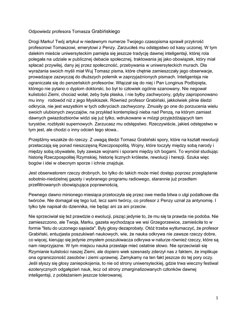 Odpowiedz profesora Tomasza Grabińskiego Drogi Marku! Twój artykuł w niedawnym numerze Twojego czasopisma sprawił przykrość profesorowi Tomaszowi, emerytowi z Penzy. Zarzuciłeś mu odstępstwo od kasy uczonej. W tym dalekim mieście uniwersyteckim pamięta się jeszcze tradycję dawnej inteligentsji, której rola polegała na udziale w publicznej debacie społecznej, traktowania jej jako obowiązek, który miał spłacać przywilej, dany jej przez społeczność, przebywania w uniwersyteckich murach. Dla wyrażania swoich myśli miał Wuj Tomasz pisma, które chętnie zamieszczały jego obserwacje, prowadzące zazwyczaj do dłuższych polemik w zaprzyjaźnionych pismach. Inteligentsja nie ograniczała się do penzeńskich profesorów. Włączał się do niej i Pan Longinus Podbipięta, którego nie pytano o dyplom doktorski, bo był to człowiek ogólnie szanowany. Nie negował kulistości Ziemi, chociaż wołał, żeby była płaska, i nie byłby zachwycony, gdyby zaproponowano mu inny rodowód niż z jego Mysikiszek. Również profesor Grabiński, jakkolwiek pilnie śledzi odkrycia, nie jest wszystkim w tych odkryciach zachwycony. Zmusiły go one do porzucenia wielu swoich ulubionych zwyczajów, na przykład kontemplacji nieba nad Penzą, na którym zamiast dawnych gwiazdozbiorów widzi się już tylko, wdrukowane w mózgi przyjeżdżających tam turystów, rozbłyski supernowych. Zarzucasz mu odstępstwo. Rzeczywiście, jakieś odstępstwo w tym jest, ale chodzi o inny odcień tego słowa.. Przejdźmy wszakże do rzeczy. Z uwagą śledzi Tomasz Grabiński spory, które na kształt rewolucji przetaczają się ponad nieszczęsną Rzeczpospolitą. Wojny, które toczyły między sobą narody i między sobą obywatele, były zawsze wojnami i sporami między ich bogami. To wyniósł studiując historię Rzeczpospolitej Rzymskiej, historię licznych królestw, rewolucji i herezji. Szuka więc bogów i idei w obecnym sporze i ichnie znajduje. Jest obserwatorem rzeczy drobnych, bo tylko do takich może mieć dostęp poprzez przeglądanie sobotnio-niedzielnej gazety i wybranego programu radiowego, starannie już przedtem przefiltrowanych obowiązująca poprawnością. Pewnego dawno minionego miesiąca przetoczyła się przez owe media bitwa o ulgi podatkowe dla twórców. Nie domagał się tego lud, lecz sami twórcy, co profesor z Penzy uznał za antynomię. l tylko tyle napisał do dziennika, nie będąc ani za ani przeciw. Nie sprzeciwiał się też prawdzie o ewolucji, pisząc jedynie to, że mu się ta prawda nie podoba. Nie zamieszczono, ale Twoja, Marku, gazeta wychodząca we wsi Grzegorzewice, zamieściła to w formie "listu do uczonego sąsiada". Były głosy dezaprobaty. Otóż trzeba wytłumaczyć, że profesor Grabiński, entuzjasta poszukiwań naukowych, wie, że nauka odkrywa nie zawsze rzeczy dobre, co więcej, kierując się jedynie zmysłem poszukiwacza odkrywa w naturze również rzeczy, które są nam nieprzyjazne. W tym miejscu nauka przestaje mieć ostatnie słowo. Nie sprzeciwiali się Rzymianie kulistości naszej Ziemi, ale dopiero wiek szesnasty zderzył nas z faktem, że implikuje ona ograniczoność zasobów i ziemi uprawnej. Zamykamy na ten fakt jeszcze do tej pory oczy. Jeśli słyszy się głosy zaniepokojenia, to nie od strony uniwersyteckiej, gdzie trwa wieczny festiwal ezoterycznych odgałęzień nauk, lecz od strony zmarginalizowanych członków dawnej inteligentsji, z pobłażaniem jeszcze tolerowanej. 1 Ale też i atakowanej. Przypisuje się jej, że nie przyjmuje prawd odkrytych przez Cricka i Watsona, ba nawet praw Mendla. Jej wysiłki dla wyjścia na przeciw konsekwencjom odkryć, traktowane są przez ludzi z uniwersytetów jako sprzeciw postępowi. Czy musiał powiedzieć to za nich dawny nasz prezydent, że „są plusy dodatnie i ujemne"? Ale może ta właśnie dosadność była konieczna, aby przypomnieć, że postęp już od dawna stracił swój znak, a także i jakikolwiek kierunek. Jesteśmy o przeszło dwa stulecia mądrzejsi od ludzi osiemnastego wieku. Oświecenie oświeca nas w jednym kierunku, którego nawet sobie sami nie wybieramy. Rozwiązujemy zadania, nie pytając kto je nam stawia. O matematykach powiedział kiedyś Arystoteles, że stawia im zadania Filozof. Nie całkiem miał rację bo uczonym postawić zadanie może ktokolwiek. Cieszą się z rozwiązania jak stolarz, któremu udał się stół. Ale patrzymy często na naukę poprzez to, co widzimy patrząc na dawne Royal Society z czasów Newtona i na wielką matematykę niemiecką XIX wieku, gdzie Cantor i Riemann. Coś się od tego czasu w świecie zaczęło jednak zmieniać. Oto uczeni zgromadzeni w Senacie Uczelni przegłosowują jednomyślnie bez uprzedniej dyskusji, że pewna procedura, obowiązująca wszystkich obywateli, ich nie obowiązuje. Najtrudniej mówić o rzeczach oczywistych. Wielość argumentów atakuje wtedy myśl, a jej uczciwość podsuwa kontrprzykłady. Przerwijmy więc męczące wewnętrzne rozważania i powiedzmy za Panem Podbipiętą, że to przecież „niepięknie", a od siebie wyraźmy to prościej: nie wiem o co chodzi, ale to mi się nie podoba. Profesor Grabiński, nie roszcząc sobie miana specjalisty w żadnej ze słyszanych mu nauk, powodowany jest dociekaniem, we wszystkim z czym się styka, ostatecznej praprzyczyny, co jest jego przymusem myślowym, jak również i innych jego kolegów z zacnego Uniwersytetu. Pisząc list do uczonego sąsiada " próbował umiejscowić praprzyczynę w pitagoreizmie ukorzenionym jakoby w klasie uczonej. Ale żaden z uczonych, których znał, czy to sam, czy to poprzez ich dzieła, nie należał do żadnego Zakonu. Przypomniał sobie zatem teraz, a czytaną dawno kiedyś, rzecz Weizsackera „Część i całość", a także książkę Stevena Weinberga o „teorii ostatecznej", gdzie autorzy zwracali uwagę na niemal przeciwieństwo, jakie ma miejsce między elementem a całością. Dla siebie zostawił tylko 