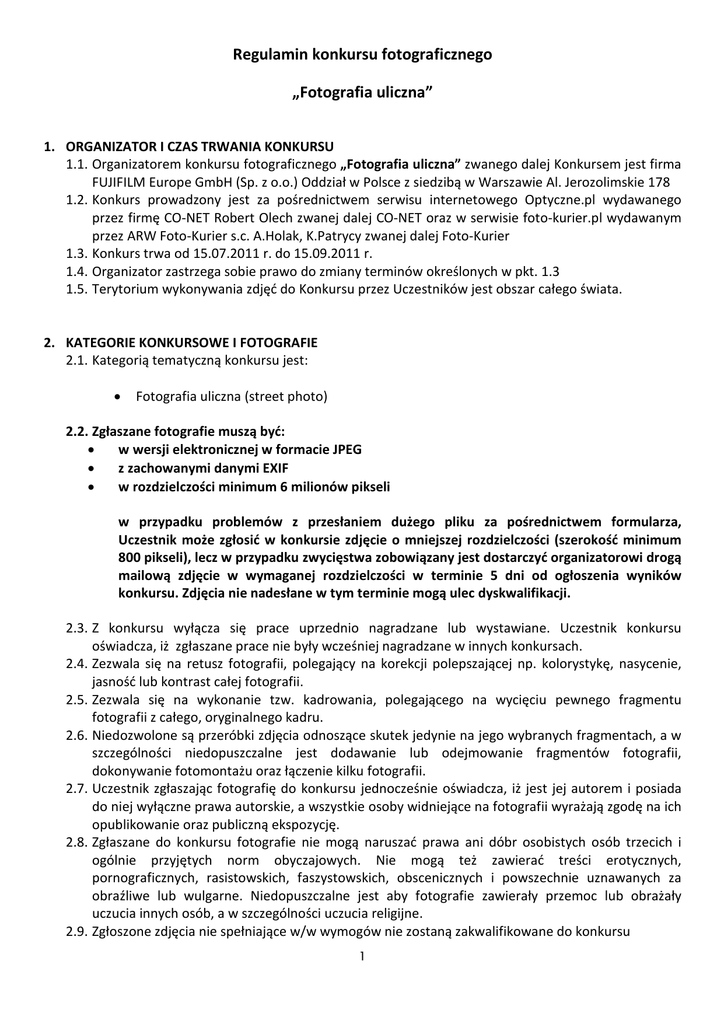 Regulamin konkursu fotograficznego „Fotografia uliczna” 1. ORGANIZATOR I CZAS TRWANIA KONKURSU 1.1. Organizatorem konkursu fotograficznego „Fotografia uliczna” zwanego dalej Konkursem jest firma FUJIFILM Europe GmbH (Sp. z o.o.) Oddział w Polsce z siedzibą w Warszawie Al. Jerozolimskie 178 1.2. Konkurs prowadzony jest za pośrednictwem serwisu internetowego Optyczne.pl wydawanego przez firmę CO-NET Robert Olech zwanej dalej CO-NET oraz w serwisie foto-kurier.pl wydawanym przez ARW Foto-Kurier s.c. A.Holak, K.Patrycy zwanej dalej Foto-Kurier 1.3. Konkurs trwa od 15.07.2011 r. do 15.09.2011 r. 1.4. Organizator zastrzega sobie prawo do zmiany terminów określonych w pkt. 1.3 1.5. Terytorium wykonywania zdjęć do Konkursu przez Uczestników jest obszar całego świata. 2. KATEGORIE KONKURSOWE I FOTOGRAFIE 2.1. Kategorią tematyczną konkursu jest: • Fotografia uliczna (street photo) 2.2. Zgłaszane fotografie muszą być: • w wersji elektronicznej w formacie JPEG • z zachowanymi danymi EXIF • w rozdzielczości minimum 6 milionów pikseli w przypadku problemów z przesłaniem dużego pliku za pośrednictwem formularza, Uczestnik może zgłosić w konkursie zdjęcie o mniejszej rozdzielczości (szerokość minimum 800 pikseli), lecz w przypadku zwycięstwa zobowiązany jest dostarczyć organizatorowi drogą mailową zdjęcie w wymaganej rozdzielczości w terminie 5 dni od ogłoszenia wyników konkursu. Zdjęcia nie nadesłane w tym terminie mogą ulec dyskwalifikacji. 2.3. Z konkursu wyłącza się prace uprzednio nagradzane lub wystawiane. Uczestnik konkursu oświadcza, iż zgłaszane prace nie były wcześniej nagradzane w innych konkursach. 2.4. Zezwala się na retusz fotografii, polegający na korekcji polepszającej np. kolorystykę, nasycenie, jasność lub kontrast całej fotografii. 2.5. Zezwala się na wykonanie tzw. kadrowania, polegającego na wycięciu pewnego fragmentu fotografii z całego, oryginalnego kadru. 2.6. Niedozwolone są przeróbki zdjęcia odnoszące skutek jedynie na jego wybranych fragmentach, a w szczególności niedopuszczalne jest dodawanie lub odejmowanie fragmentów fotografii, dokonywanie fotomontażu oraz łączenie kilku fotografii. 2.7. Uczestnik zgłaszając fotografię do konkursu jednocześnie oświadcza, iż jest jej autorem i posiada do niej wyłączne prawa autorskie, a wszystkie osoby widniejące na fotografii wyrażają zgodę na ich opublikowanie oraz publiczną ekspozycję. 2.8. Zgłaszane do konkursu fotografie nie mogą naruszać prawa ani dóbr osobistych osób trzecich i ogólnie przyjętych norm obyczajowych. Nie mogą też zawierać treści erotycznych, pornograficznych, rasistowskich, faszystowskich, obscenicznych i powszechnie uznawanych za obraźliwe lub wulgarne. Niedopuszczalne jest aby fotografie zawierały przemoc lub obrażały uczucia innych osób, a w szczególności uczucia religijne. 2.9. Zgłoszone zdjęcia nie spełniające w/w wymogów nie zostaną zakwalifikowane do konkursu 1 3. UCZESTNICY KONKURSU 3.1. W konkursie mogą brać udział wyłącznie osoby fizyczne, które są pełnoletnie i zamieszkują na terytorium Rzeczypospolitej Polskiej, lub posiadają adres korespondencyjny na terenie Rzeczypospolitej Polskiej. Osoby biorące udział w konkursie zwane są Uczestnikami. 3.2. W konkursie nie mogą brać udziału pracownicy i przedstawiciele firm FUJIFILM Europe GmbH (Sp. z o.o.) Oddział w Polsce, CO-NET, Foto-Kurier oraz osoby zaangażowane w przygotowanie i prowadzenie konkursu, w tym także członkowie ich rodzin i osoby im najbliższe. 3.3. Uczestnicy nie spełniający któregokolwiek z w/w warunków zostaną wykluczeni z udziału w konkursie. 4. UDZIAŁ W KONKURSIE 4.1. Aby wziąć udział w konkursie należy: • • • Przesłać fotografię konkursową za pośrednictwem formularza dostępnego na stronie http://www.optyczne.pl/konkurs lub wgrać do serwisu www.foto-kurier.pl Wypełnić formularz, w którym należy podać: o Tytuł pracy (fotografii) o Imię i nazwisko o Miejscowość zamieszkania o Adres e-mail Oświadczyć, iż zapoznało się z niniejszym regulaminem konkursu i przyjmuje się jego postanowienia 4.2. Osoby, które w formularzu podadzą nieprawdziwe dane, lub nie spełnią warunków określonych w punkcie 4.1 zostaną wykluczone z konkursu. 4.3. Osoby, które dokonają zgłoszenia i prześlą zdjęcia po zakończeniu konkursu nie będą brały w nim udziału. 4.4. Udział w konkursie jest bezpłatny. 4.5. Uczestnicy konkursu, poprzez fakt przystąpienia do niego, wyrażają zgodę na wykorzystanie przez Organizatora i firmy CO-NET oraz Foto-Kurier ich danych dla potrzeb przeprowadzenia niniejszego konkursu, na warunkach określonych w ustawie z dnia 29 sierpnia 1997 r. o ochronie danych osobowych (tekst jednolity Dz.U. z 2002, Nr 101, poz. 926). Administratorem danych osobowych zebranych podczas niniejszego konkursu jest – w rozumieniu ustawy z dnia 29 sierpnia 1997 r. o ochronie danych osobowych (tekst jednolity Dz.U. z 2002, Nr 101, poz. 926.) – Organizator. W szczególności Uczestnik konkursu wyraża zgodę na opublikowanie jego imienia, nazwiska, miejscowości zamieszkania, wieku w materiałach związanych z Konkursem. 4.6. Przekazanie prac konkursowych, jest równoznaczne z udzieleniem Organizatorowi zgody na bezpłatne wykorzystanie w/w prac bezterminowo, bez żadnych ograniczeń terytorialnych, we wszystkich znanych w chwili podania formach przekazu, takich jak formy audio, video, druki oraz Internet, jak również prawo na dokonywanie dowolnych opracowań i modyfikacji prac, wraz z prawem do wykorzystania wyników opracowania w podanej wyżej formie, a w szczególności do publikacji zdjęć na stronach internetowych wydawanych przez organizatora i firmy CO-NET oraz Foto-Kurier. 4.7. Uczestnik konkursu zgłaszający prace poprzez fakt przystąpienia do konkursu wyraża zgodę na to, iż z dniem przekazania organizatorowi zdjęć udziela Organizatorowi i firmom CO-NE