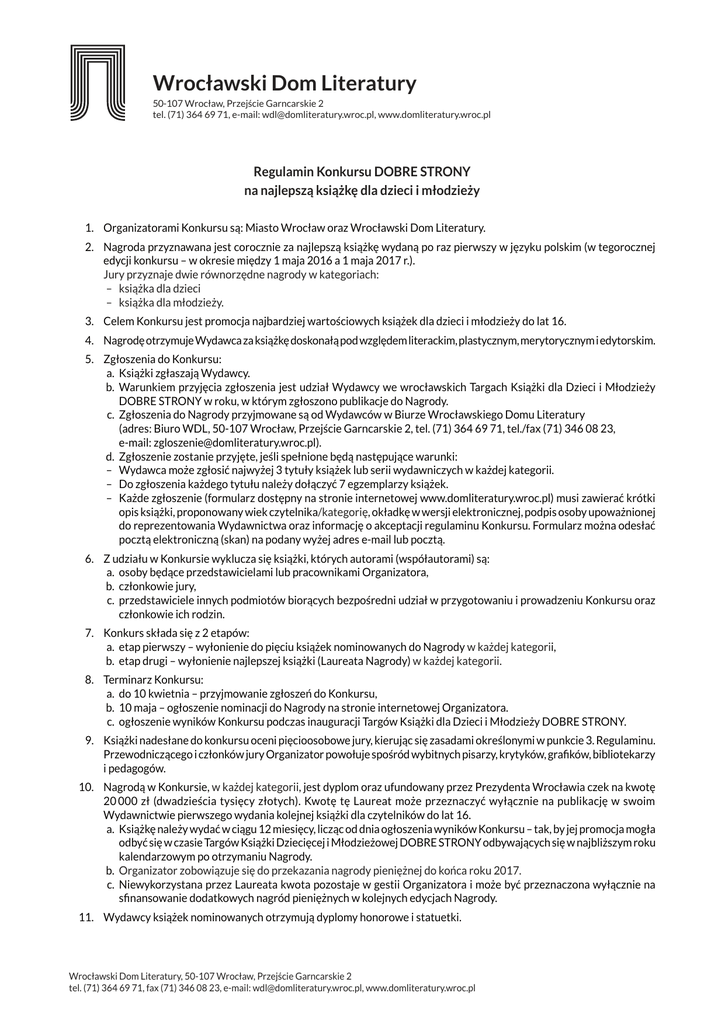 Wrocławski Dom Literatury 50-107 Wrocław, Przejście Garncarskie 2 tel. (71) 364 69 71, e-mail: [email protected], www.domliteratury.wroc.pl Regulamin Konkursu DOBRE STRONY na najlepszą książkę dla dzieci i młodzieży 1. Organizatorami Konkursu są: Miasto Wrocław oraz Wrocławski Dom Literatury. 2. Nagroda przyznawana jest corocznie za najlepszą książkę wydaną po raz pierwszy w języku polskim (w tegorocznej edycji konkursu – w okresie między 1 maja 2016 a 1 maja 2017 r.). Jury przyznaje dwie równorzędne nagrody w kategoriach: – książka dla dzieci – książka dla młodzieży. 3. Celem Konkursu jest promocja najbardziej wartościowych książek dla dzieci i młodzieży do lat 16. 4. Nagrodę otrzymuje Wydawca za książkę doskonałą pod względem literackim, plastycznym, merytorycznym i edytorskim. 5. Zgłoszenia do Konkursu: a. Książki zgłaszają Wydawcy. b. Warunkiem przyjęcia zgłoszenia jest udział Wydawcy we wrocławskich Targach Książki dla Dzieci i Młodzieży DOBRE STRONY w roku, w którym zgłoszono publikacje do Nagrody. c. Zgłoszenia do Nagrody przyjmowane są od Wydawców w Biurze Wrocławskiego Domu Literatury (adres: Biuro WDL, 50-107 Wrocław, Przejście Garncarskie 2, tel. (71) 364 69 71, tel./fax (71) 346 08 23, e-mail: [email protected]). d. Zgłoszenie zostanie przyjęte, jeśli spełnione będą następujące warunki: – Wydawca może zgłosić najwyżej 3 tytuły książek lub serii wydawniczych w każdej kategorii. – Do zgłoszenia każdego tytułu należy dołączyć 7 egzemplarzy książek. – Każde zgłoszenie (formularz dostępny na stronie internetowej www.domliteratury.wroc.pl) musi zawierać krótki opis książki, proponowany wiek czytelnika/kategorię, okładkę w wersji elektronicznej, podpis osoby upoważnionej do reprezentowania Wydawnictwa oraz informację o akceptacji regulaminu Konkursu. Formularz można odesłać pocztą elektroniczną (skan) na podany wyżej adres e-mail lub pocztą. 6. Z udziału w Konkursie wyklucza się książki, których autorami (współautorami) są: a. osoby będące przedstawicielami lub pracownikami Organizatora, b. członkowie jury, c. przedstawiciele innych podmiotów biorących bezpośredni udział w przygotowaniu i prowadzeniu Konkursu oraz członkowie ich rodzin. 7. Konkurs składa się z 2 etapów: a. etap pierwszy – wyłonienie do pięciu książek nominowanych do Nagrody w każdej kategorii, b. etap drugi – wyłonienie najlepszej książki (Laureata Nagrody) w każdej kategorii. 8. Terminarz Konkursu: a. do 10 kwietnia – przyjmowanie zgłoszeń do Konkursu, b. 10 maja – ogłoszenie nominacji do Nagrody na stronie internetowej Organizatora. c. ogłoszenie wyników Konkursu podczas inauguracji Targów Książki dla Dzieci i Młodzieży DOBRE STRONY. 9. Książki nadesłane do konkursu oceni pięcioosobowe jury, kierując się zasadami określonymi w punkcie 3. Regulaminu. Przewodniczącego i członków jury Organizator powołuje spośród wybitnych pisarzy, krytyków, grafików, bibliotekarzy i pedagogów. 10. Nagrodą w Konkursie, w każdej kategorii, jest dyplom oraz ufundowany przez Prezydenta Wrocławia czek na kwotę 20 000 zł (dwadzieścia tysięcy złotych). Kwotę tę Laureat może przeznaczyć wyłącznie na publikację w swoim Wydawnictwie pierwszego wydania kolejnej książki dla czytelników do lat 16. a. Książkę należy wydać w ciągu 12 miesięcy, licząc od dnia ogłoszenia wyników Konkursu – tak, by jej promocja mogła odbyć się w czasie Targów Książki Dziecięcej i Młodzieżowej DOBRE STRONY odbywających się w najbliższym roku kalendarzowym po otrzymaniu Nagrody. b. Organizator zobowiązuje się do przekazania nagrody pieniężnej do końca roku 2017. c. Niewykorzystana przez Laureata kwota pozostaje w gestii Organizatora i może być przeznaczona wyłącznie na sfinansowanie dodatkowych nagród pieniężnych w kolejnych edycjach Nagrody. 11. Wydawcy książek nominowanych otrzymują dyplomy honorowe i statuetki. Wrocławski Dom Literatury, 50-107 Wrocław, Przejście Garncarskie 2 tel. (71) 364 69 71, fax (71) 346 08 23, e-mail: [email protected], www.domliteratury.wroc.pl 12. Wydawca ma obowiązek zamieścić w książce opublikowanej ze środków z nagrody informację: „Książka wydana ze środków uzyskanych z nagrody w Konkursie Dobre Strony na najlepszą książkę dla dzieci i młodzieży, którego organizatorem jest Wrocławski Dom Literatury. Fundatorem nagrody jest Prezydent Miasta Wrocławia” oraz logo Wrocławskiego Domu Literatury i logo Miasta Wrocław. 13. Nadesłane przez Wydawców książki zostaną wykorzystane jako Nagrody w imprezach promujących czytelnictwo organizowanych przez Wrocławski Dom Literatury. 14. Nadesłanie zgłoszenia do konkursu jest równoznaczne z potwierdzeniem własności praw autorskich zgłoszonych książek oraz ich okładek, a także wyrażeniem zgody na bezpłatne wykorzystanie tekstu i/lub grafiki wyłącznie w materiałach i publikacjach Organizatora promujących zgłoszone książki oraz imprezę. 15. Postanowienia końcowe a. Regulamin Konkursu dostępny jest w biurze WDL, Przejście Garncarskie 2, 50-107 Wrocław oraz na stronie internetowej www.domliteratury.wroc.pl b. Organizator zastrzega sobie prawo zmiany Regulaminu, jeżeli nie wpłynie to na zmianę warunków uczestnictwa w Konkursie. c. Osoby lub instytucje, które nie spełnią któregokolwiek z wymogów określonych w Regulaminie lub podadzą nieprawdziwe informacje, zostaną zdyskwalifikowane. d. W sprawach nieuregulowanych Regulaminem zastosowanie znajdą odpowiednie przepisy Kodeksu Cywilnego. e. Nadesłane na Konkurs dane osobowe uczestników będą przetwarzane przez Organizatora w celach marketingowych związanych z Konkursem oraz wynikających z ustawy o prawie autorskim i prawach pokrewnych (Dz. U. 06.90.631), a w szczególności w celu opublikowania wyników Konkursu. f. Dane osobowe uczestników Konkursu będą 