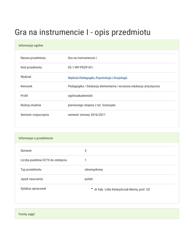 Gra na instrumencie I - opis przedmiotu Informacje ogólne Nazwa przedmiotu Gra na instrumencie I Kod przedmiotu 05.1-WP-PEDP-GI1 Wydział Wydział Pedagogiki, Psychologii i Socjologii Kierunek Pedagogika / Edukacja elementarna i wczesna edukacja artystyczna Profil ogólnoakademicki Rodzaj studiów pierwszego stopnia z tyt. licencjata Semestr rozpoczęcia semestr zimowy 2016/2017 Informacje o przedmiocie Semestr 3 Liczba punktów ECTS do zdobycia 1 Typ przedmiotu obowiązkowy Język nauczania polski Sylabus opracował Formy zajęć dr hab. Lidia Kataryńczuk-Mania, prof. UZ Forma zajęć Konwersatorium Liczba godzin Liczba godzin Liczba godzin w Liczba godzin w Forma w semestrze w tygodniu semestrze tygodniu zaliczenia (stacjonarne) (stacjonarne) (niestacjonarne) (niestacjonarne) 15 1 9 ,6 Zaliczenie na ocenę Cel przedmiotu Zapoznanie studentów z elementarnymi zasadami gry na instrumencie ( pianino, keyboard, flet prosty, dzwonki chromatyczne, instrumenty perkusyjne)j Rozwijanie umiejętności manualnych, wykonawczych. Konstruowanie własnych propozycji instrumentów muzycznych dla dzieci. Rozpoznawanie różnych brzmień instrumentów. Wymagania wstępne Student powinien posiadać podstawową wiedzę z zakresu zasad muzyki, psychologii i pedagogiki elementarnej. Zakres tematyczny Cele, zadania i literatura przedmiotu. Charakterystyka instrumentarium dziecięcego. Poznanie literatury metodycznej z zakresu gry na instrumentach. Sposoby zapisywania i możliwości stosowania efektów perkusyjnych. Poznawanie techniki gry na wybranych instrumentach muzycznych( pianino, instrumenty elektroniczne, flety proste, instrumenty o określonej wysokości: dzwonki ,dzwonki diatoniczne i chromatyczne, ksylofony, metalofony, instrumenty perkusyjne o nieokreślonej wysokości (marakasy, bębenki, kastaniety, tamburyna, clavesy, talerze, pudełka akustyczne, czeczotki itp.). Konstruowanie własnych instrumentów muzycznych, niekonwencjonalnych dla dzieci. Opracowanie akompaniamentu do piosenek, zabaw muzyczno-ruchowych. Improwizowanie na instrumentach muzycznych - zabawy ekspresyjne. Metody kształcenia Metody ekspresyjne, asymilacji wiedzy Efekty kształcenia i metody weryfikacji osiągania efektów kształcenia Opis efektu Symbole Metody weryfikacji Forma zajęć efektów Student ma uporządkowaną, K_W13 Test sprawdzający elementarna wiedzę z zakresu umiejętności gry na kultury artystycznej, teorię instrumentach wybranych koncepcji i metodykę perkusyjnych Konwersatorium pracy instrumentalnej z dziećmi Krytycznie ocenia realizacje K_U09 aktywność w trakcie różnych zadań instrumentalnych zajęć przeznaczonych dla dzieci analiza materiałów Jest przygotowany do aktywnego K_K07 przygotowanie uczestnictwa w grupach, umie autorskiej propozycji realizować zadania skonstruowania instrumentalne, potrafi instrumentu dla dzieci Konwersatorium Konwersatorium skonstruować do-wolny instrument i zagrać Warunki zaliczenia Konwersatoria Zaliczenie z oceną: skonstruowanie własnego instrumentu dla dzieci i wskazanie możliwości jego wykorzystania w praktyce artystycznej. Ocena końcowa Oceną końcową jest ocena z konwersatoriów. Obciążenie pracą Obciążenie pracą Studia Studia niestacjonarne stacjonarne (w godz.) (w godz.) Godziny kontaktowe (udział w zajęciach; konsultacjach; egzaminie, itp.) 15 15 Samodzielna praca studenta (przygotowanie do: zajęć, kolokwium, 10 10 Łącznie 25 25 Punkty ECTS Studia Studia niestacjonarne egzaminu; studiowanie literatury przygotowanie: pracy pisemnej, projektu, prezentacji, raportu, wystąpienia; itp.) stacjonarne Zajęcia z udziałem nauczyciela akademickiego 1 1 Zajęcia bez udziału nauczyciela akademickiego 0 0 Łącznie 1 1 Literatura podstawowa 1. Bissinger- Ćwierz U., Animacja muzyczna w pedagogice zabawy, Lublin 1999. 2. Komorowska M., Orkiestra dziecięca, cz. 1-2, Warszawa 1978. 3. Lenartowska J., Nowak-Lenartowska A., Dziecięca orkiestra perkusyjna, Kraków 1966. 4. Stasińska K., Instrumentarium Orffa w szkole, Warszawa 1986. 5. Materiał dydaktyczny zawarty w pakietach edukacyjnych. Literatura uzupełniająca 1. Chotomska W., Wszystko gra, Warszawa 1988. 2. Enzinger G.,. Raszke B., red., Świat muzyki – świat zabawy, Nowy Sącz 2006. 3. Kataryńczuk-Mania L., Wychowawcze aspekty zajęć umuzykalniających w przedszkolu, Zielona Góra 2009. 4. Krakowski J., Kto tak pięknie gra, Łódź 1986. 5. Smoczyńska-Nachtman U., Muzyka dla dzieci, Warszawa 1992. 6. Szałek A., Koncepcja Carla Orffa w kreatywnych działaniach muzycznych ucznia, „Wychowanie Muzyczne w Szkole” 2008, 3. 7. Twardowska A., Próchniewicz W., Wesołe instrumenty, Warszawa 2006. 8. Wieman M., Przedszkolna orkiestra, „Wychowanie w Przedszkolu” 1982, 7-8. 9. Wierzbicka M., Zabawy muzyczne w klasach O-III, Toruń 2006. Uwagi Zmodyfikowane przez mgr Klaudia Żernik (ostatnia modyfikacja: 28-07-2016 12:03)