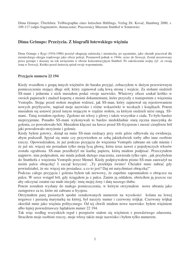 Dima Grinups: Überleben. Teilbiographie eines lettischen Häftlings, Verlag Dr. Kova , Hamburg 2000, s. 109-117 (odpis fragmentów, tłumaczenie: Pracownicy Muzeum Stutthof w Sztutowie) Dima Grinups: Prze ycia. Z biografii łotewskiego wi nia Dima Grinups z Rygi (1916-1980) prze ył okupacj radzieck i niemieck . po egzaminie, jako chemik pracował dla niemieckiego okr gu rz dowego jako oficer policji. Postanowił jednak w 1944r. uciec do Szwecji. Został aresztowany przez gestapo i skazany na rok uwi zienia w obozie koncentracyjnym Stutthof. Po zako czeniu wojny ył ze swoj on w Szwecji. Krótko przed mierci spisał swoje wspomnienia. Przyj cie numeru 22 194 Kiedy wszedłem z grup innych wi niów do baraku przyj , zobaczyłem w du ym przewiewnym pomieszczeniu stoj cy długi stół, który zajmował cał lew stron i wej cie. Za stołami siedzieli SS-mani i jednemu z nich musiałem poda swoje nazwisko. Wła ciwy oficer szukał krótko w swoich papierach i znalazł kopert z moimi dokumentami, które przyszły z transportem z wi zienia Ventsplis. Stoj c przed stołem mogłem widzie , jak SS-man, który zajmował si rejestrowaniem nowych przybyszów, napisał moje nazwisko i ró ne wskazówki w teczkach i ksi kach. Potem musiałem si ustawi przed innym stoj cym w rz dzie stołem, za którym siedzieli ni si rang SSmani.. Tutaj zostałem ogolony. Zgolono mi włosy z głowy i tak e wszystkie z ciała. To było bardzo nieprzyjemne. Ponadto SS-mani wykonywali to bardzo niedokładnie star r czna maszynk do golenia, co powodowało ból. Musiałem kl cze na ławce przed SS-fryzjerem i znosi cierpliwie ból jaki powodowało strzy enie i golenie. Kiedy byłem gotowy, skin ł na mnie SS-man siedz cy przy stole gdzie odbywała si ewidencja, abym podszedł. Spytał si mnie czy przywiozłem ze sob jakiekolwiek torby albo inne osobiste rzeczy. Opowiedziałem, e ju podczas przyj cia do wi zienia Ventspils zabrano mi całe mienie i e ju nic wi cej nie posiadam tylko moj łys głow , która teraz nawet z pojedynczych włosów została ograbiona. SS-man przedło ył mi kartk papieru, któr miałem podpisa . Przeczytałem najpierw, nim podpisałem, nie miała jednak du ego znaczenia, zawierała tylko opis , jak przybyłem do Stutthofu z wi zienia Ventspils przez Memel. Kiedy podpisywałem pismo SS-man zauwa ył na moim palcu obr czk ! I zacz ł krzycze : „Ty przekl ta winio! Chciałe mnie nabra gdy powiedziałe , e nic wi cej nie posiadasz, a co to jest? Daj mi natychmiast obr czk !” Podczas całego przyj cia i golenia byłem tak nerwowy, e zupełnie zapomniałem o obr czce na palcu. W serce wst pił ból, gdy ci gałem ja z palca. Zanim j oddałem, obróciłem j jeszcze raz aby odczyta ostatni raz małe inicjały: imi mojej ony i dat naszego lubu. Potem zostałem wysłany do małego pomieszczenia, w którym otrzymałem nowe ubrania jako zast pstwo za to, które mi zabrano u fryzjera. Otrzymałem par pasiastych spodni oznakowanych numerem na wysoko ci kolana na lewej nogawce i pasiast marynark na której, był naszyty numer i czerwony trójk t. Czerwony trójk t okre lał mnie jako wi nia politycznego. Od tej chwili miałem nowe nazwisko: byłem wi niem albo lepiej powiedziawszy łajdakiem numer 22 194. Tak wi c według wszystkich reguł i przepisów stałem si wi niem z prawdziwego zdarzenia. Straciłem moje osobiste rzeczy, moje włosy tak e moje nazwisko i byłem tylko numerem. 1 W drodze powrotnej do mojego obozu zauwa yłem, e mam kłopoty z bieganiem. Dano mi razem z nowym ubraniem par drewniaków i pasek materiału, który miał zast powa rajstopy.... Tymi paskami materiału trzeba było owin stopy zanim si ubierze drewniaki, ale wszystko odbyło si tak szybko, e nie miałem czasu na to by zmierzy inne rozmiary. Otrzymałem tak e pasiast czapk , której jednak zapomniałem, co wyra nie odczułem, gdy stałem na zewn trz na zimnym listopadowym wietrze i marzłem w wie o ogolon głow . Kiedy wróciłem do baraku, zameldowałem si blokowemu, który zarejestrował w swojej ksi ce mój nowy numer i jeszcze kilka znaków, których nie mogłem wyja ni . Zobaczyłem, e chłopak zmarły na wodogłowie le ał ci gle przed barakiem w tym samym miejscu. Zbadałem go, czy zmarł czy jeszcze by mo e yje. Ku mojemu du emu zdziwieniu zauwa yłem, e chłopak jeszcze oddycha. Postanowiłem zawoła Denisch`a i Zbyszka i zaproponowa im, eby my spróbowali z nastaniem ciemno ci , wnie chłopaka z powrotem do baraku. Cho nie byli my lekarzami i nie mieli my poj cia jak si post puje w tym przypadku, uznałem, e tylko tyle dobrego mo emy zrobi aby ponownie przywróci do ycia tego chłopaka. Jednak musiało si to odby bez wiedzy blokowego. Zanim poszedłem do baraku, poinformowałem blokowego, e od jutra nale do dziesi cioosobowej grupy roboczej zło onej z dziesi ciu m czyzn. My lałem, e spytam blokowego co to za praca, ale schowałem si w po piechu, bo lepiej nie wiedzie , jakie uczucia mogłoby obudzi takie pytanie w mordercy. Mógłby mnie le zrozumie i zezło ci si , i w tym przypadku mógłbym dosta gorsz prac albo dałby mi mniejsz racj ywno ci albo ukara w jeszcze jaki inny sposób. Zrezygnowałem z pytania i zadowolony miałem nadziej , e moja nowa praca nie oka e si ci sza, ni mógłbym jej podoła . Codzienne ycie i mier w baraku nr 6 Gdy wszedłem do baraku, przy wej ciu le ał z rozci gni tymi ramionami stary yd, który nie ył. Id c do pryczy spytałem si , dlaczego Denisch nie zabrał zmarłego do krematorium. Dowiedziałem si pó niej, e wol blokowego było, aby zwłoki pole ały tam kilka dni , jako ostrze enie dla wszystkich wi niów, eby nie wchodzili blokowemu w drog , w przeciwnym razie mogłoby si to sko czy tak jak w przypadku tego starego yda. Uwa ałem to za bardzo makabryczne, eby le ce zwłoki mie za przypomnienie traktowania ludzi przez nazistów. Co si tyczyło tego ledwie ywego chłopca, Denisch, Zbyszek i ja uzgodnili my, e po zapadni ciu ciemno ci spróbujemy chłopaka zanie z powrotem do bar