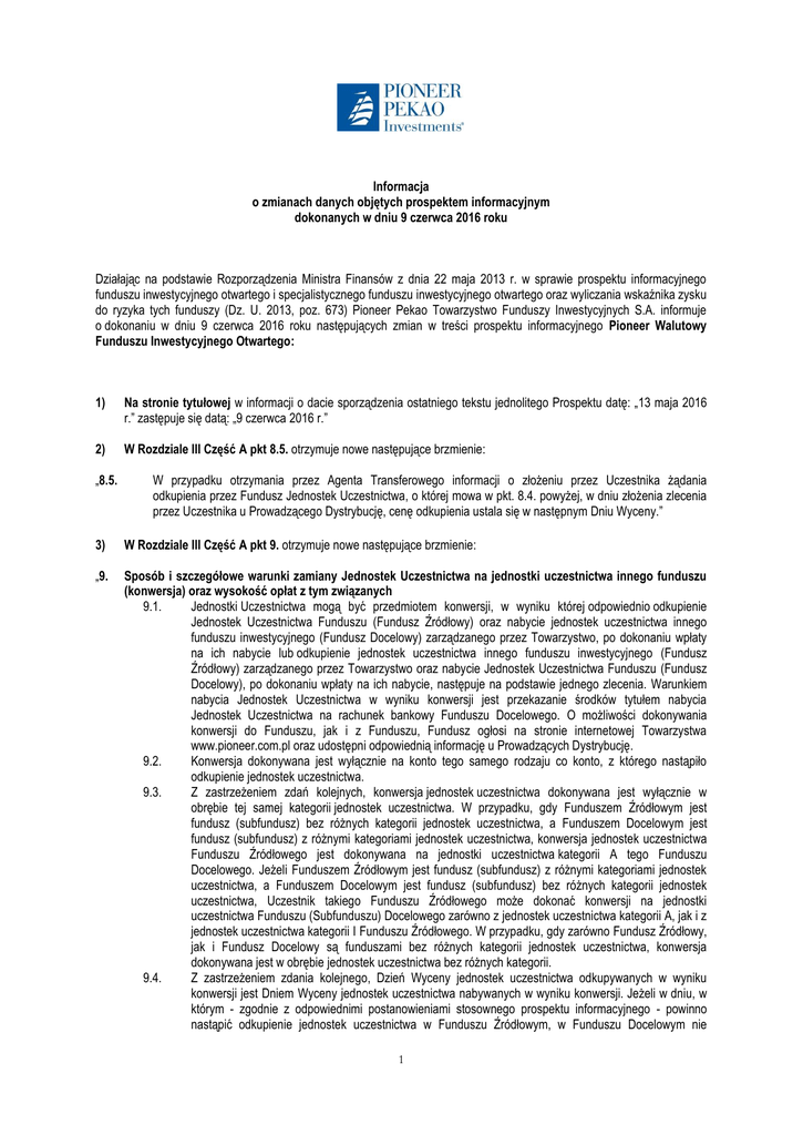 Informacja o zmianach danych objętych prospektem informacyjnym dokonanych w dniu 9 czerwca 2016 roku Działając na podstawie Rozporządzenia Ministra Finansów z dnia 22 maja 2013 r. w sprawie prospektu informacyjnego funduszu inwestycyjnego otwartego i specjalistycznego funduszu inwestycyjnego otwartego oraz wyliczania wskaźnika zysku do ryzyka tych funduszy (Dz. U. 2013, poz. 673) Pioneer Pekao Towarzystwo Funduszy Inwestycyjnych S.A. informuje o dokonaniu w dniu 9 czerwca 2016 roku następujących zmian w treści prospektu informacyjnego Pioneer Walutowy Funduszu Inwestycyjnego Otwartego: 1) Na stronie tytułowej w informacji o dacie sporządzenia ostatniego tekstu jednolitego Prospektu datę: „13 maja 2016 r.” zastępuje się datą: „9 czerwca 2016 r.” 2) W Rozdziale III Część A pkt 8.5. otrzymuje nowe następujące brzmienie: „8.5. W przypadku otrzymania przez Agenta Transferowego informacji o złożeniu przez Uczestnika żądania odkupienia przez Fundusz Jednostek Uczestnictwa, o której mowa w pkt. 8.4. powyżej, w dniu złożenia zlecenia przez Uczestnika u Prowadzącego Dystrybucję, cenę odkupienia ustala się w następnym Dniu Wyceny.” 3) W Rozdziale III Część A pkt 9. otrzymuje nowe następujące brzmienie: „9. Sposób i szczegółowe warunki zamiany Jednostek Uczestnictwa na jednostki uczestnictwa innego funduszu (konwersja) oraz wysokość opłat z tym związanych 9.1. Jednostki Uczestnictwa mogą być przedmiotem konwersji, w wyniku której odpowiednio odkupienie Jednostek Uczestnictwa Funduszu (Fundusz Źródłowy) oraz nabycie jednostek uczestnictwa innego funduszu inwestycyjnego (Fundusz Docelowy) zarządzanego przez Towarzystwo, po dokonaniu wpłaty na ich nabycie lub odkupienie jednostek uczestnictwa innego funduszu inwestycyjnego (Fundusz Źródłowy) zarządzanego przez Towarzystwo oraz nabycie Jednostek Uczestnictwa Funduszu (Fundusz Docelowy), po dokonaniu wpłaty na ich nabycie, następuje na podstawie jednego zlecenia. Warunkiem nabycia Jednostek Uczestnictwa w wyniku konwersji jest przekazanie środków tytułem nabycia Jednostek Uczestnictwa na rachunek bankowy Funduszu Docelowego. O możliwości dokonywania konwersji do Funduszu, jak i z Funduszu, Fundusz ogłosi na stronie internetowej Towarzystwa www.pioneer.com.pl oraz udostępni odpowiednią informację u Prowadzących Dystrybucję. 9.2. Konwersja dokonywana jest wyłącznie na konto tego samego rodzaju co konto, z którego nastąpiło odkupienie jednostek uczestnictwa. 9.3. Z zastrzeżeniem zdań kolejnych, konwersja jednostek uczestnictwa dokonywana jest wyłącznie w obrębie tej samej kategorii jednostek uczestnictwa. W przypadku, gdy Funduszem Źródłowym jest fundusz (subfundusz) bez różnych kategorii jednostek uczestnictwa, a Funduszem Docelowym jest fundusz (subfundusz) z różnymi kategoriami jednostek uczestnictwa, konwersja jednostek uczestnictwa Funduszu Źródłowego jest dokonywana na jednostki uczestnictwa kategorii A tego Funduszu Docelowego. Jeżeli Funduszem Źródłowym jest fundusz (subfundusz) z różnymi kategoriami jednostek uczestnictwa, a Funduszem Docelowym jest fundusz (subfundusz) bez różnych kategorii jednostek uczestnictwa, Uczestnik takiego Funduszu Źródłowego może dokonać konwersji na jednostki uczestnictwa Funduszu (Subfunduszu) Docelowego zarówno z jednostek uczestnictwa kategorii A, jak i z jednostek uczestnictwa kategorii I Funduszu Źródłowego. W przypadku, gdy zarówno Fundusz Źródłowy, jak i Fundusz Docelowy są funduszami bez różnych kategorii jednostek uczestnictwa, konwersja dokonywana jest w obrębie jednostek uczestnictwa bez różnych kategorii. 9.4. Z zastrzeżeniem zdania kolejnego, Dzień Wyceny jednostek uczestnictwa odkupywanych w wyniku konwersji jest Dniem Wyceny jednostek uczestnictwa nabywanych w wyniku konwersji. Jeżeli w dniu, w którym - zgodnie z odpowiednimi postanowieniami stosownego prospektu informacyjnego - powinno nastąpić odkupienie jednostek uczestnictwa w Funduszu Źródłowym, w Funduszu Docelowym nie 1 9.5. 9.6. 9.7. 9.8. 9.9. 9.10. 4) przeprowadza się wyceny, Dniem Wyceny odkupywanych i nabywanych jednostek uczestnictwa jest najbliższy po tym dniu dzień, który jest Dniem Wyceny zarówno w Funduszu Źródłowym, jak i w Funduszu Docelowym. Z zastrzeżeniem zdania kolejnego, odkupienie Jednostek Uczestnictwa w wyniku konwersji w Subfunduszach wydzielonych w ramach Funduszu dokonywane jest w drugim Dniu Wyceny następującym po Dniu Wyceny, w którym Agent Transferowy otrzymał informację o złożeniu przez Uczestnika u Prowadzącego Dystrybucję stosownego zlecenia. W przypadku jeżeli nie jest możliwe przekazanie środków na rachunek bankowy Funduszu Docelowego, konwersja dokonywana jest w pierwszym Dniu Wyceny, w którym wykonanie zlecenia (przekazanie środków na rachunek bankowy Funduszu Docelowego) stanie się możliwe. Do ustalenia Dnia Wyceny Jednostek Uczestnictwa będących przedmiotem konwersji mają zastosowanie zasady ustalania Dnia Wyceny konwersji Jednostek Uczestnictwa obowiązujące w Subfunduszu Źródłowym. Z zastrzeżeniem postanowień pkt. 9.5., do odkupywania jednostek uczestnictwa Funduszu Źródłowego stosuje się, odpowiednio, właściwe postanowienia prospektu informacyjnego tego Funduszu Źródłowego dotyczące odkupywania jednostek uczestnictwa, a do nabywania jednostek uczestnictwa danego Funduszu Docelowego stosuje się, odpowiednio, właściwe postanowienia prospektu informacyjnego tego Funduszu Docelowego dotyczące nabywania jednostek uczestnictwa. Okres pomiędzy złożeniem zlecenia konwersji Jednostek Uczestnictwa a Dniem Wyceny, w którym ustalana jest cena konwersji Jednostek Uczestnictwa, nie będzie dłuższy niż siedem dni. Warunkiem realizacji zlecenia konwersji Jednostek Uczestnictwa w powyższym terminie jest złożenie zlecenia zgodnie z zasadami wskazanymi w Statucie i Prospekcie Informacyjnym Funduszu. Termin, o którym mowa w zdaniu pop